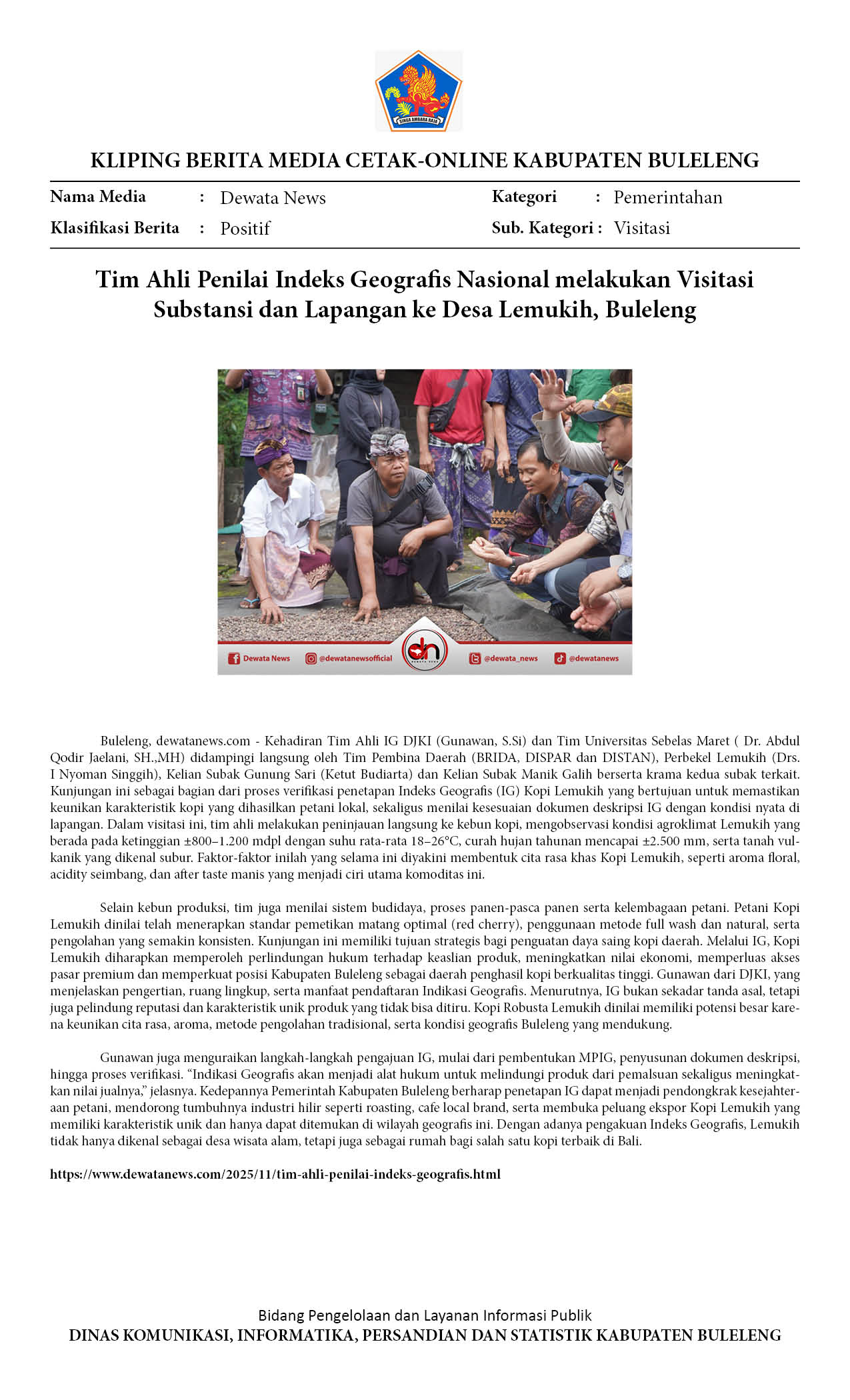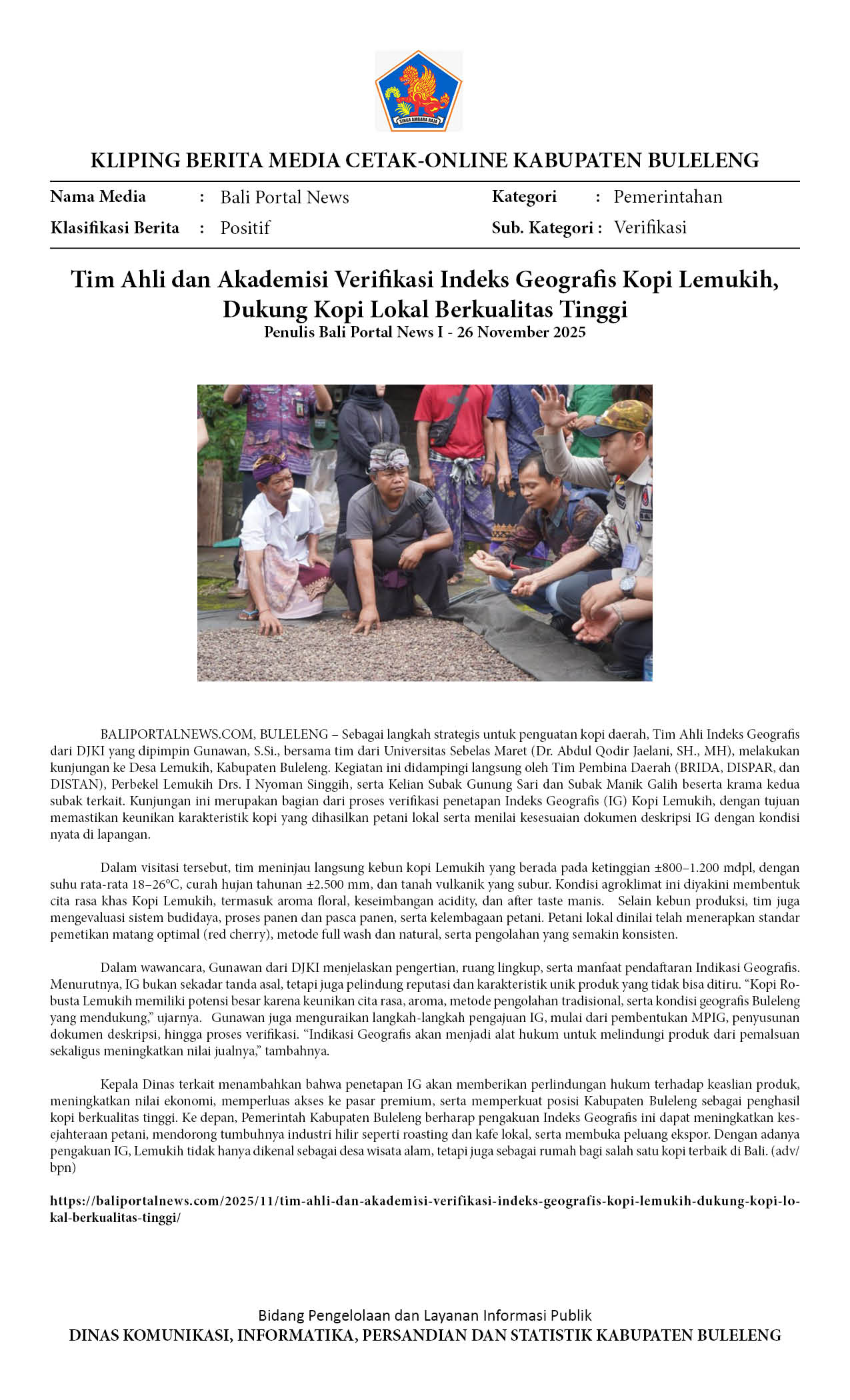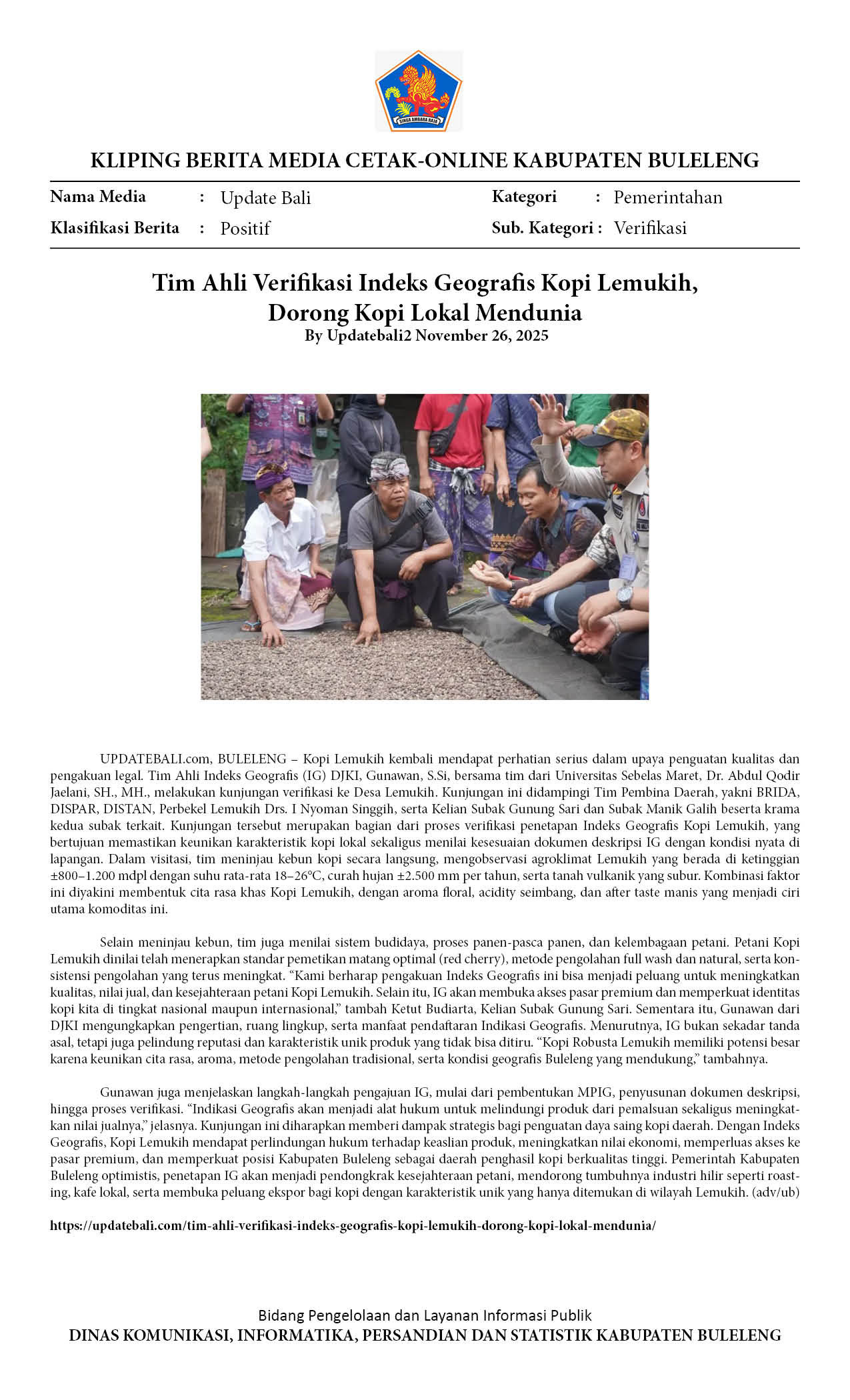 TIM AHLI VERIFIKASI INDEKS GEOGRAFIS KOPI LEMUKIH, DORONG KOPI LOKAL MENDUNIA