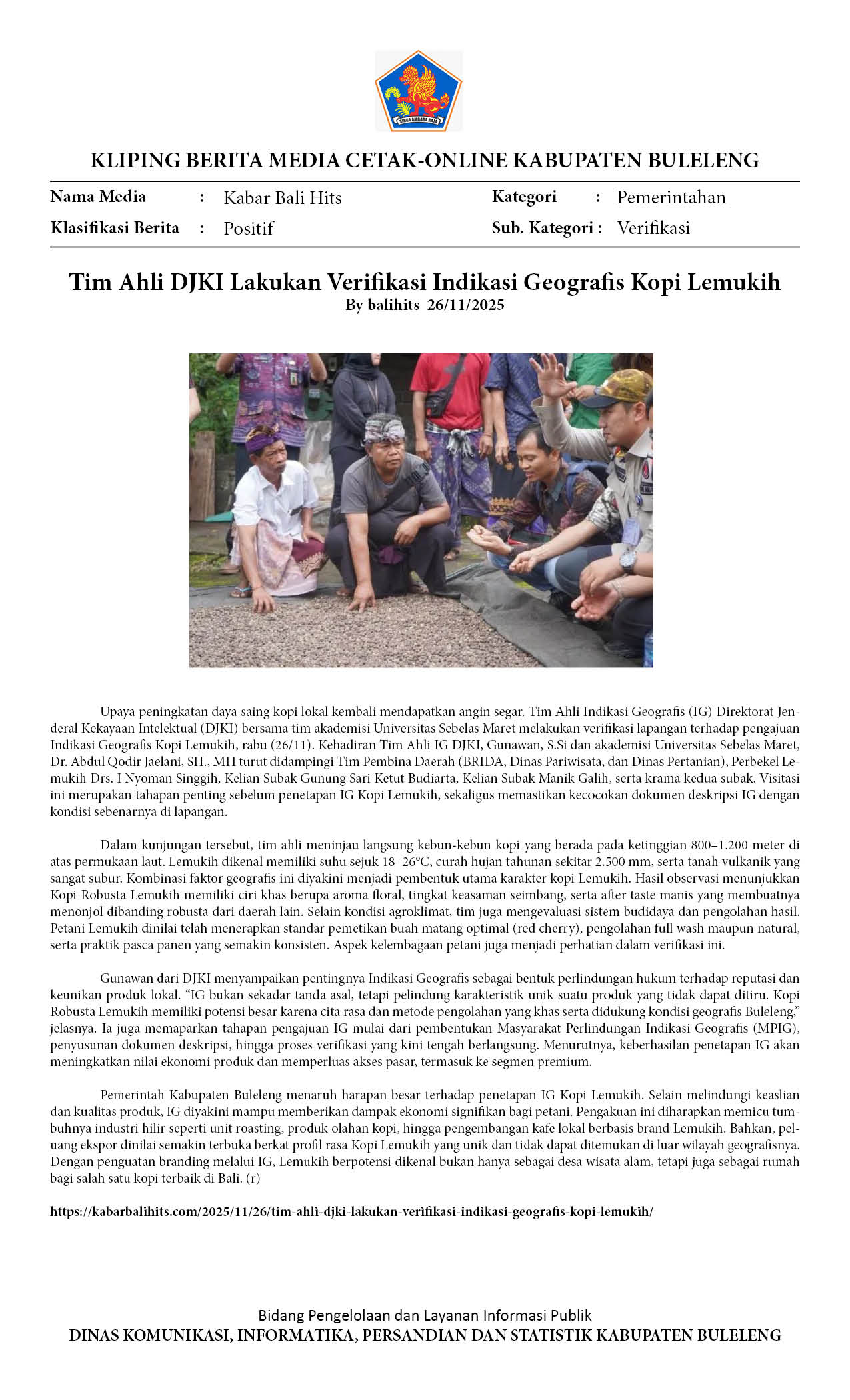 TIM AHLI DJKI LAKUKAN VERIFIKASI INDIKASI GEOGRAFIS KOPI LEMUKIH