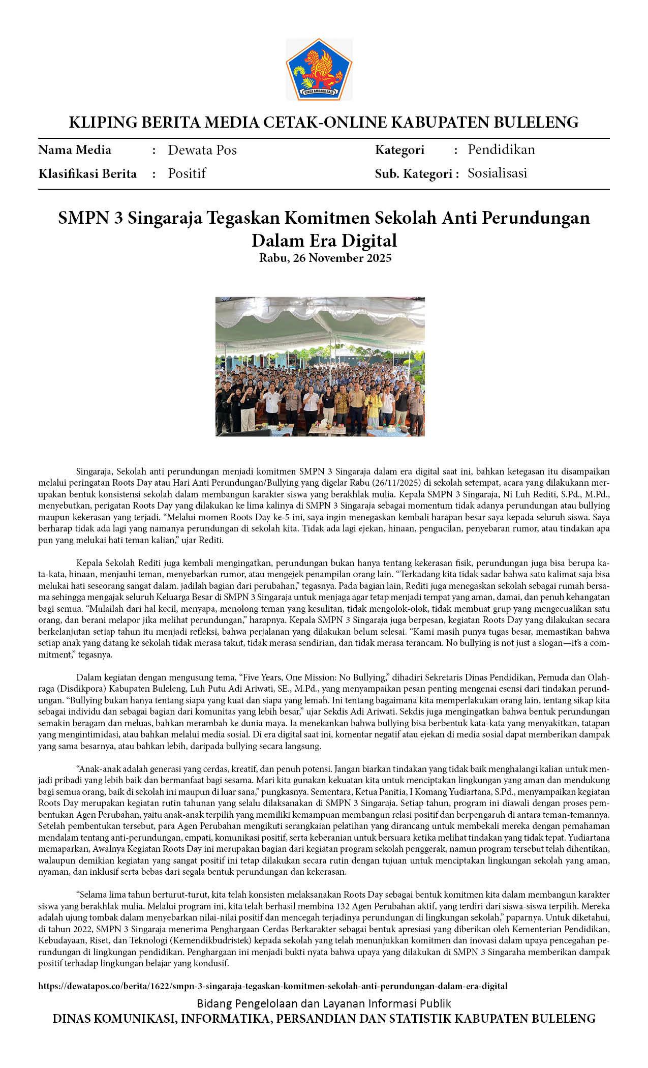 SMPN 3 SINGARAJA TEGASKAN KOMITMEN SEKOLAH ANTI PERUNDUNGAN DALAM ERA DIGITAL