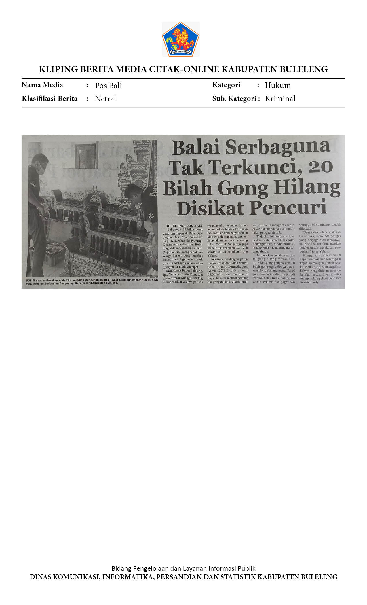 BALI SERBAGUNA TAK TERKUNCI, 20 BILAH GONG HILANG DISIKAT PENCURI