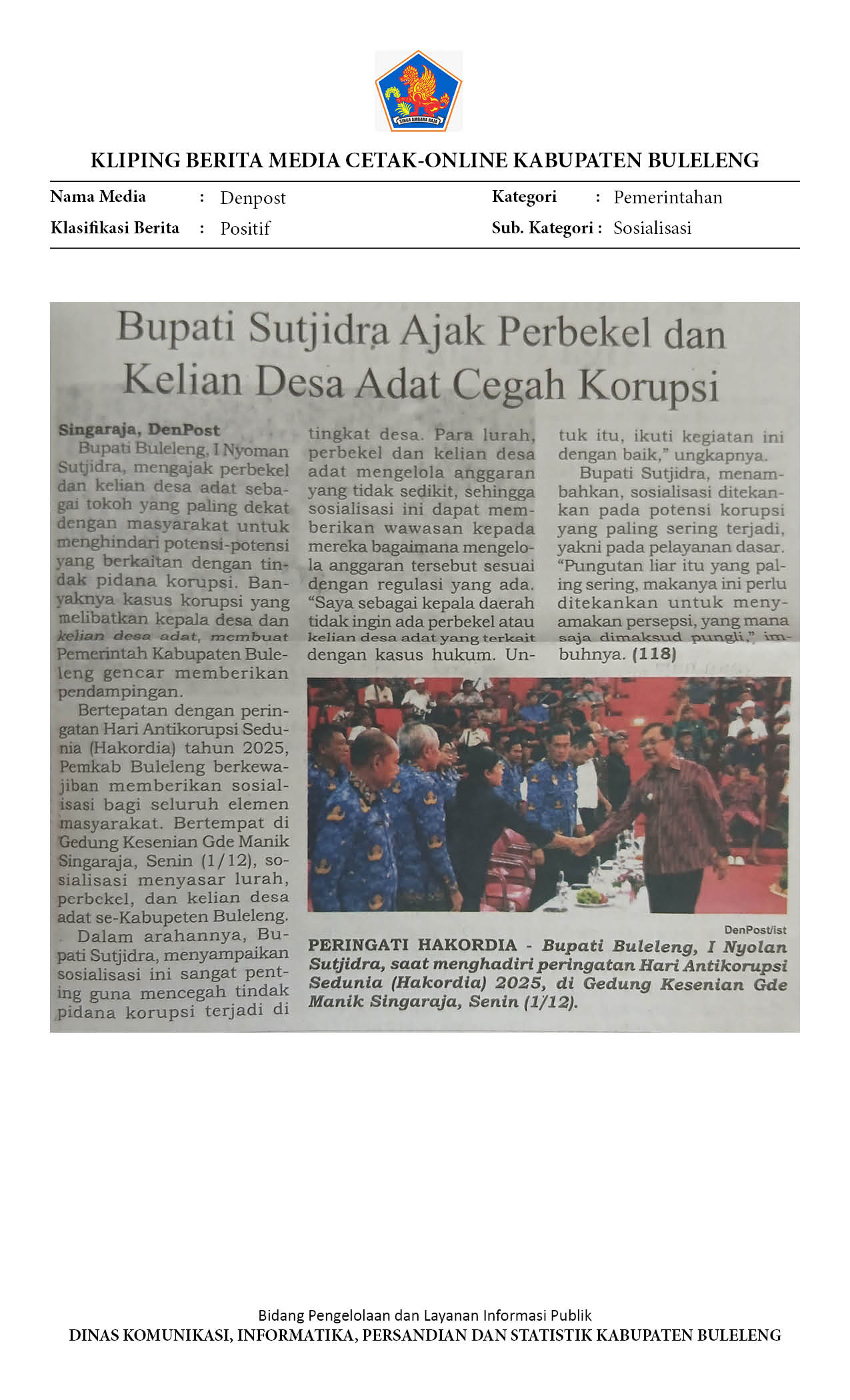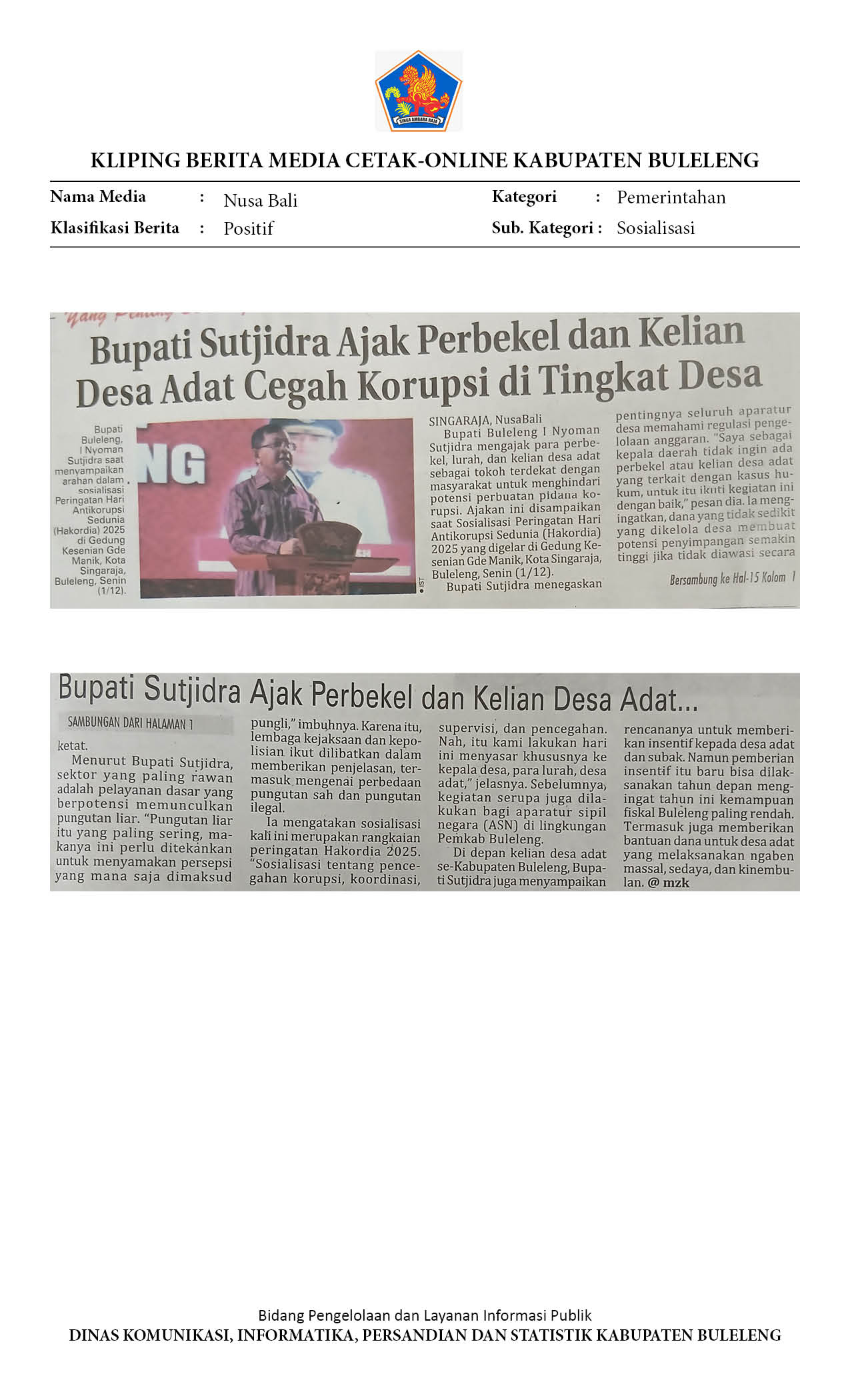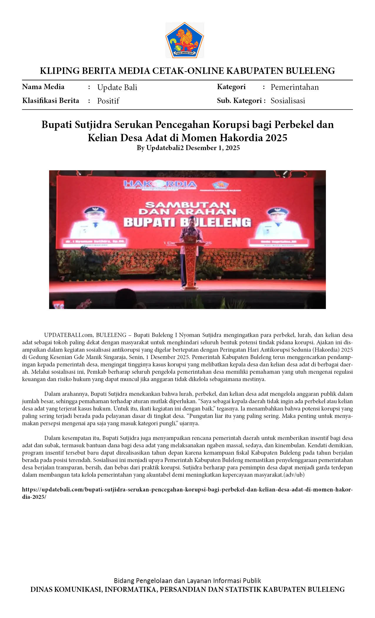 BUPATI SUTJIDRA SERUKAN PENCEGAHAN KORUPSI BAGI PERBEKEL DAN KELIAN DESA ADAT DI MOMEN HAKORDIA 2025