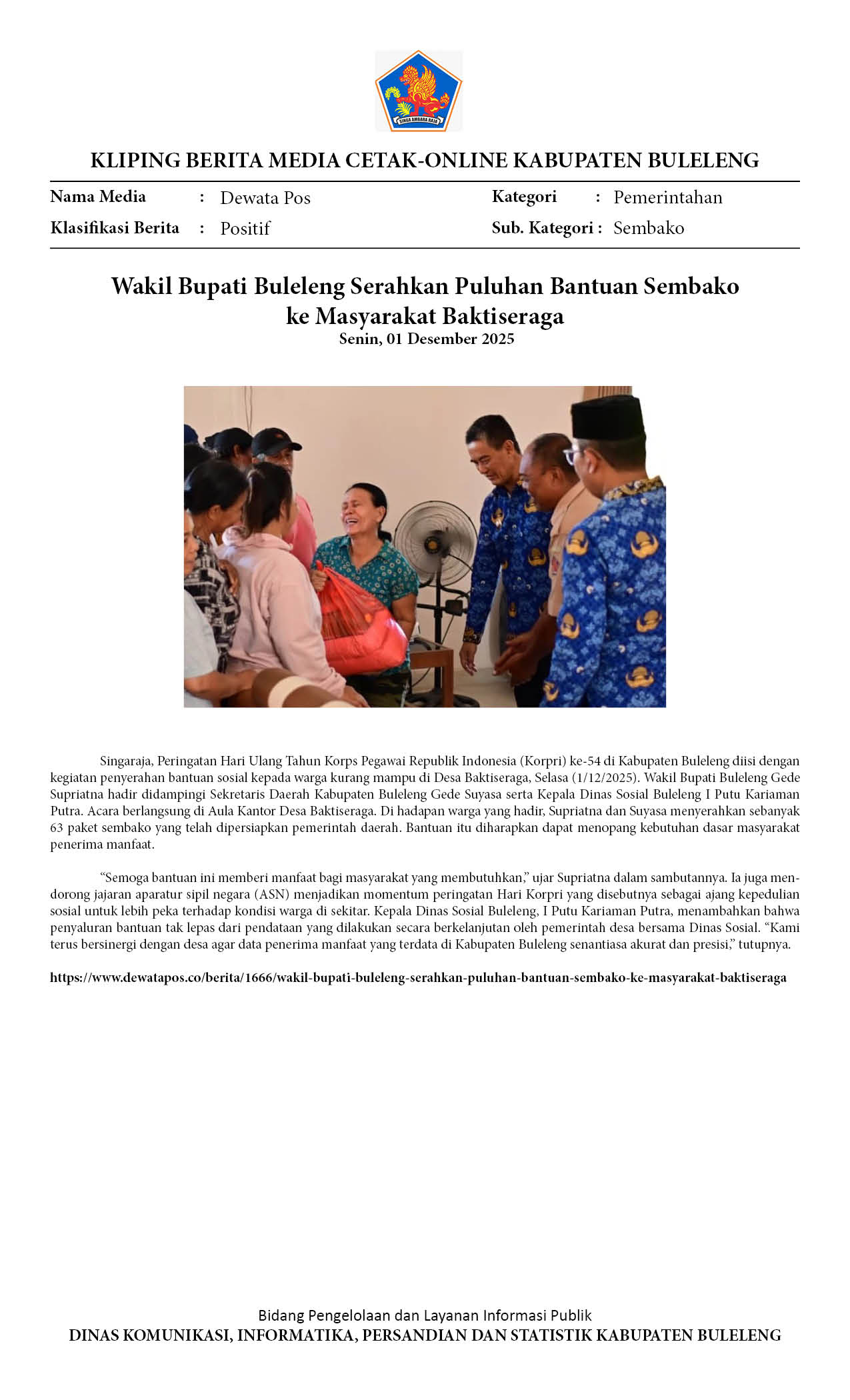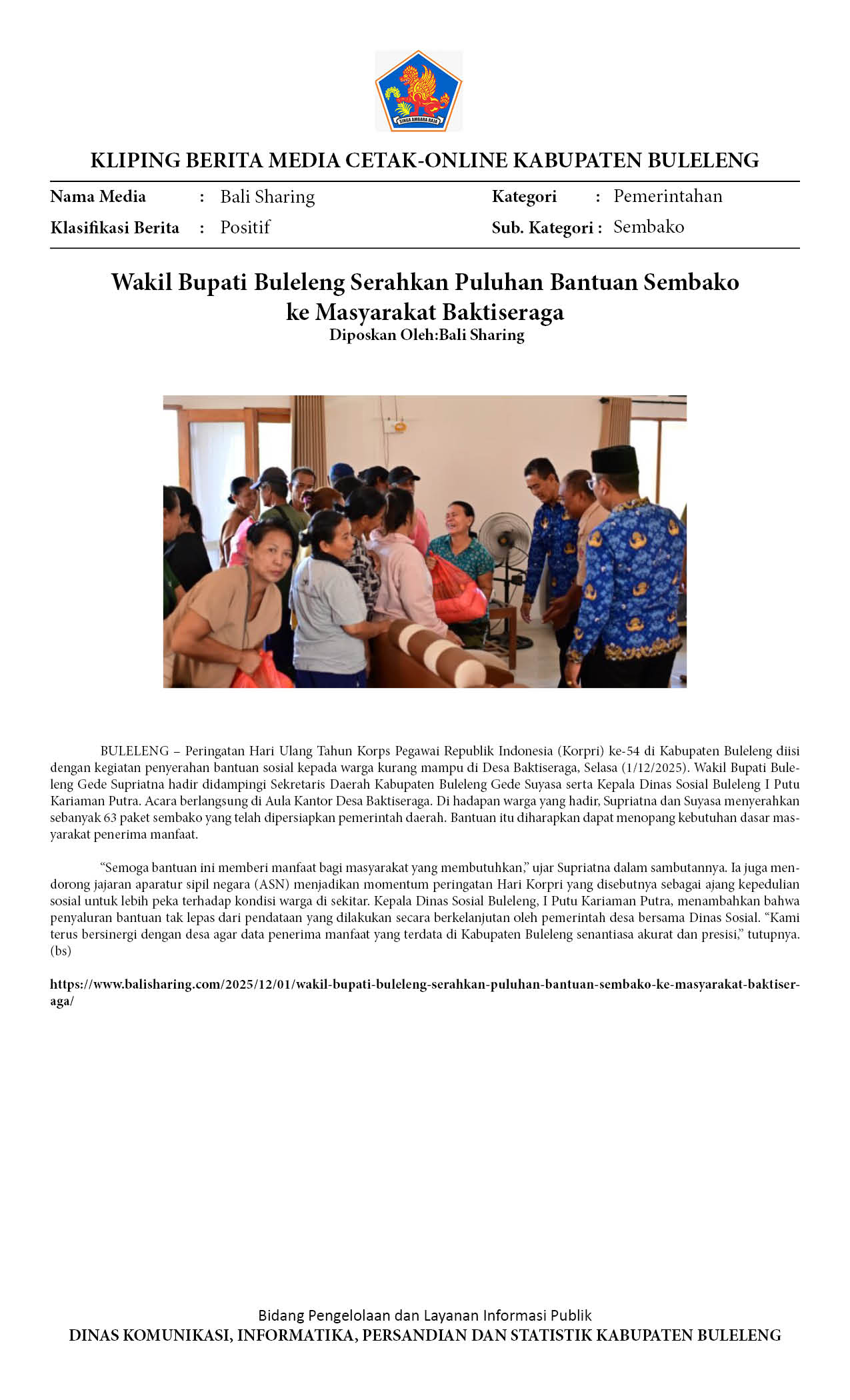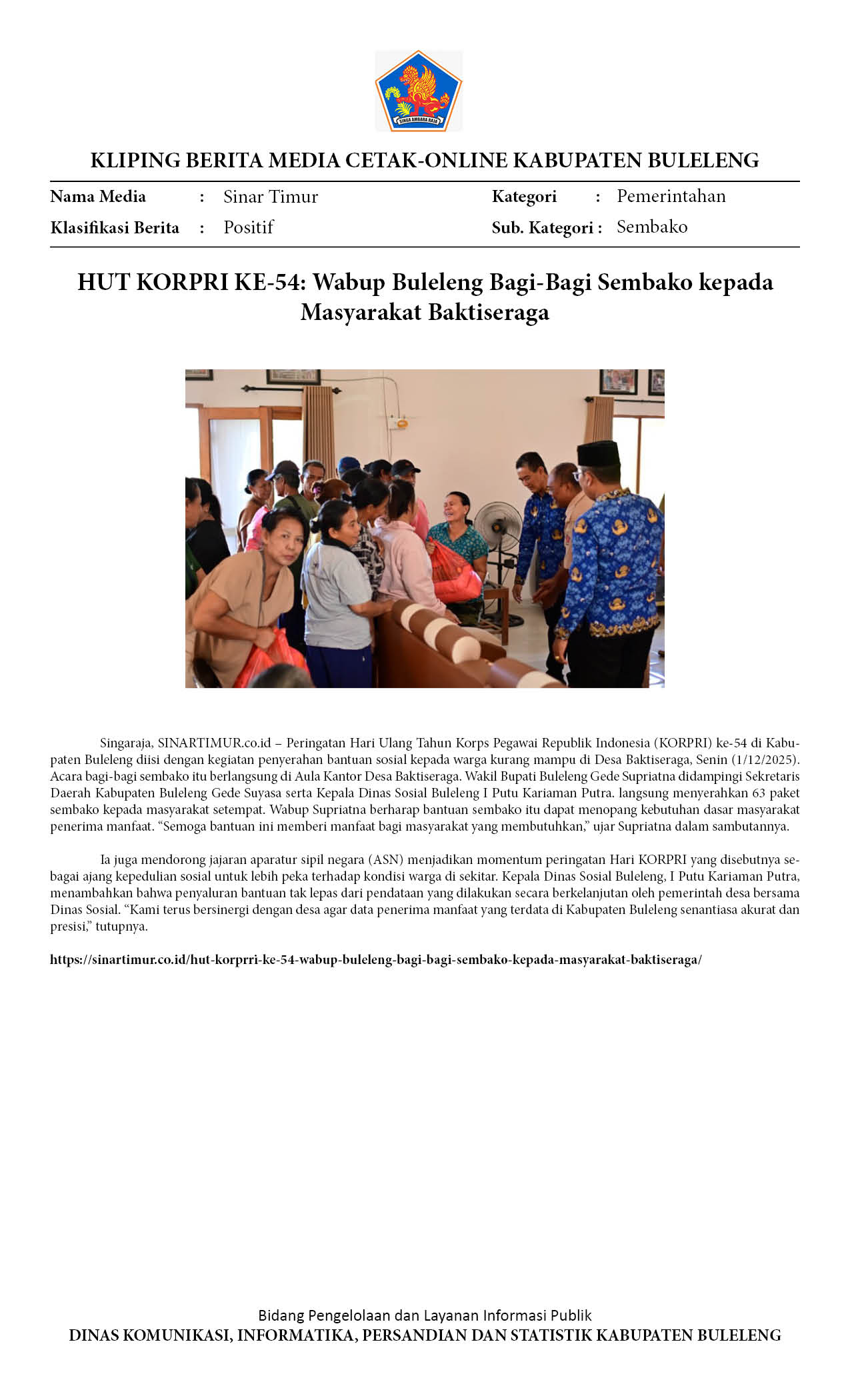HUT KORPRI KE-54: WABUP BULELENG BAGI-BAGI SEMBAKO KEPADA MASYARAKAT BAKTISERAGA