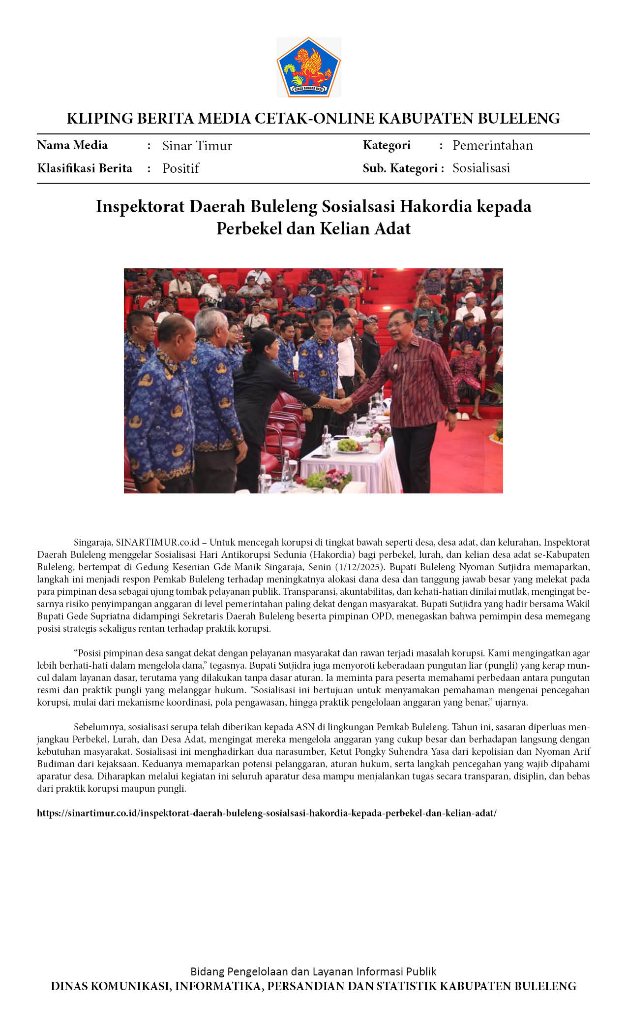 INSPEKTORAT DAERAH BULELENG SOSIALSASI HAKORDIA KEPADA PERBEKEL DAN KELIAN ADAT
