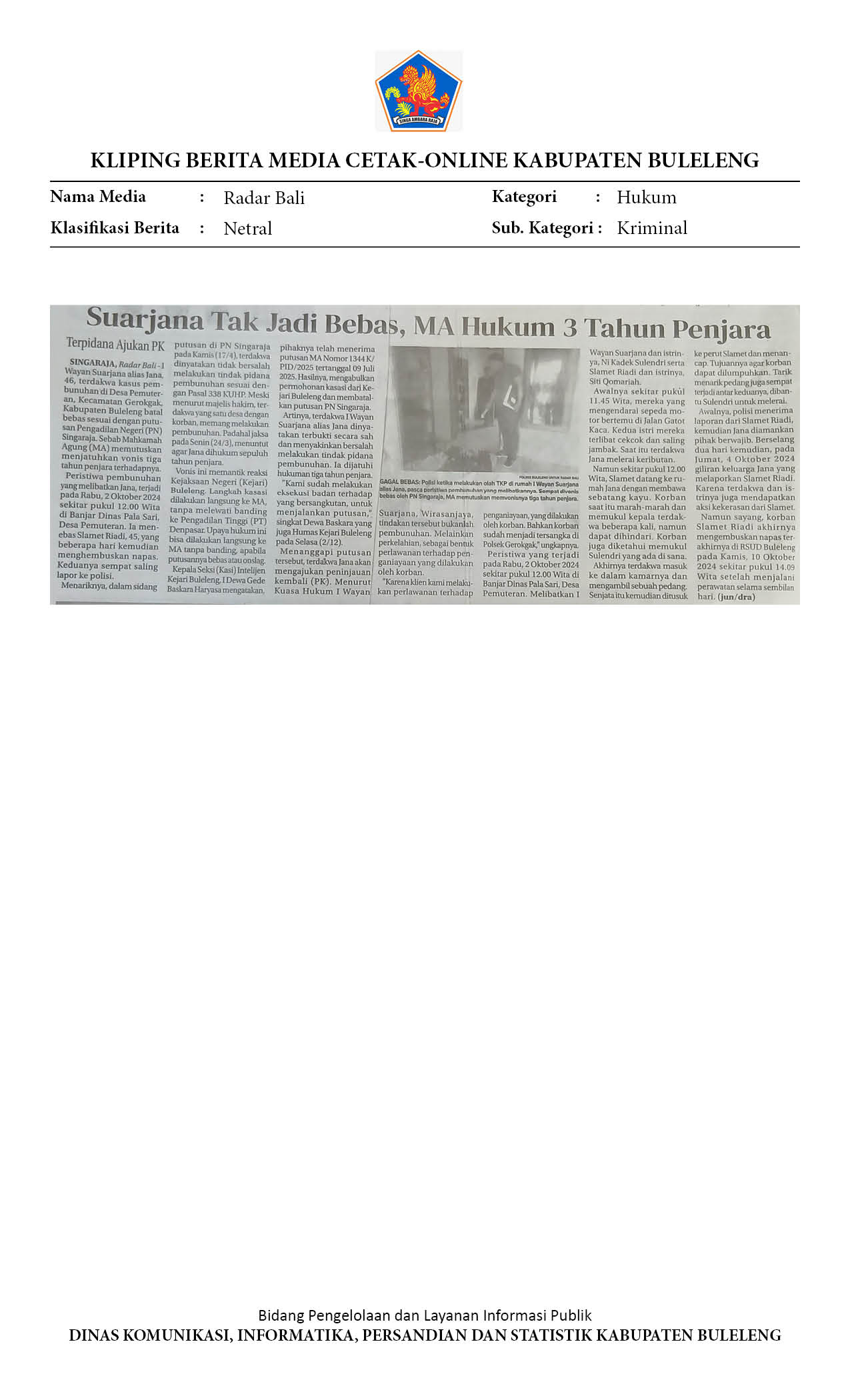SUARJANA TAK JADI BEBAS, MA HUKUM 3 TAHUN PENJARA