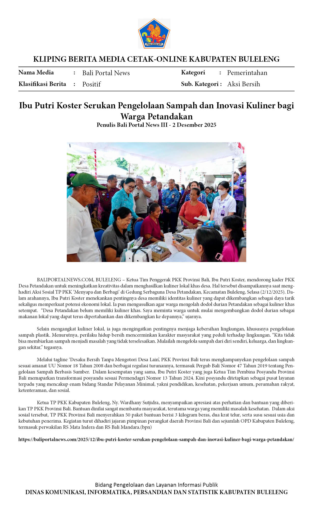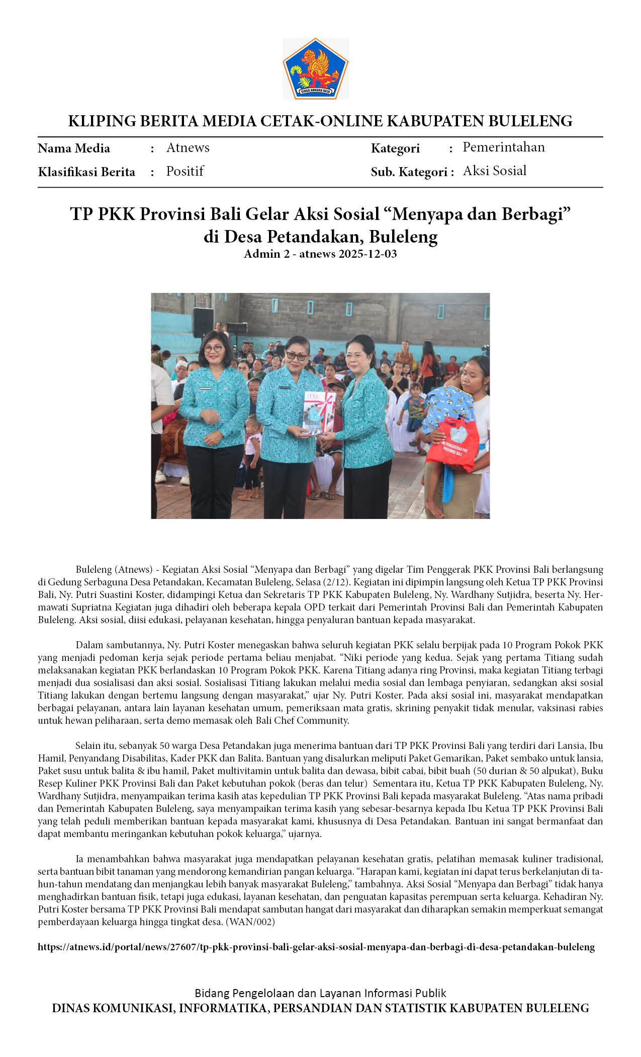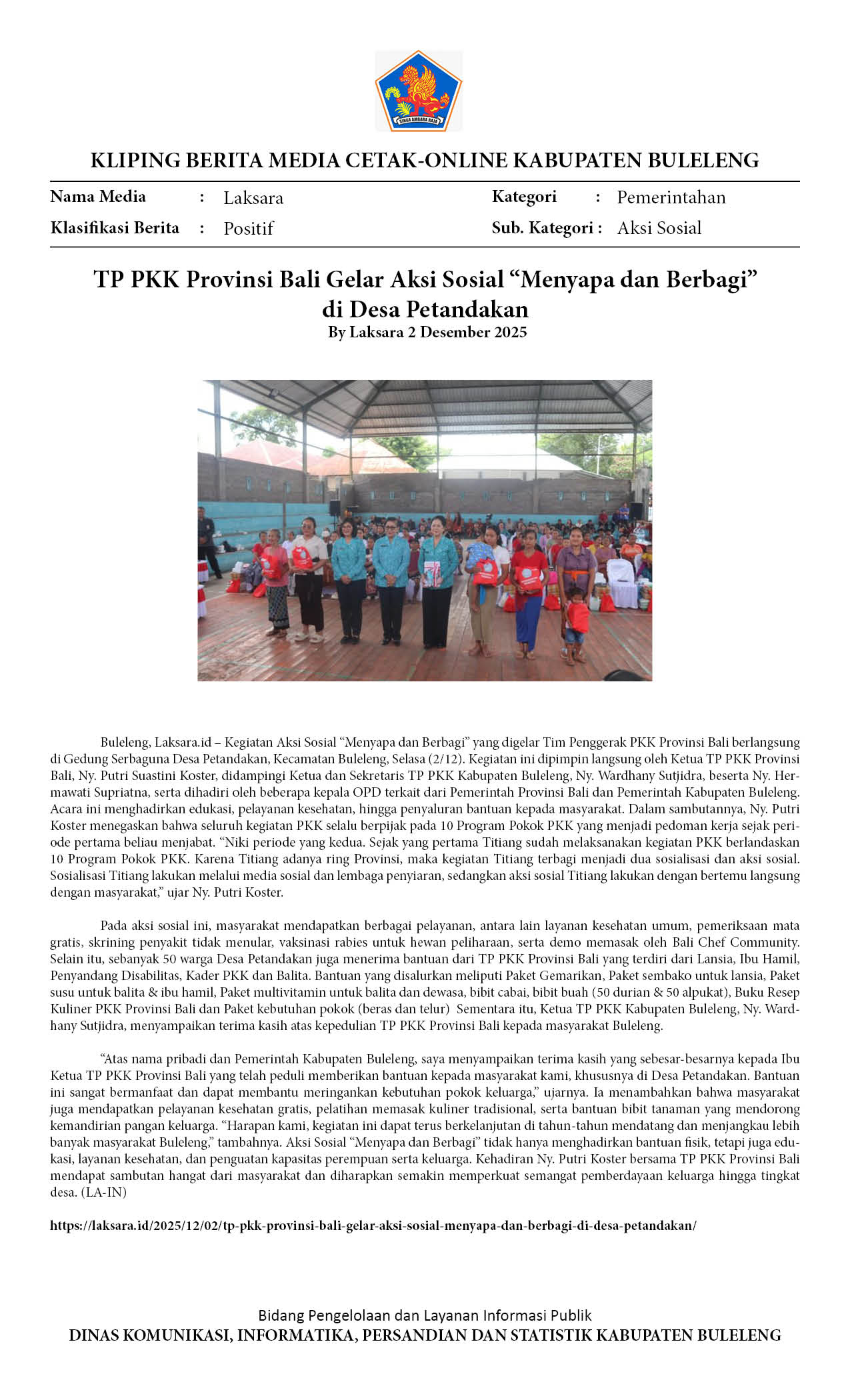 TP PKK PROVINSI BALI GELAR AKSI SOSIAL “MENYAPA DAN BERBAGI” DI DESA PETANDAKAN, BULELENG