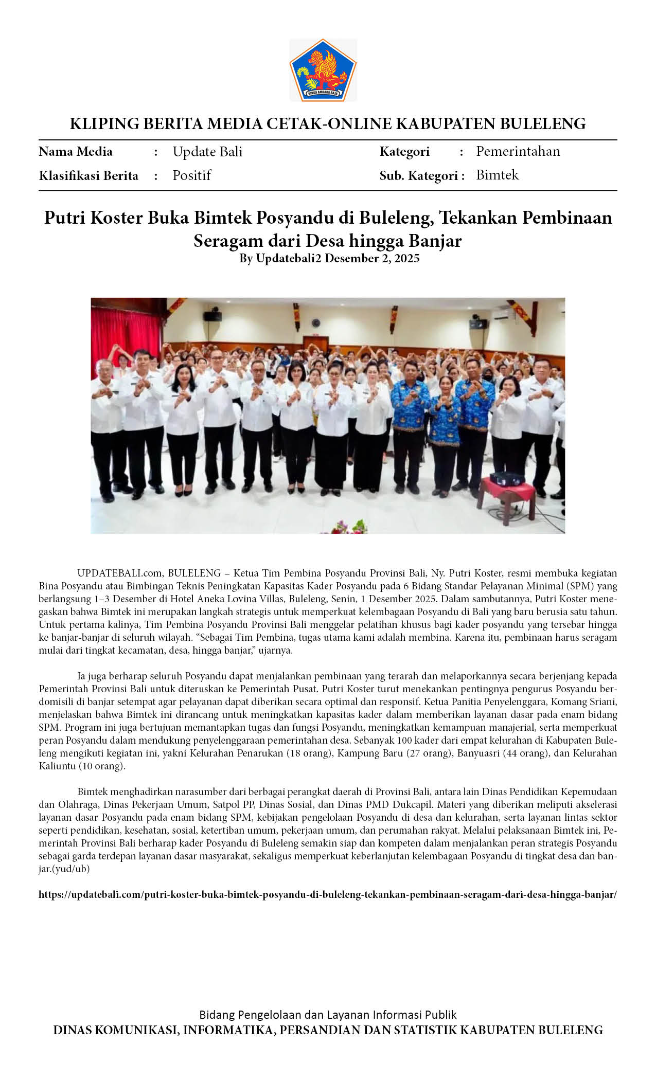 PUTRI KOSTER BUKA BIMTEK POSYANDU DI BULELENG, TEKANKAN PEMBINAAN SERAGAM DARI DESA HINGGA BANJAR