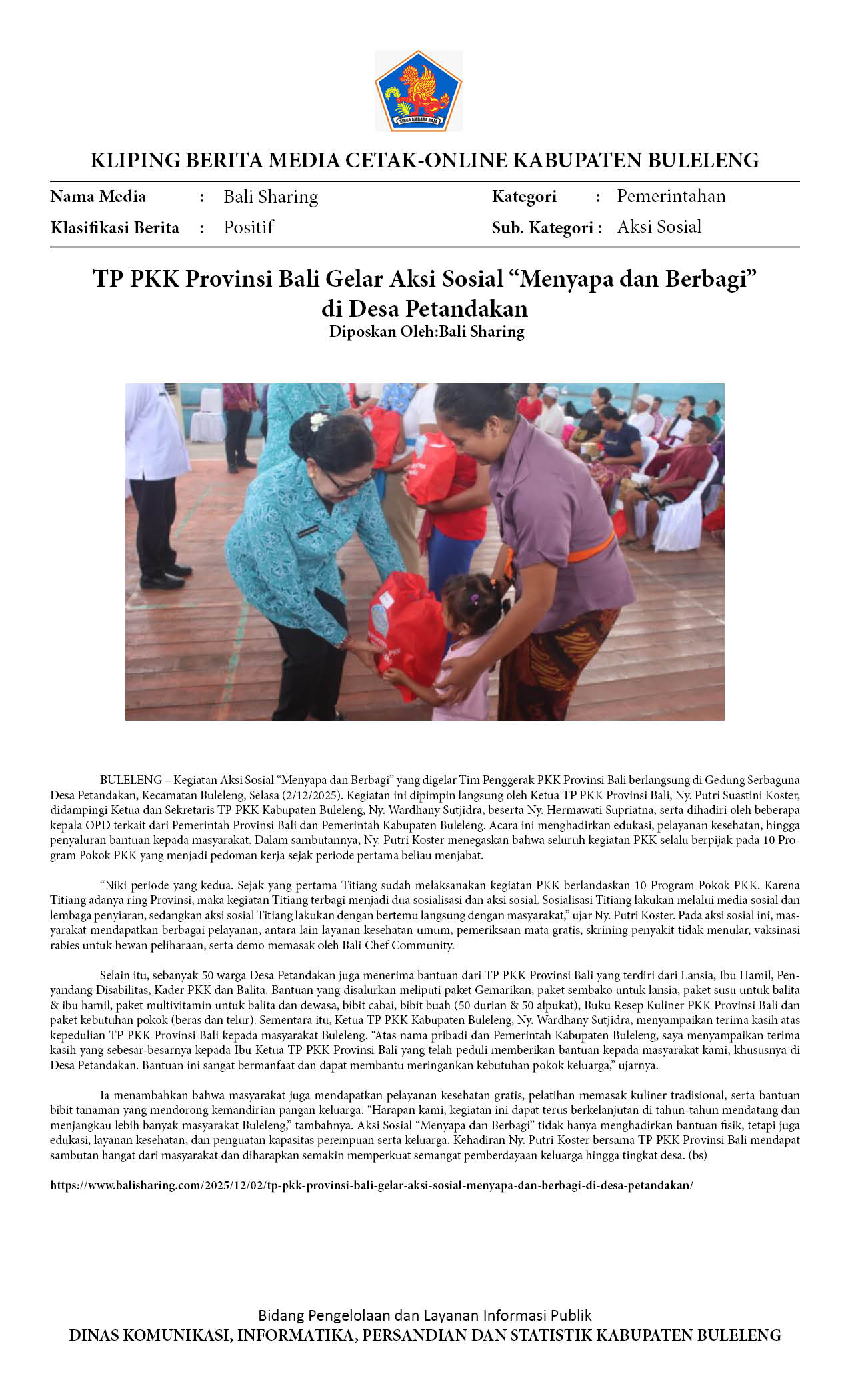 TP PKK PROVINSI BALI GELAR AKSI SOSIAL “MENYAPA DAN BERBAGI” DI DESA PETANDAKAN
