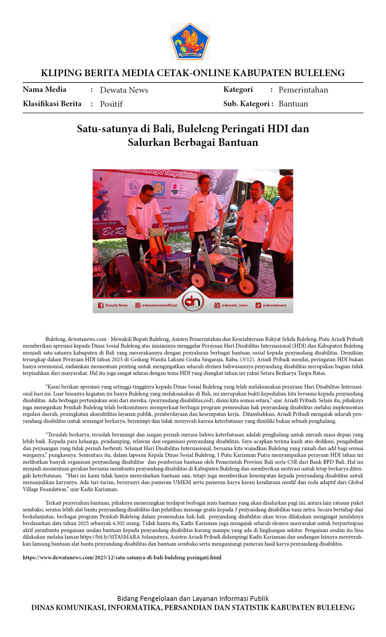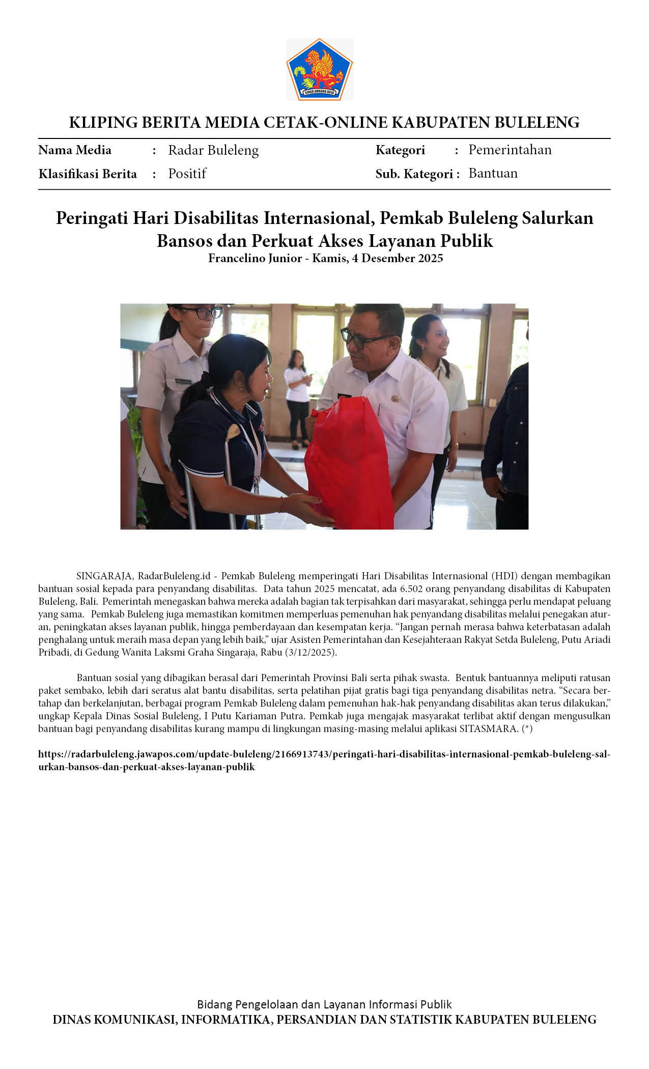 PERINGATI HARI DISABILITAS INTERNASIONAL, PEMKAB BULELENG SALURKAN BANSOS DAN PERKUAT AKSES LAYANAN PUBLIK