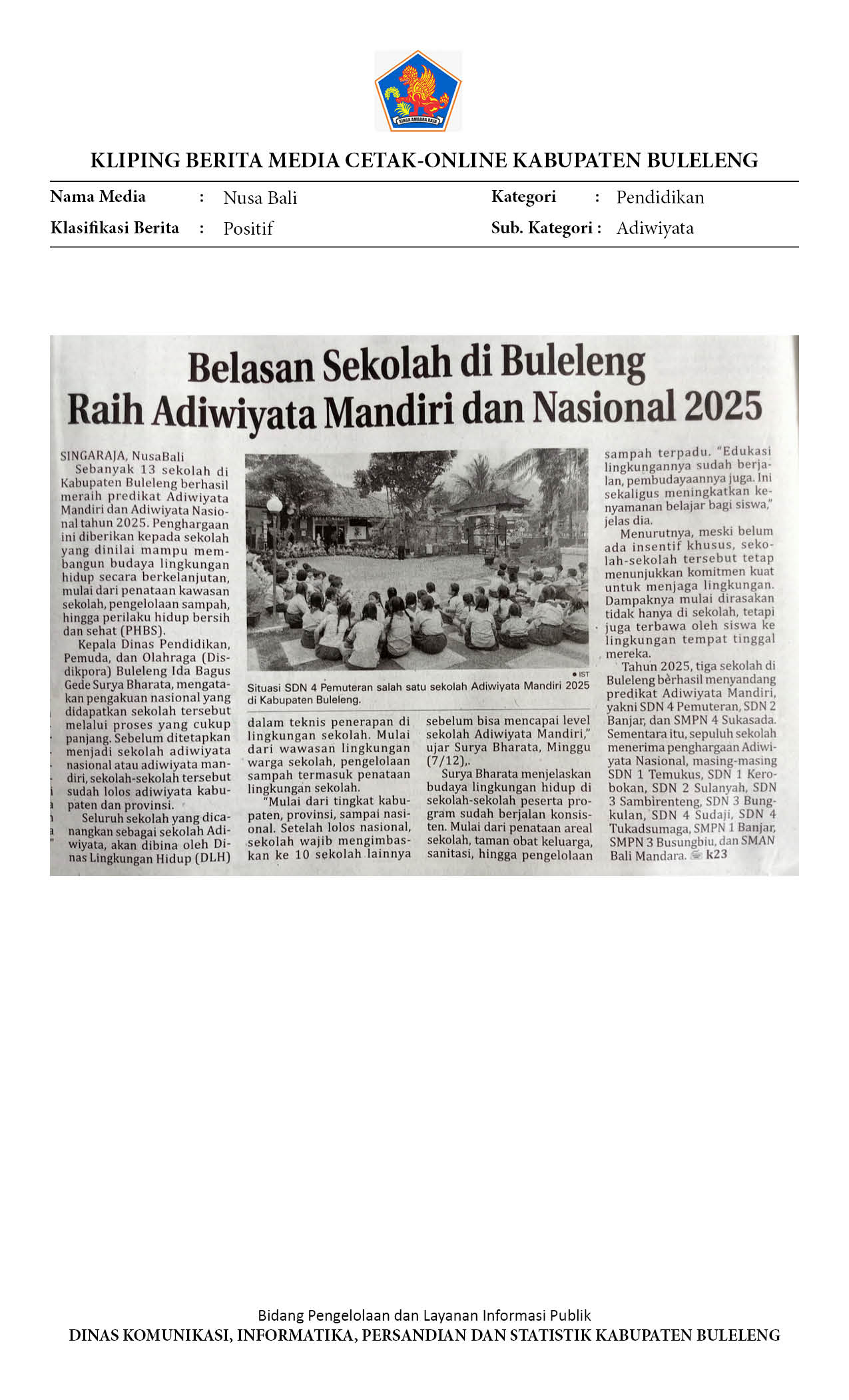 BELASAN SEKOLAH DI BULELENG RAIH ADIEIYATA MANDIRI DAN NASIONAL 2025