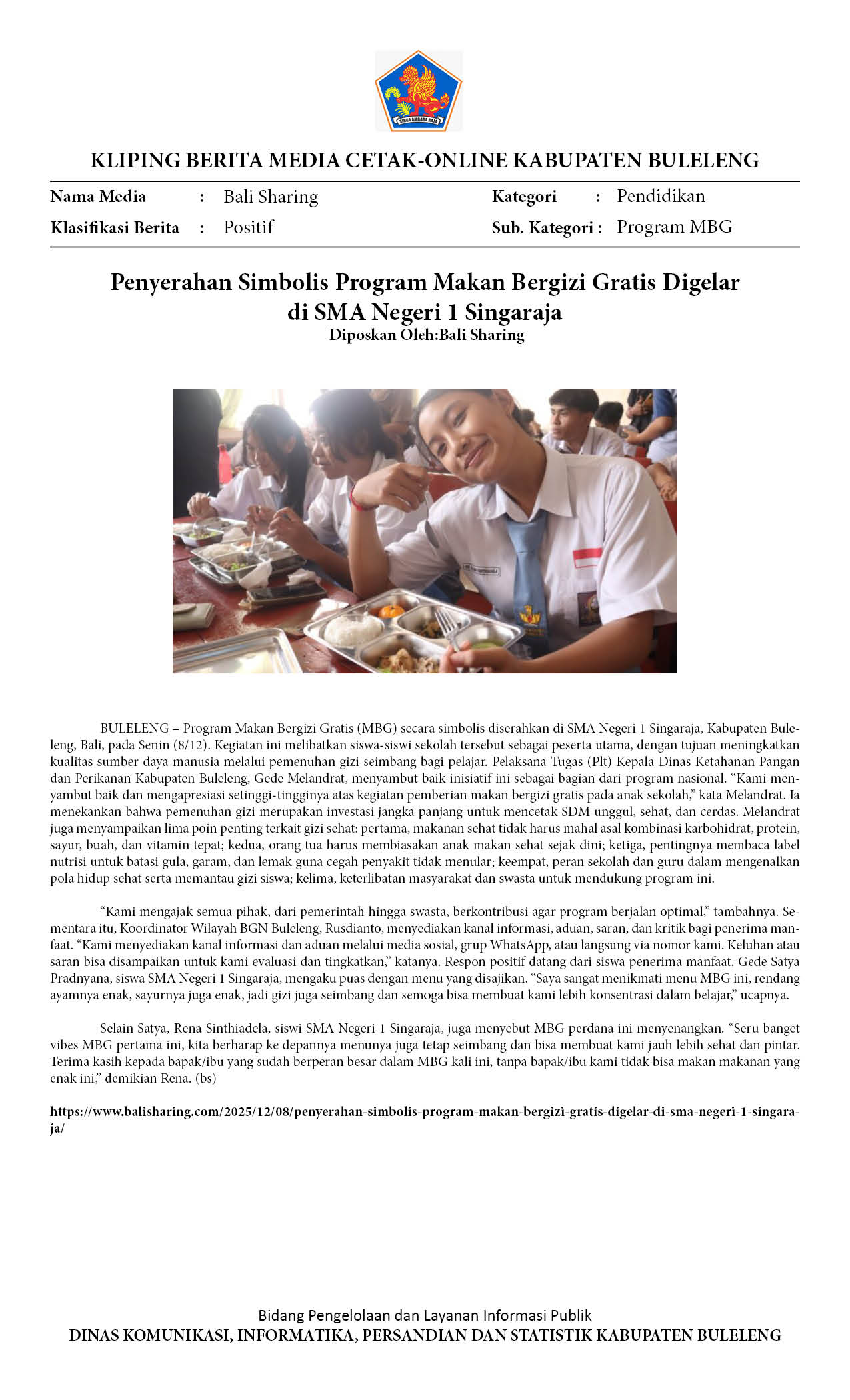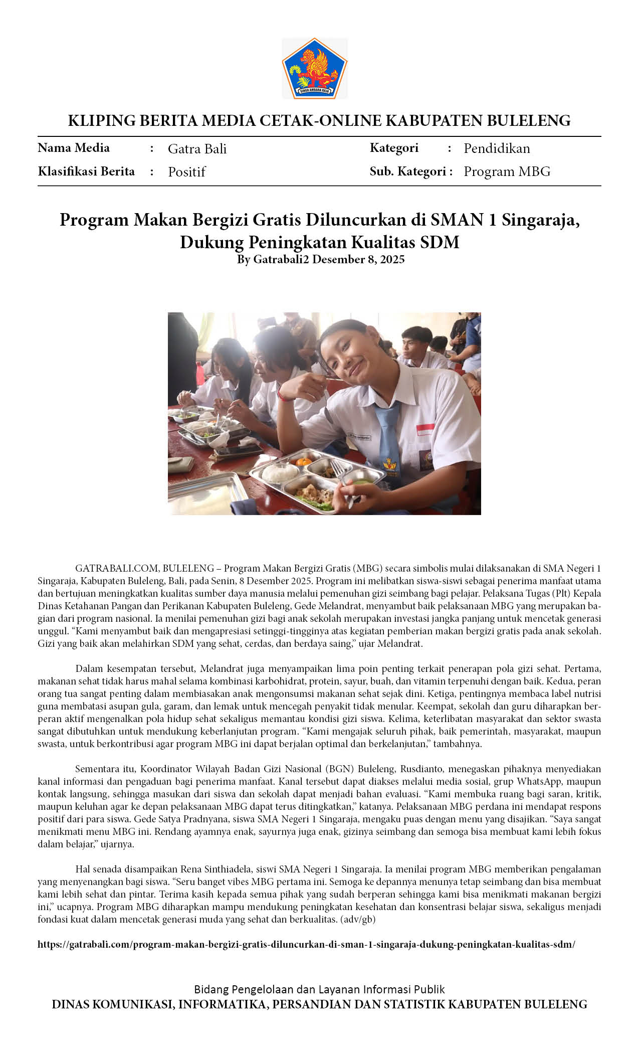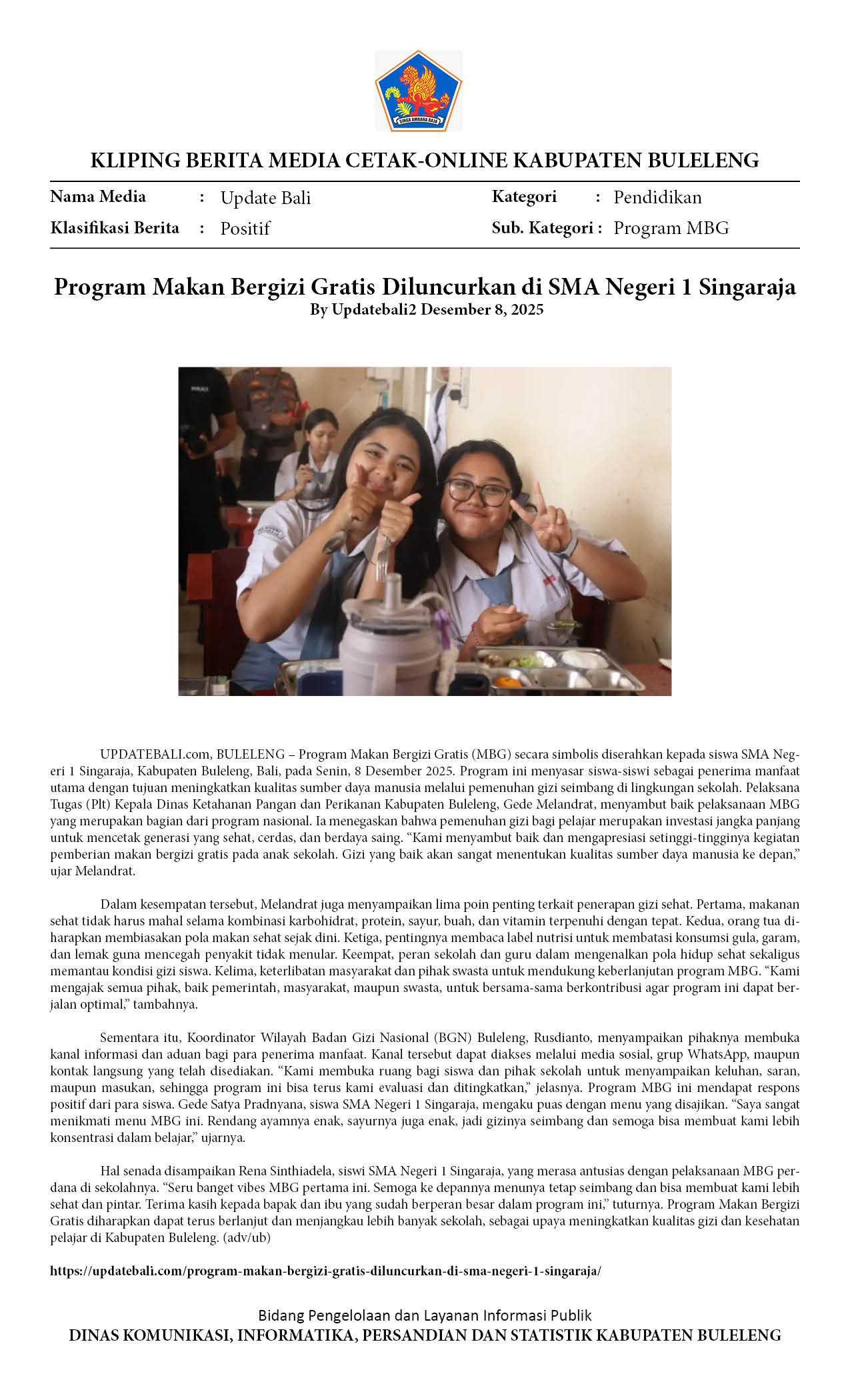 PROGRAM MAKAN BERGIZI GRATIS DILUNCURKAN DI SMAN 1 SINGARAJA, DUKUNG PENINGKATAN KUALITAS SDM