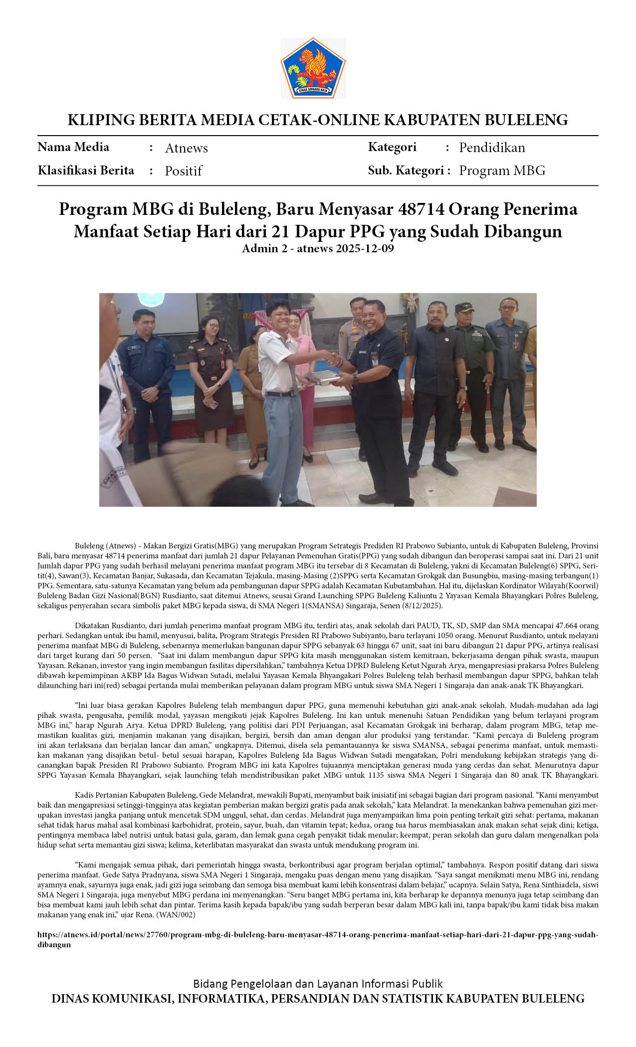 PROGRAM MBG DI BULELENG, BARU MENYASAR 48714 ORANG PENERIMA MANFAAT SETIAP HARI DARI 21 DAPUR PPG YANG SUDAH DIBANGUN