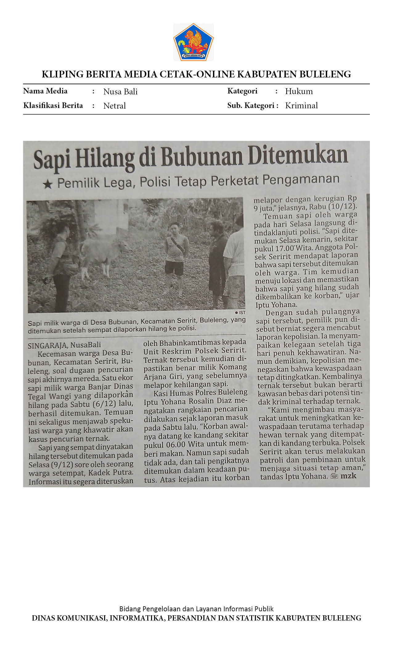 SAPI HILANG DI BUBUNAN DITEMUKAN