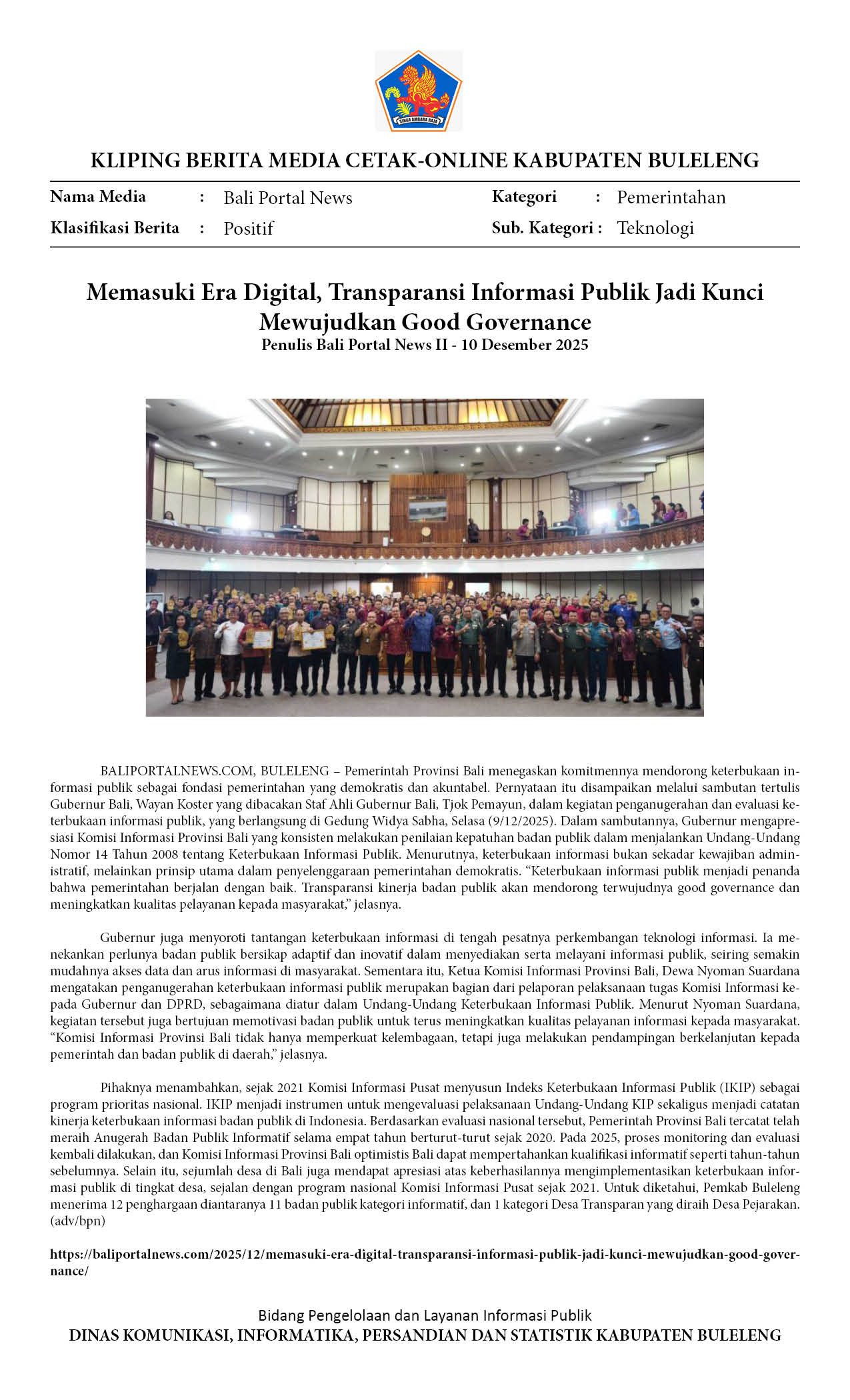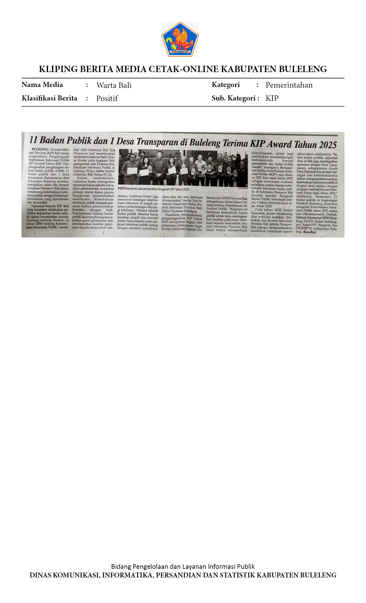 11 BADAN PUBLIK DAN 1 DESA TRANSPARAN DI BULELENG TERIMA KIP AWARD TAHUN 2025