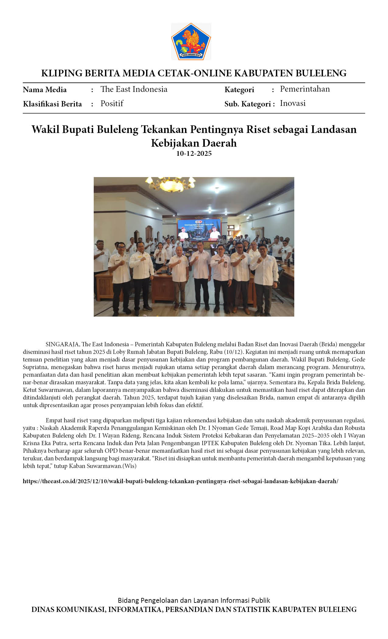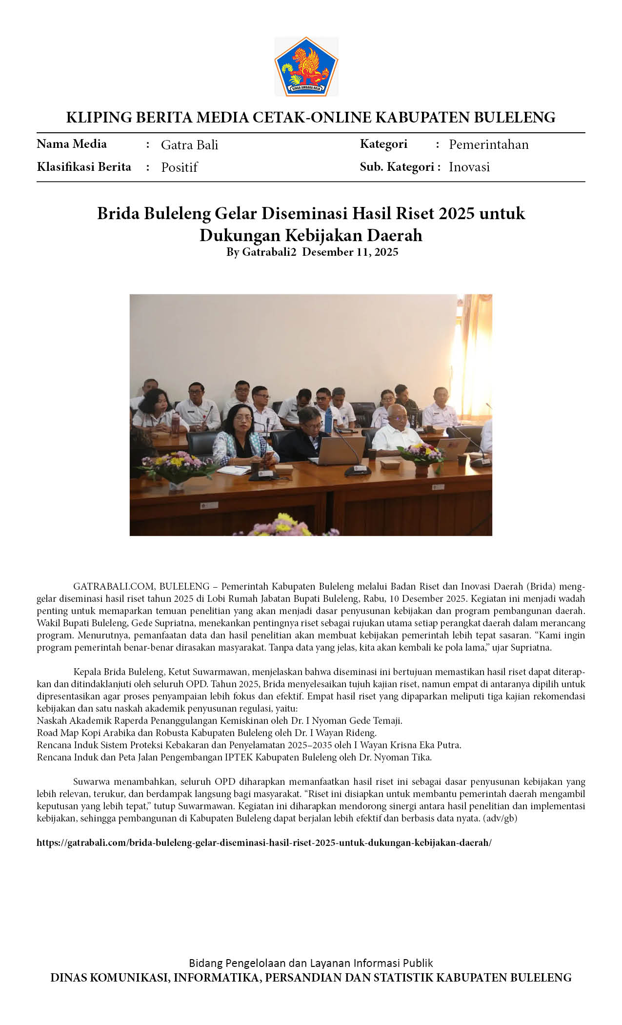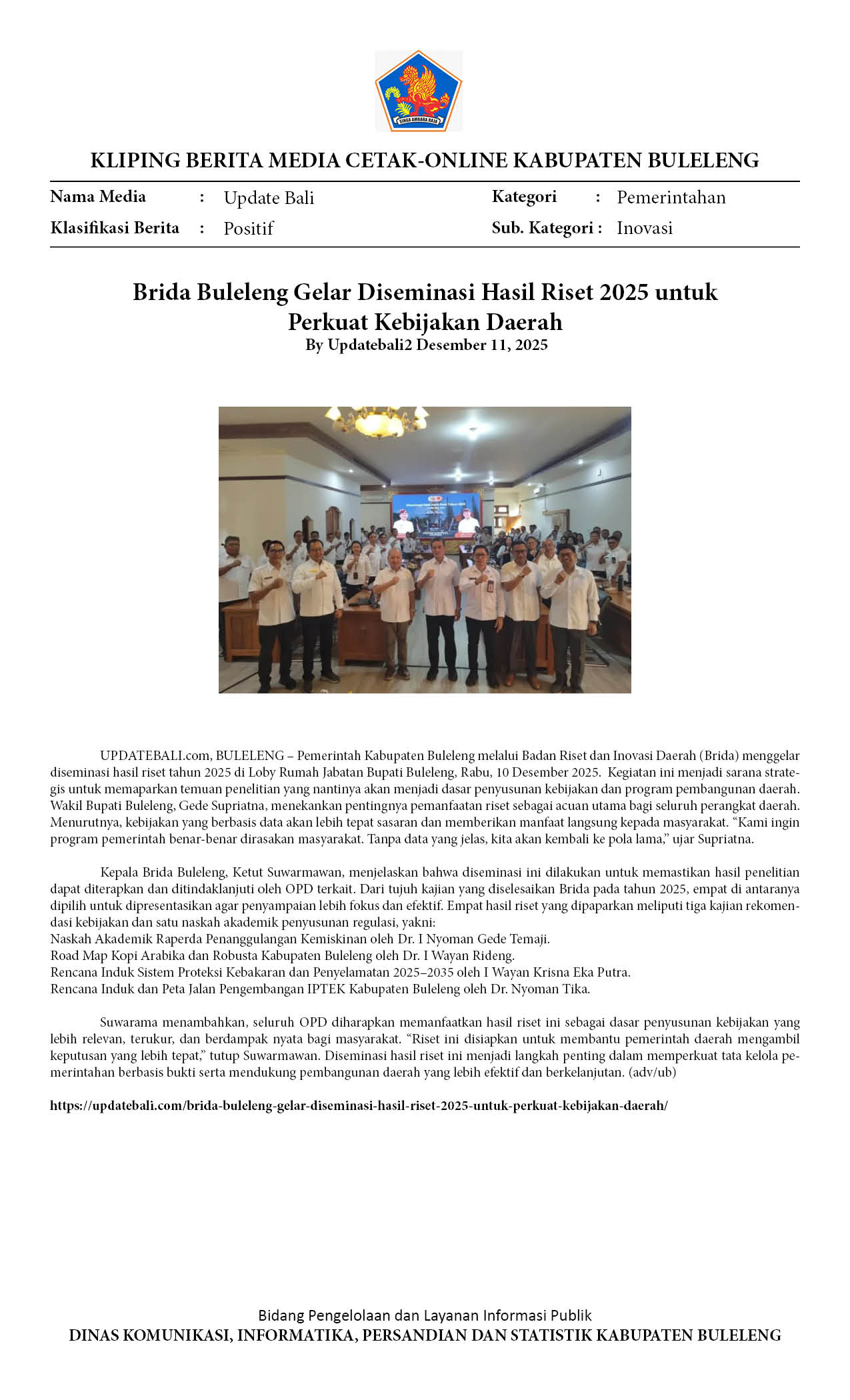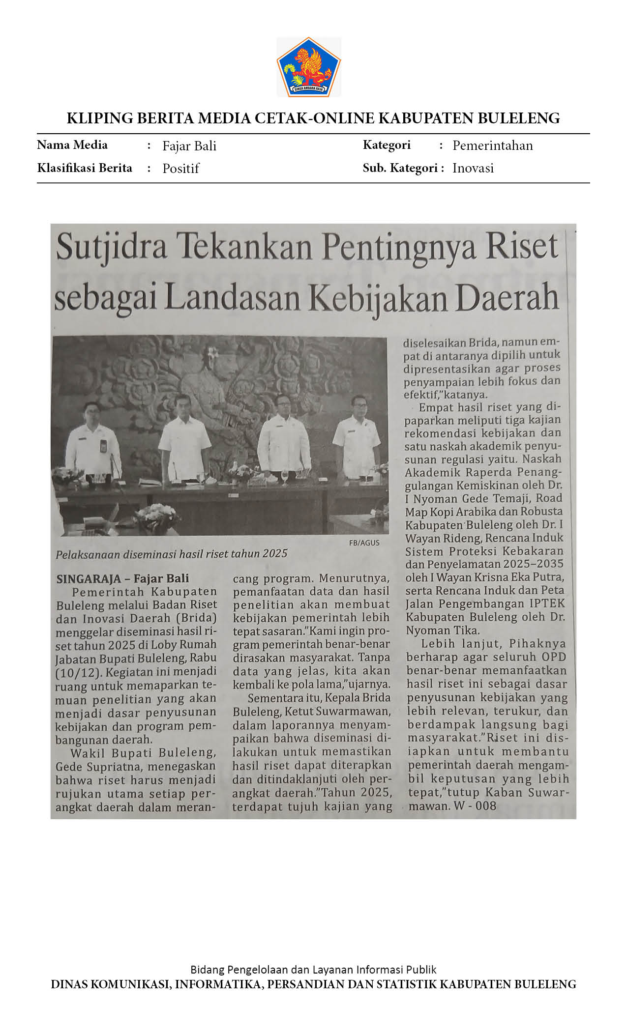 BRIDA BULELENG GELAR DISEMINASI HASIL RISET 2025 UNTUK PERKUAT KEBIJAKAN DAERAH