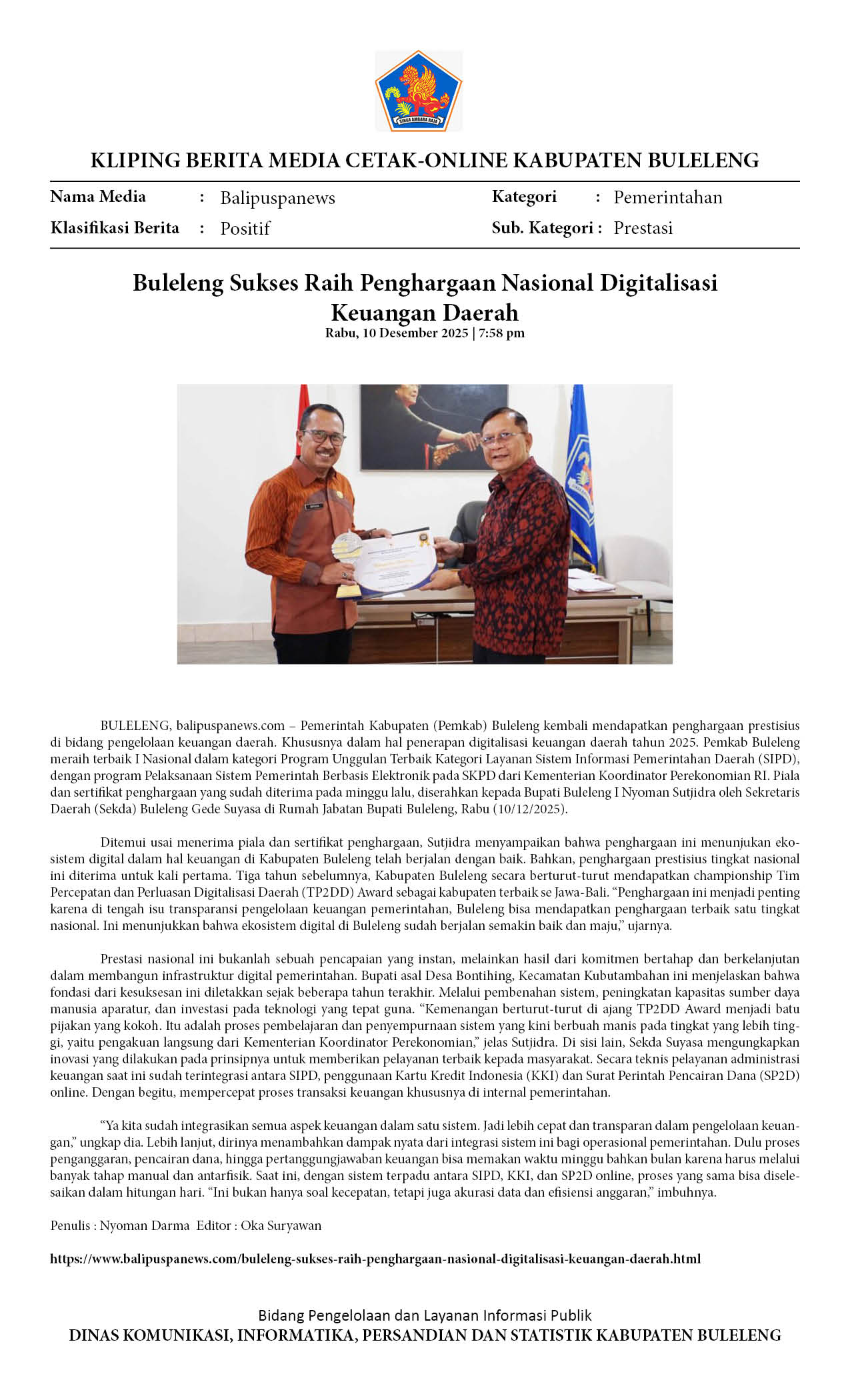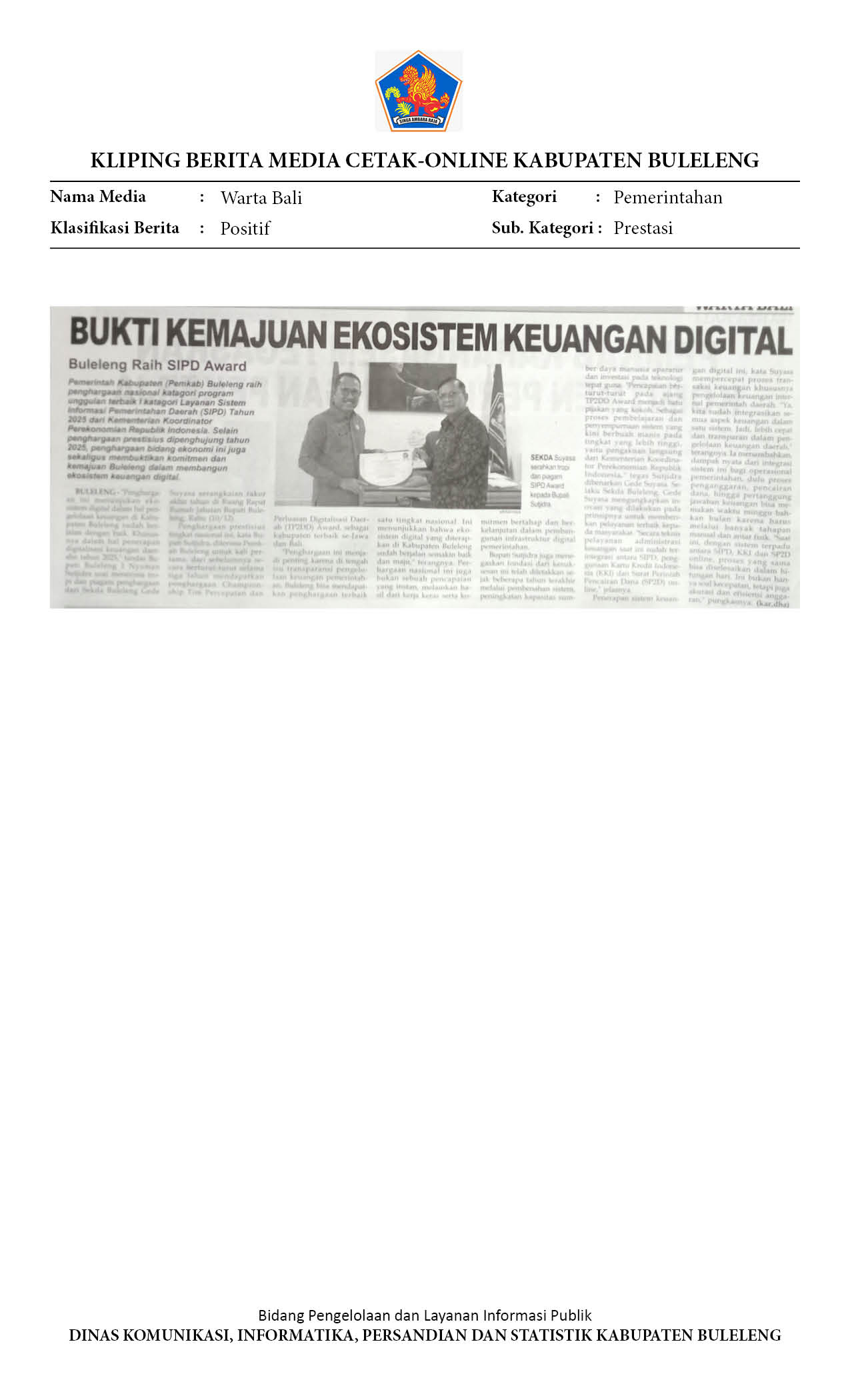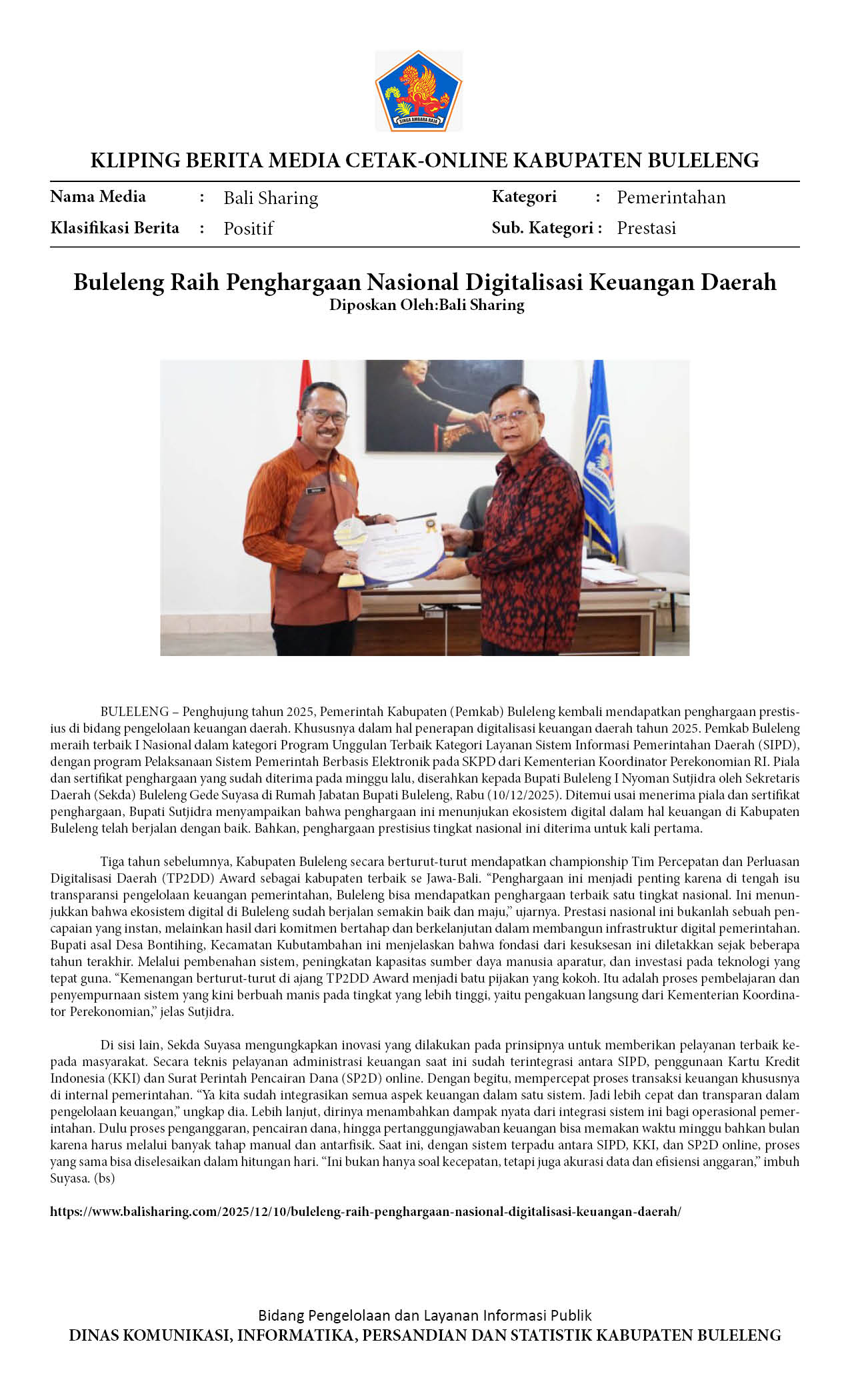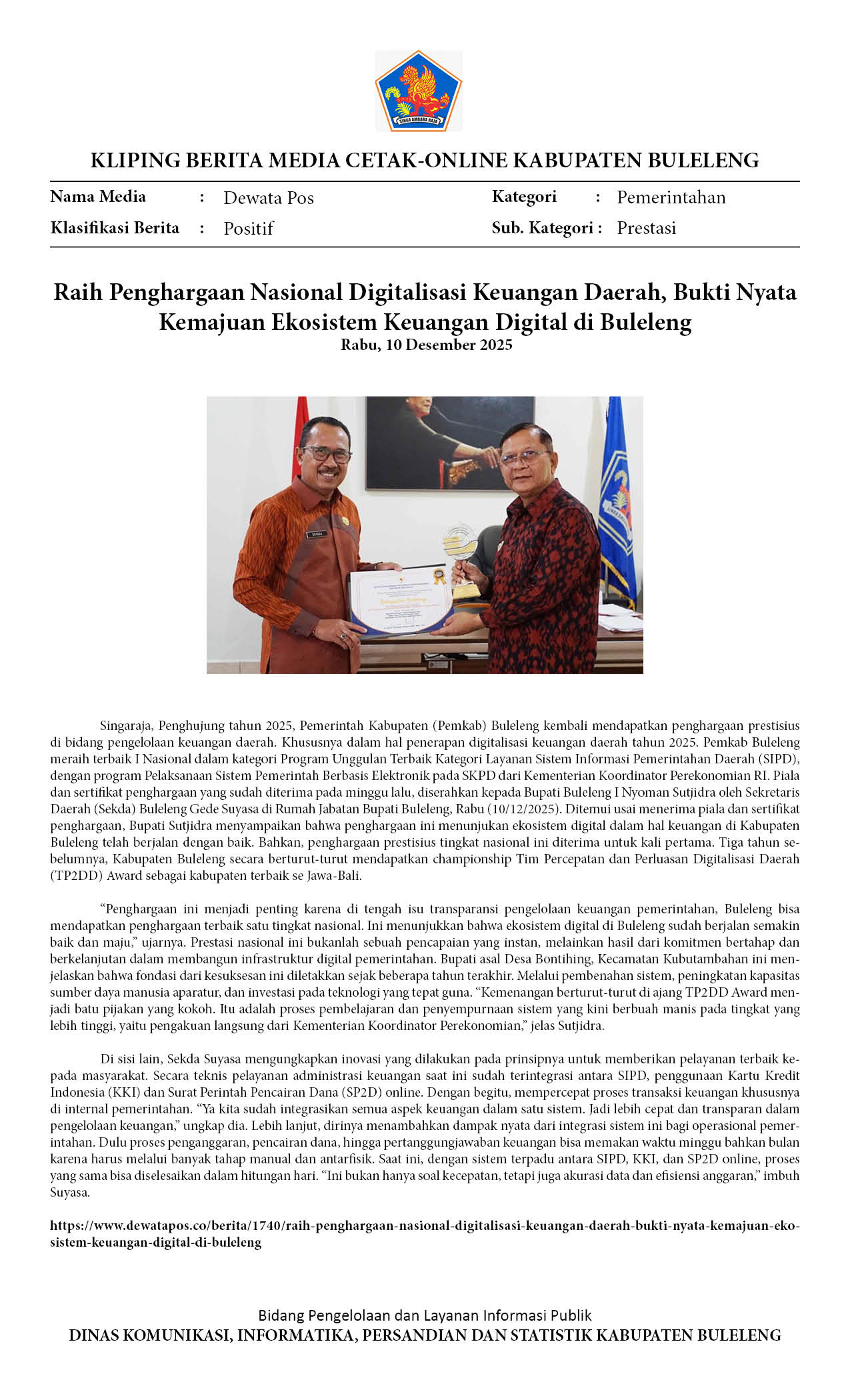 RAIH PENGHARGAAN NASIONAL DIGITALISASI KEUANGAN DAERAH, BUKTI NYATA KEMAJUAN EKOSISTEM KEUANGAN DIGITAL DI BULELENG