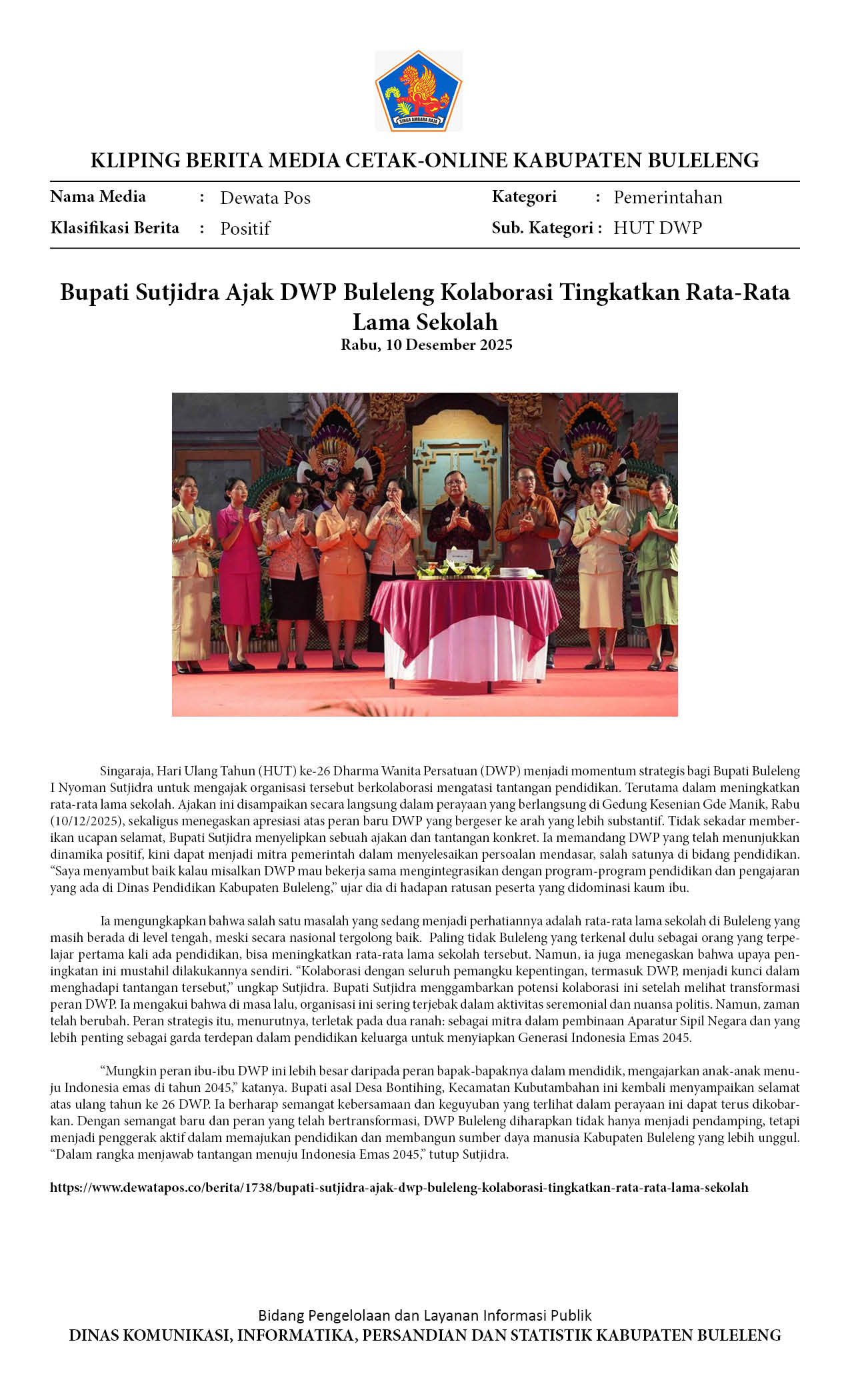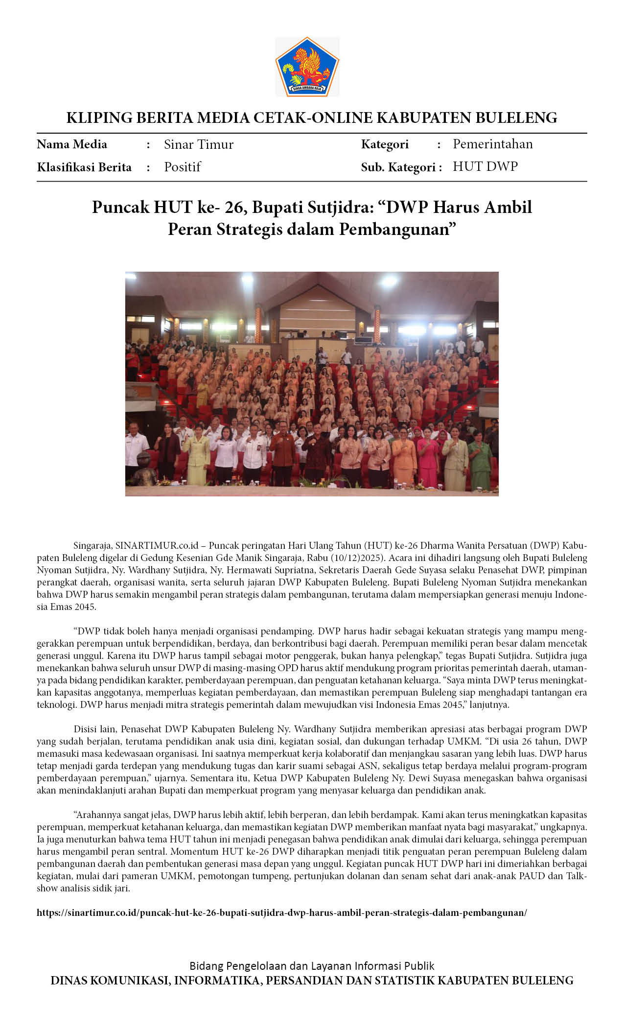 MOMENTUM HUT KE-26, BUPATI SUTJIDRA AJAK DWP JADI MITRA PEMERINTAH ATASI TANTANGAN PENDIDIKAN BULELENG