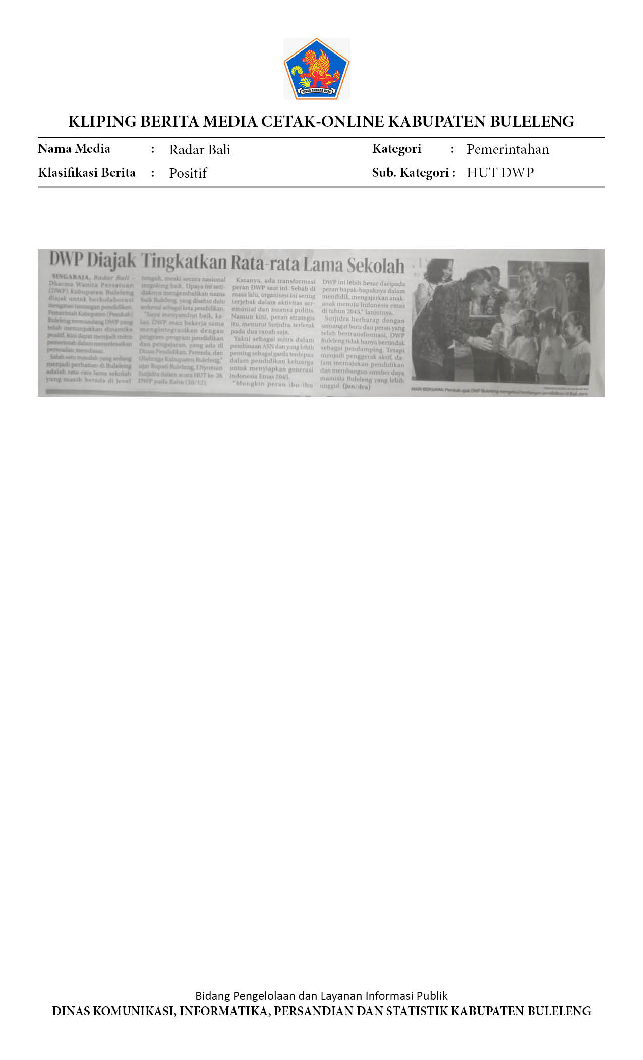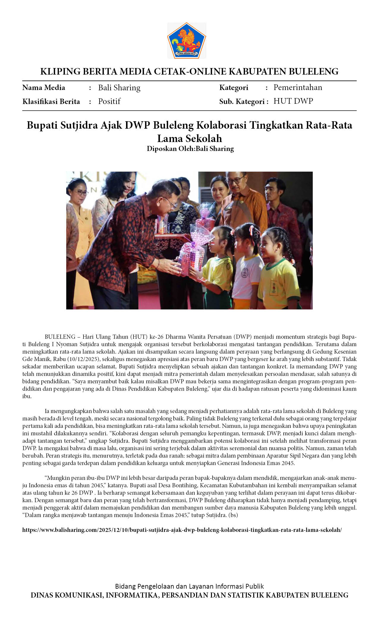 BUPATI SUTJIDRA AJAK DWP BULELENG KOLABORASI TINGKATKAN RATA-RATA LAMA SEKOLAH