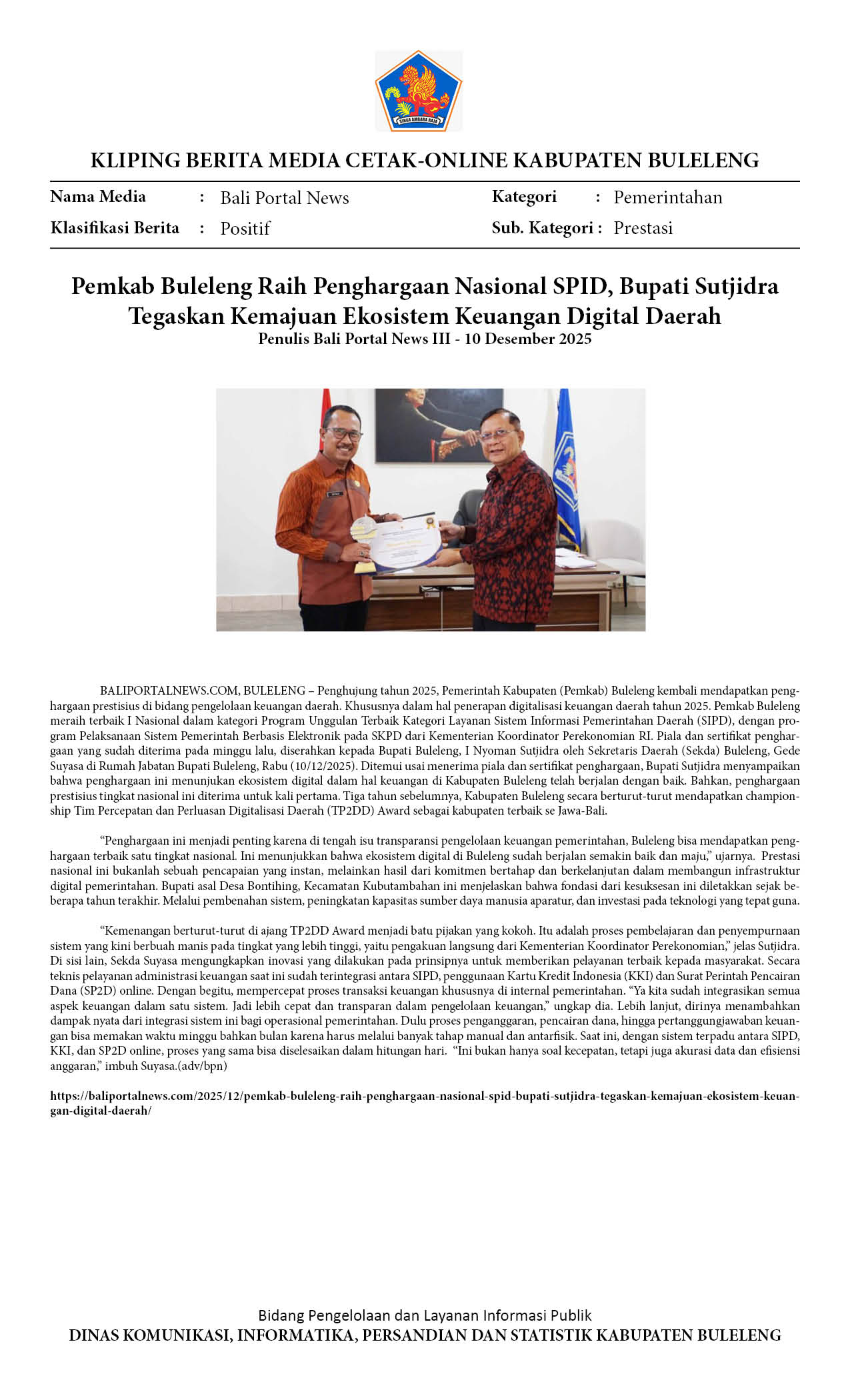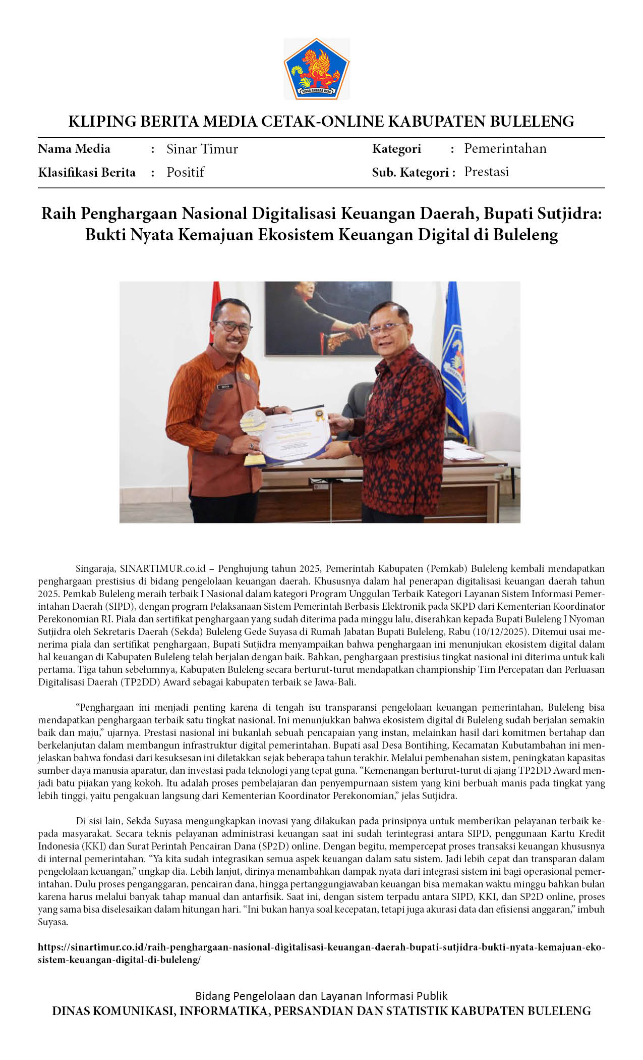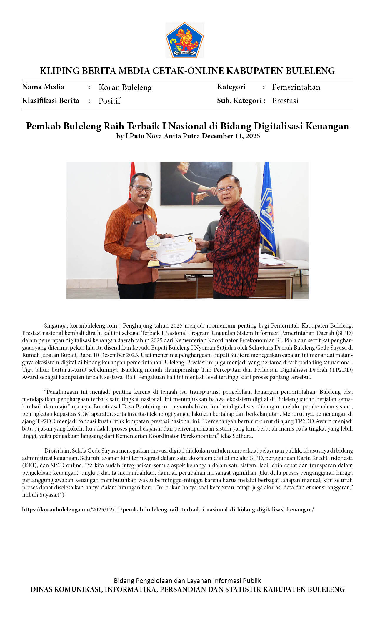 RAIH PENGHARGAAN NASIONAL DIGITALISASI KEUANGAN DAERAH, BUPATI SUTJIDRA: BUKTI NYATA KEMAJUAN EKOSISTEM KEUANGAN DIGITAL DI BULELENG