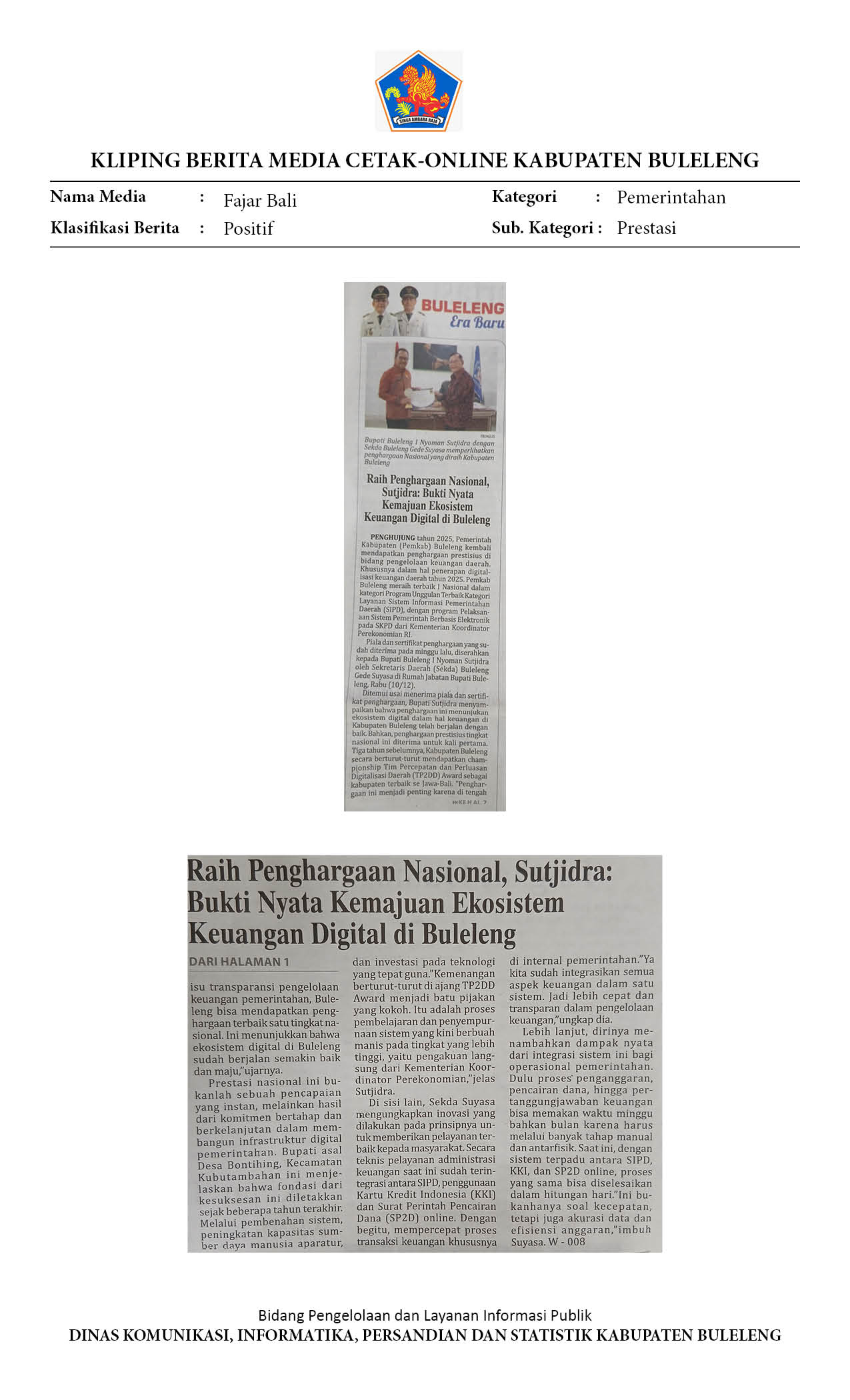RAIH PENGHARGAAN NASIONAL, SUTJIDRA: BUKTI NYATA KEMAJUAN EKOSISTEM KEUANGAN DIGITAL DI BULELENG