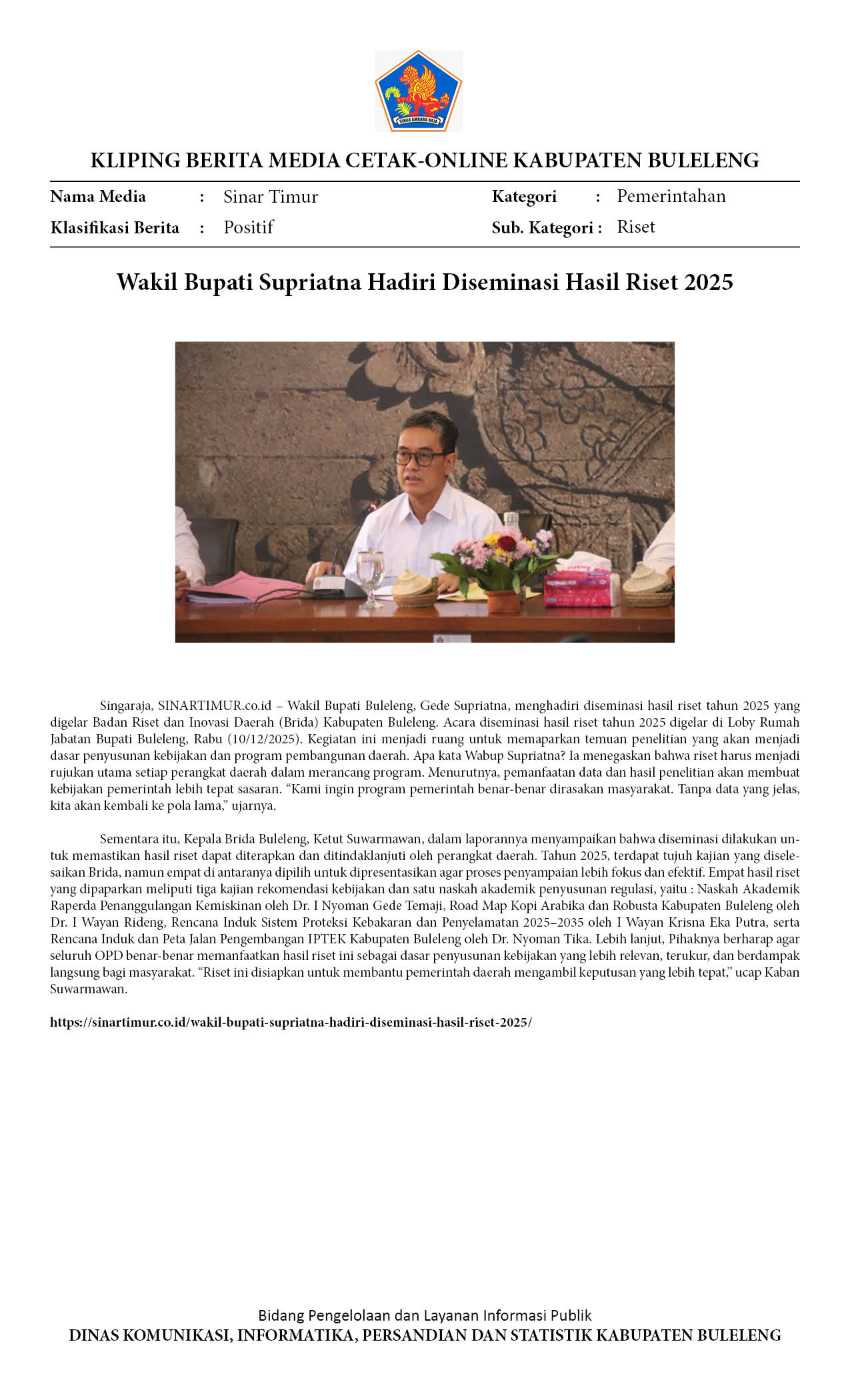WAKIL BUPATI BULELENG SUPRIATNA, TEKANKAN PENTINGNYA RISET SEBAGAI LANDASAN KEBIJAKAN DAERAH