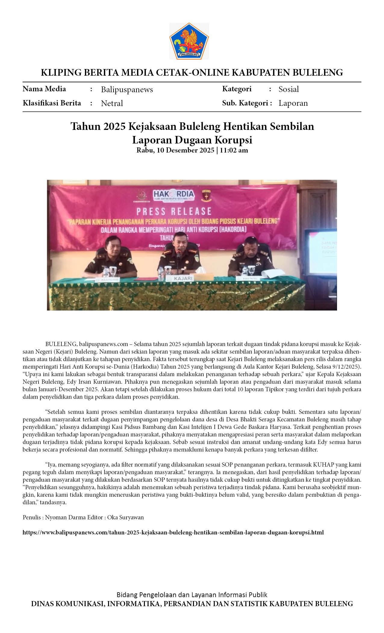 TAHUN 2025 KEJAKSAAN BULELENG HENTIKAN SEMBILAN LAPORAN DUGAAN KORUPSI