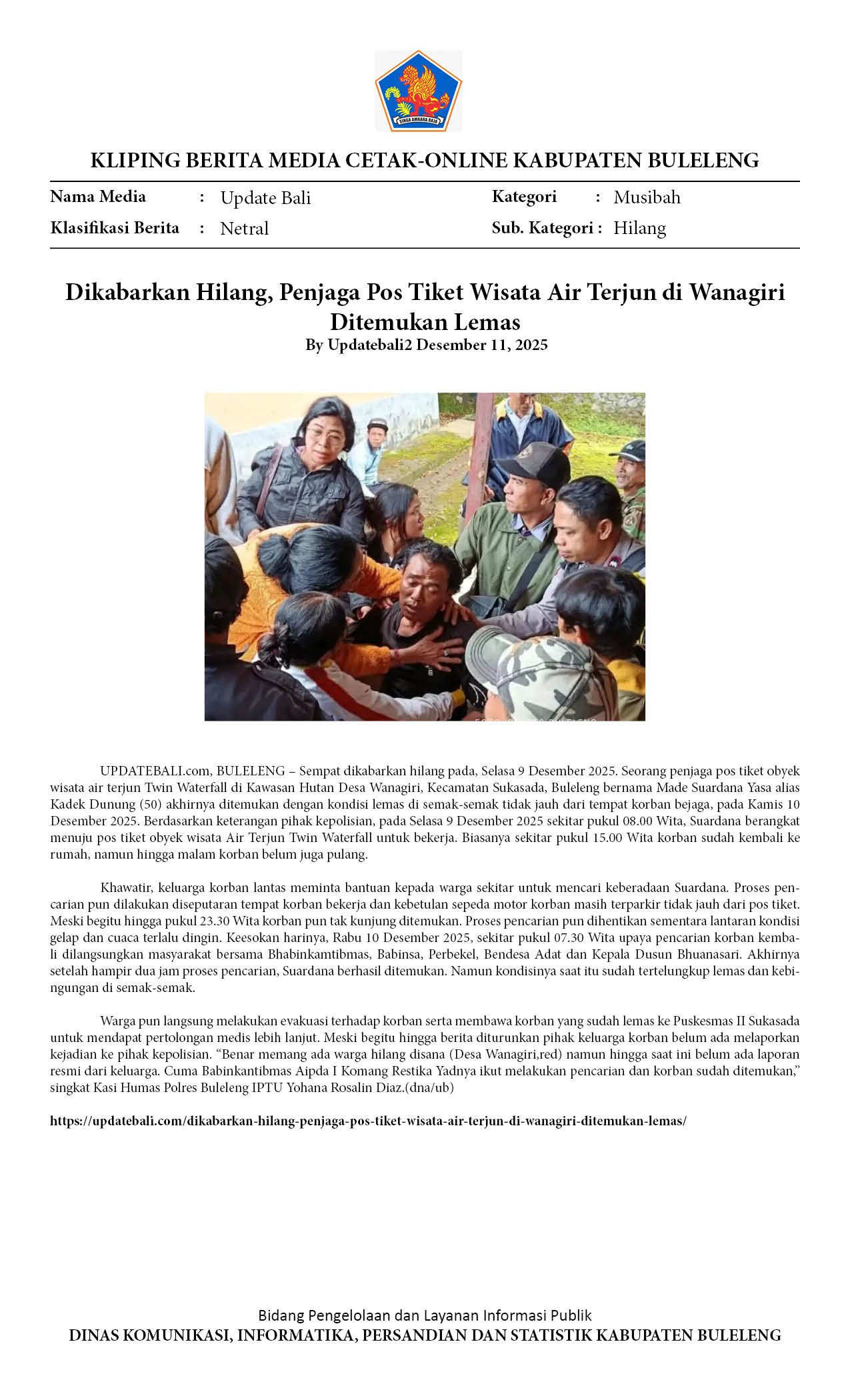 WARGA WANAGIRI HILANG SEHARI, DITEMUKAN LEMAS DI SEMAK-SEMAK