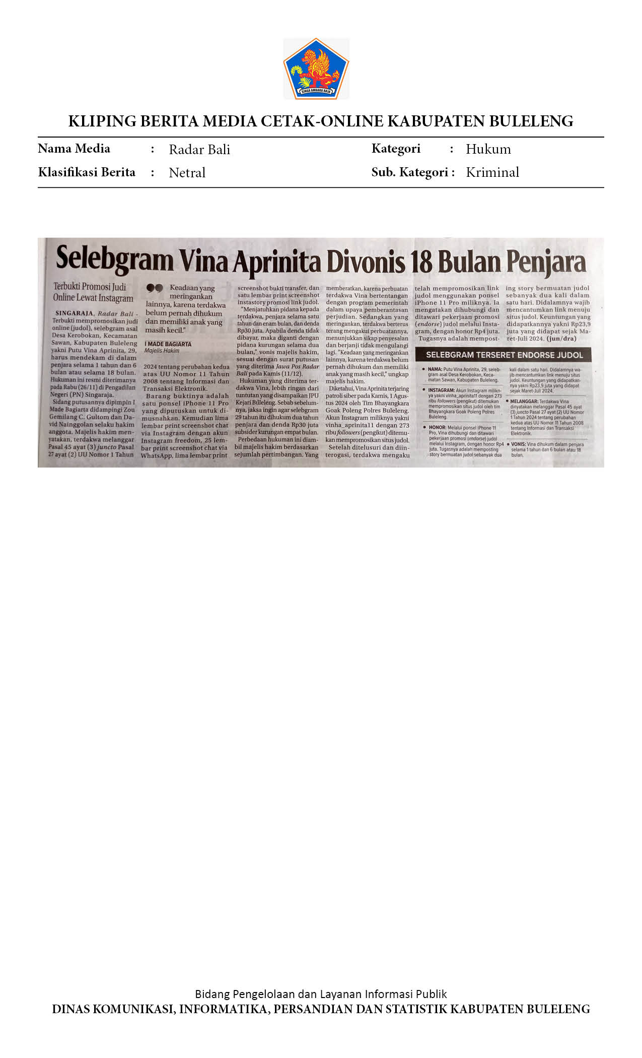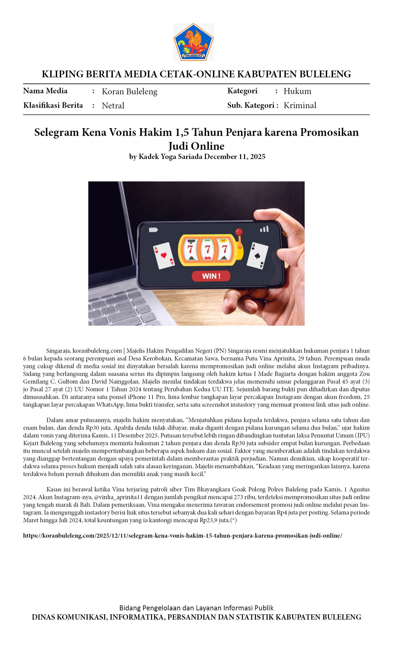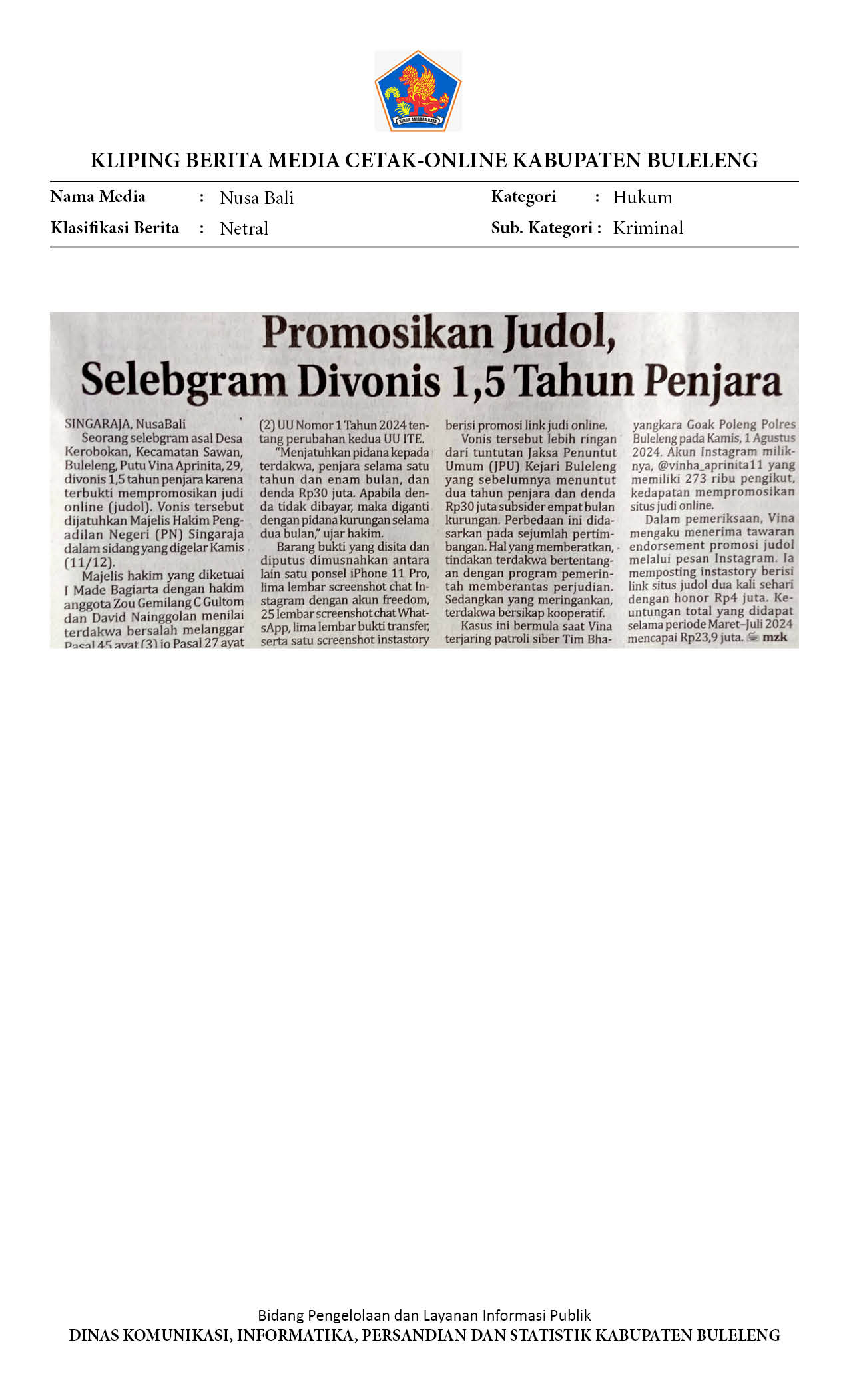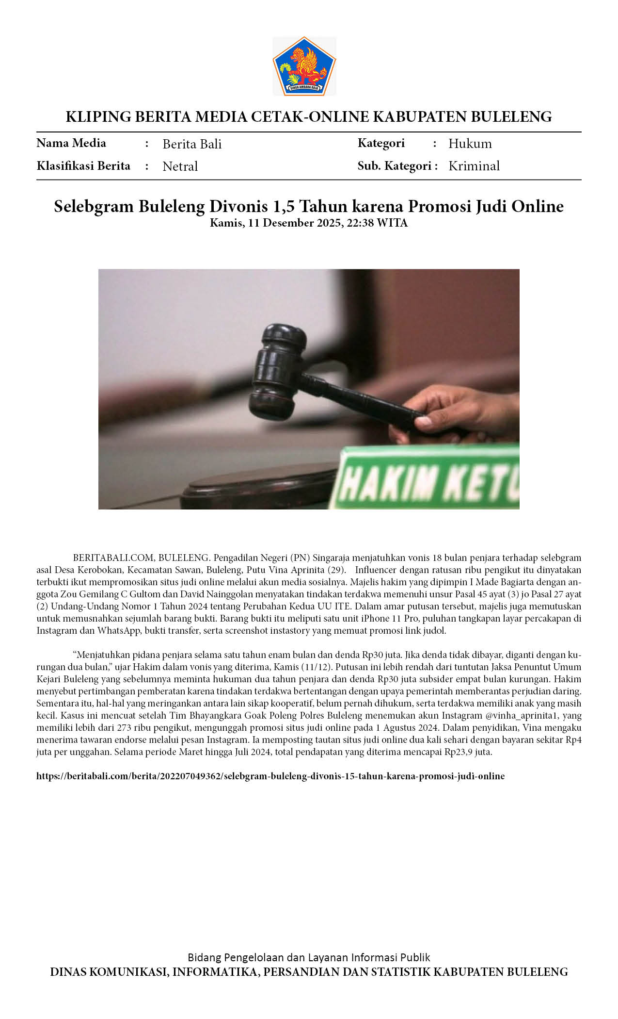 SELEBGRAM BULELENG DIVONIS 1,5 TAHUN KARENA PROMOSI JUDI ONLINE