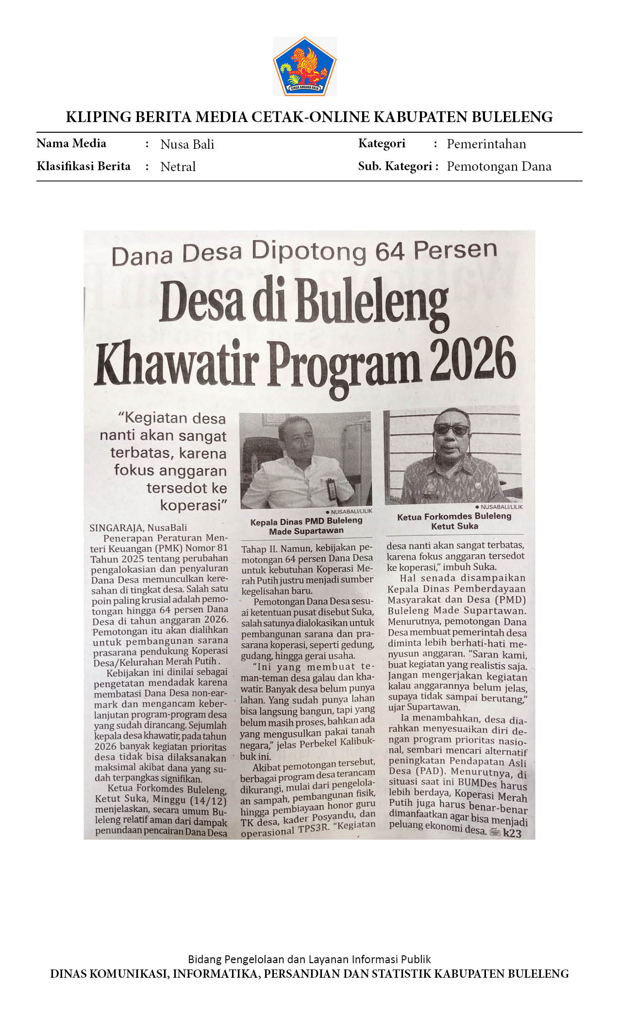 DANA DESA DIPOTONG 64 PERSEN, DESA DI BULELENG KHAWATIR PROGRAM 2026