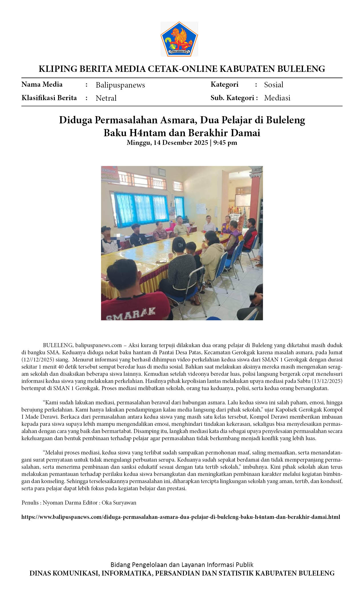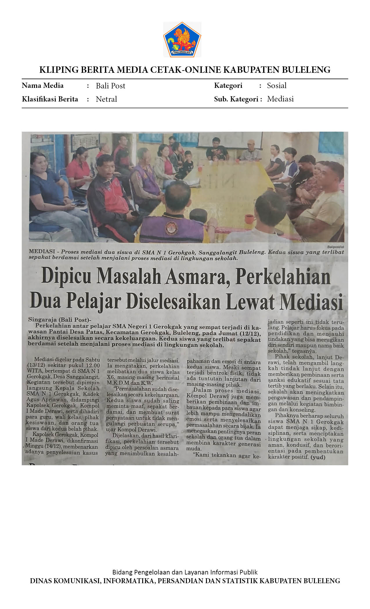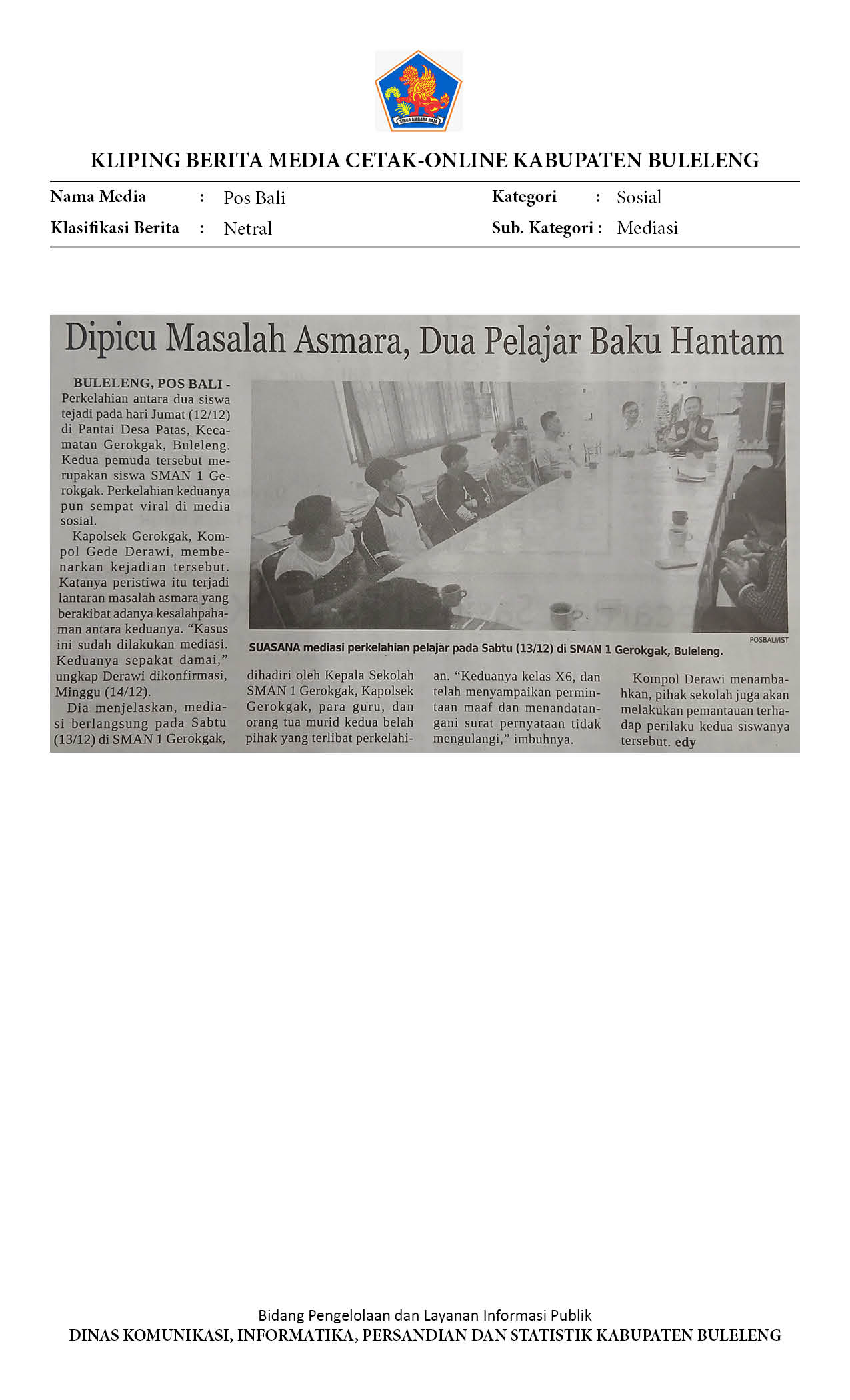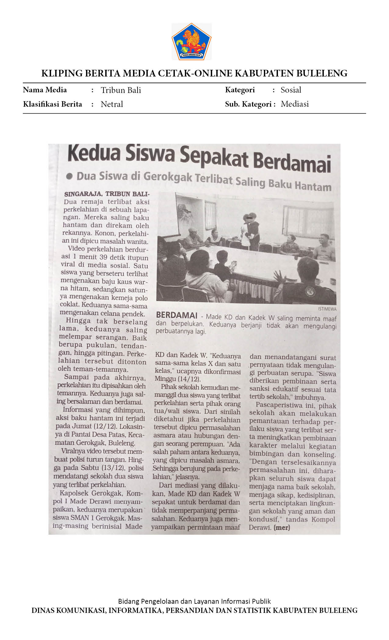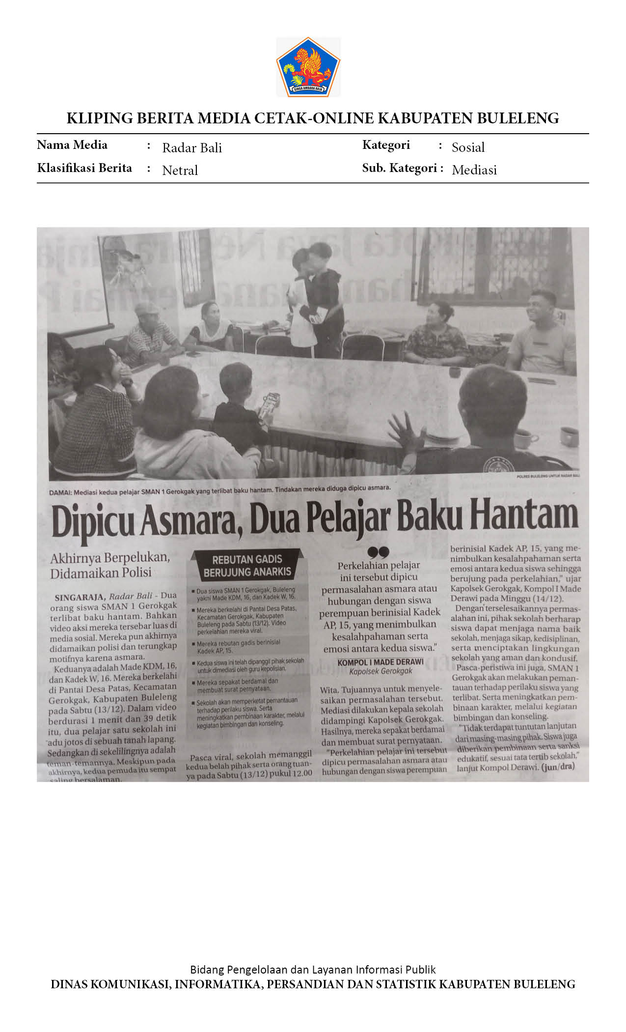MASALAH PEREMPUAN MEMICU DUEL PELAJAR DI GEROKGAK, POLISI LAKUKAN MEDIASI LIBATKAN SEKOLAH DAN ORANG TUA