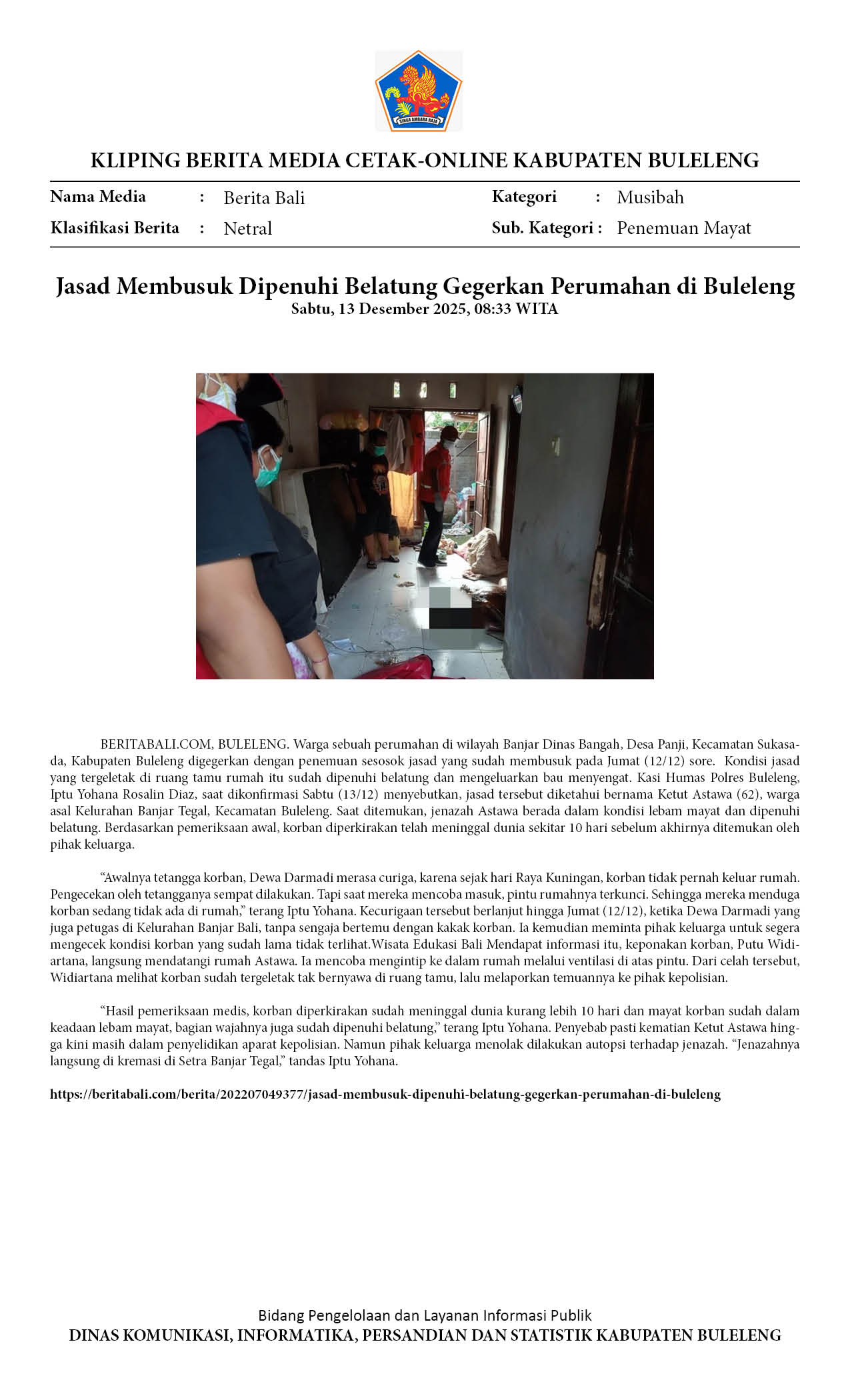 JASAD MEMBUSUK DIPENUHI BELATUNG GEGERKAN PERUMAHAN DI BULELENG