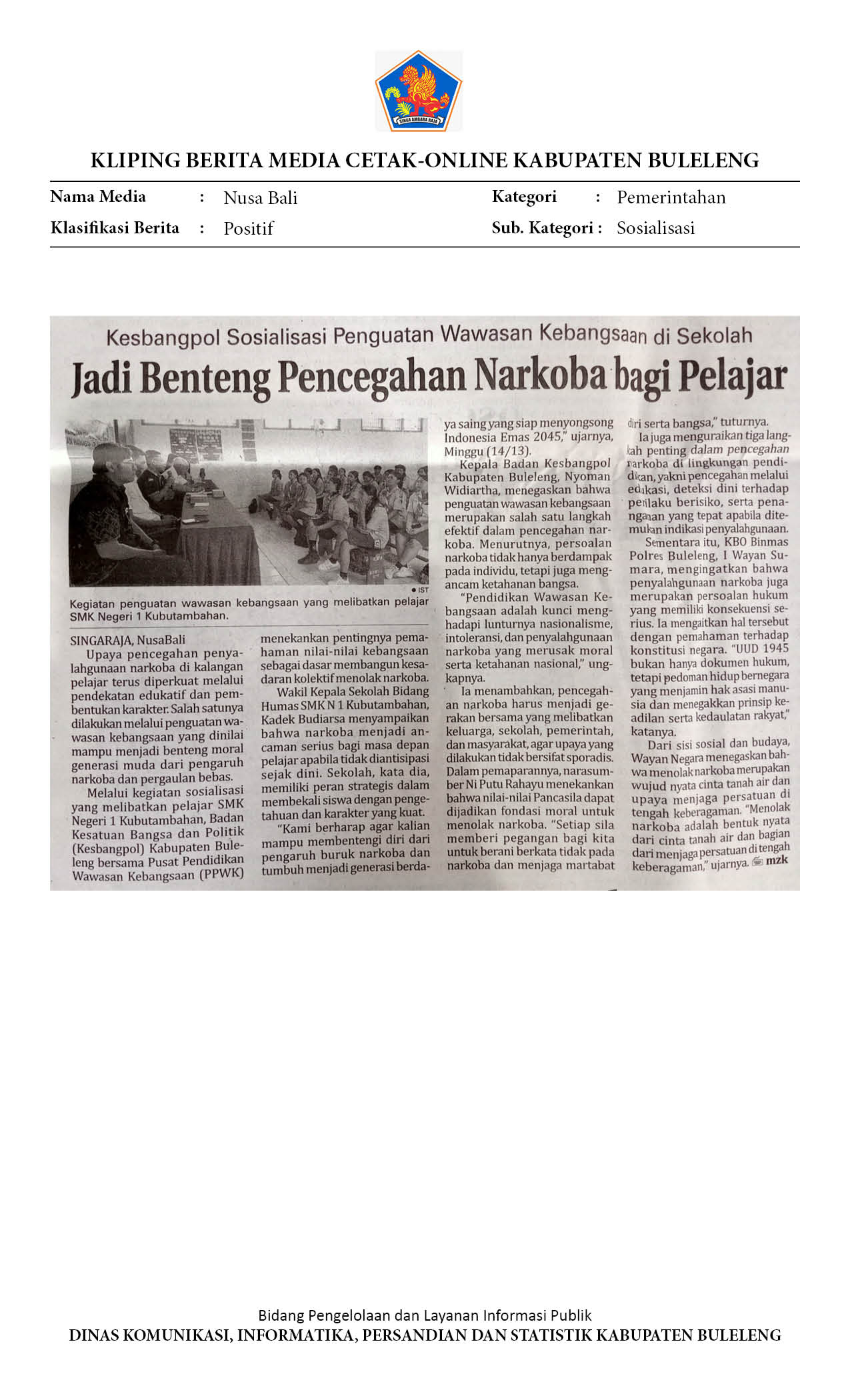 PPWK BULELENG GELAR SOSIALISASI ANTI-NARKOBA MELALUI PENGUATAN WAWASAN KEBANGSAAN DI SMKN 1 KUBUTAMBAHAN