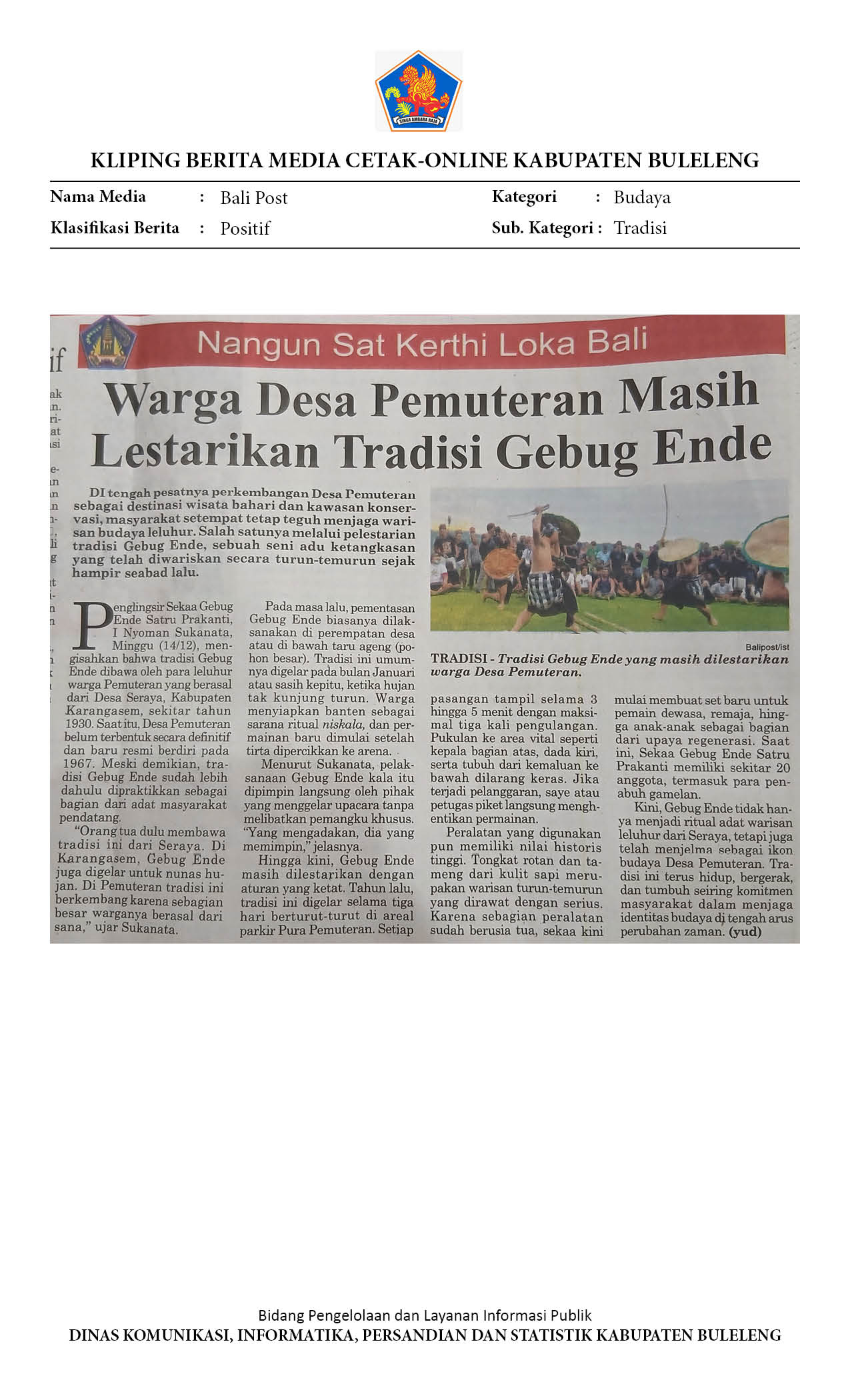 WARGA DESA PEMUTERAN MASIH LESTARIKAN TRADISI GEBUG ENDE