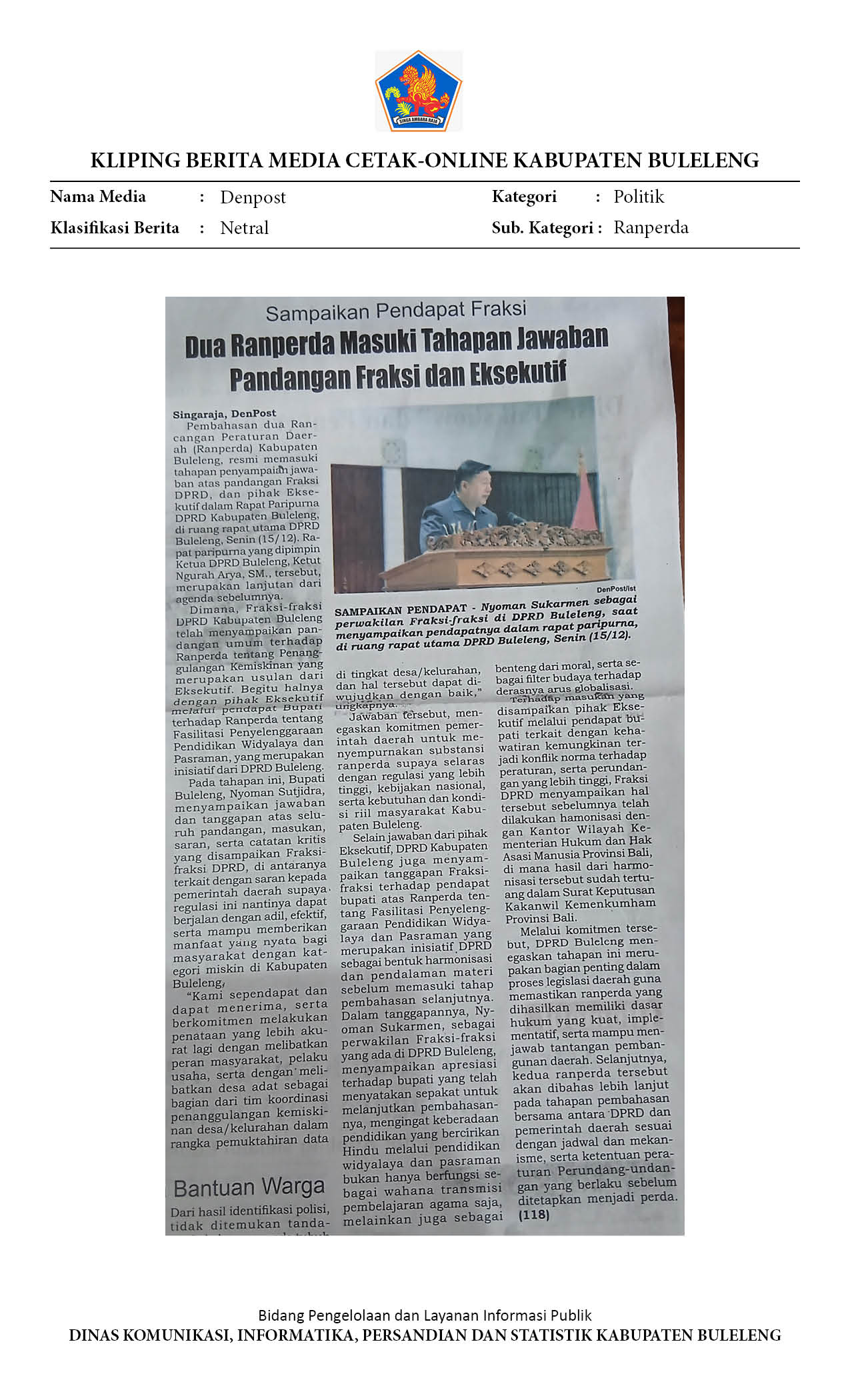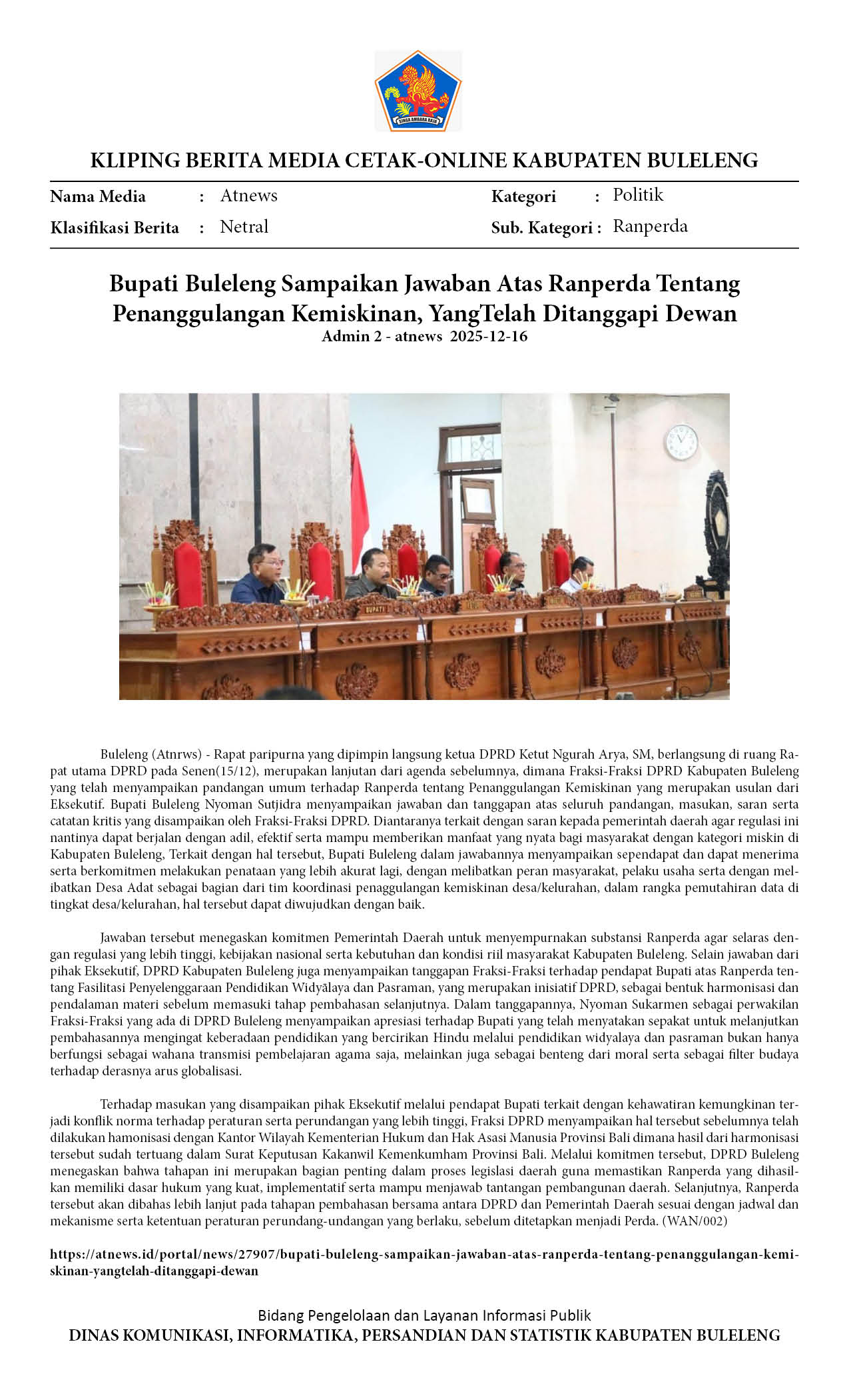 BUPATI BULELENG SAMPAIKAN JAWABAN ATAS RANPERDA TENTANG PENANGGULANGAN KEMISKINAN, YANGTELAH DITANGGAPI DEWAN