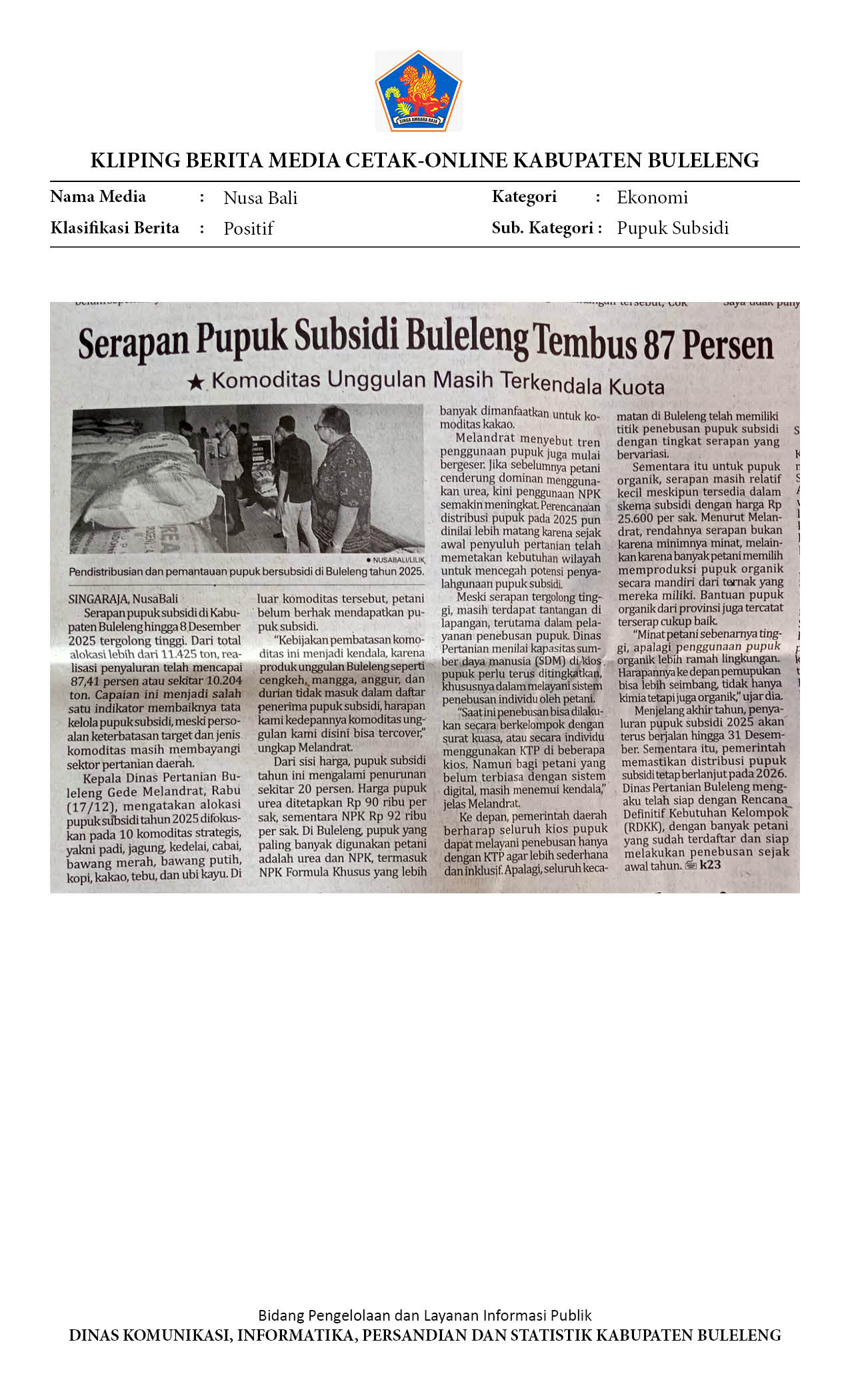 SERAPAN PUPUK SUBSIDI BULELENG TEMBUS 87 PERSEN