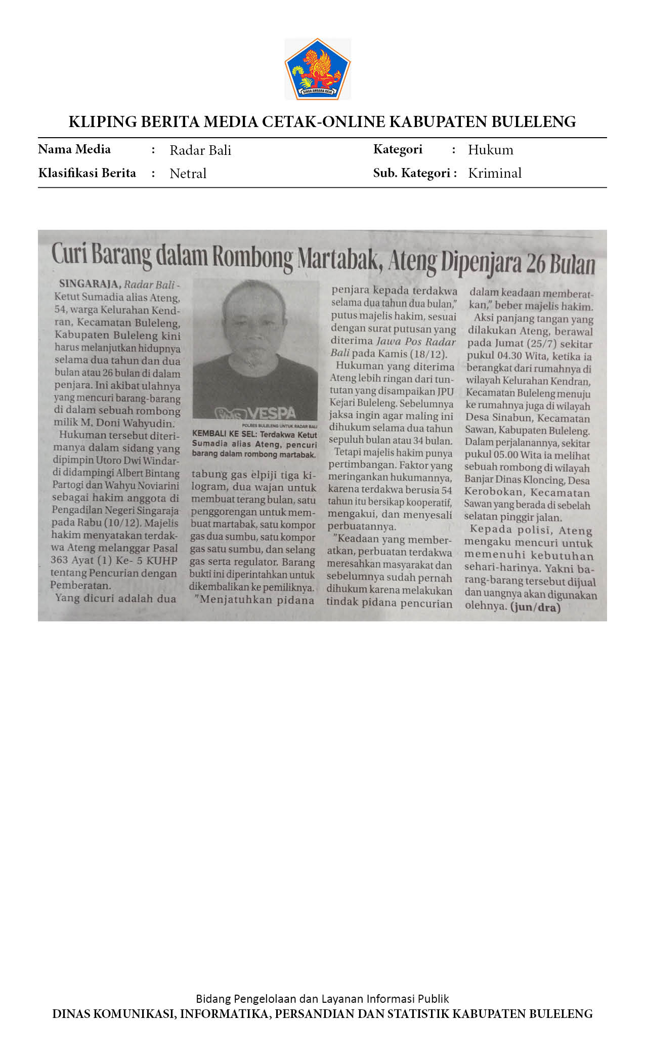 CURI BARANG DALAM ROMBONG MARTABAK, ATENG DIPENJARA 26 BULAN