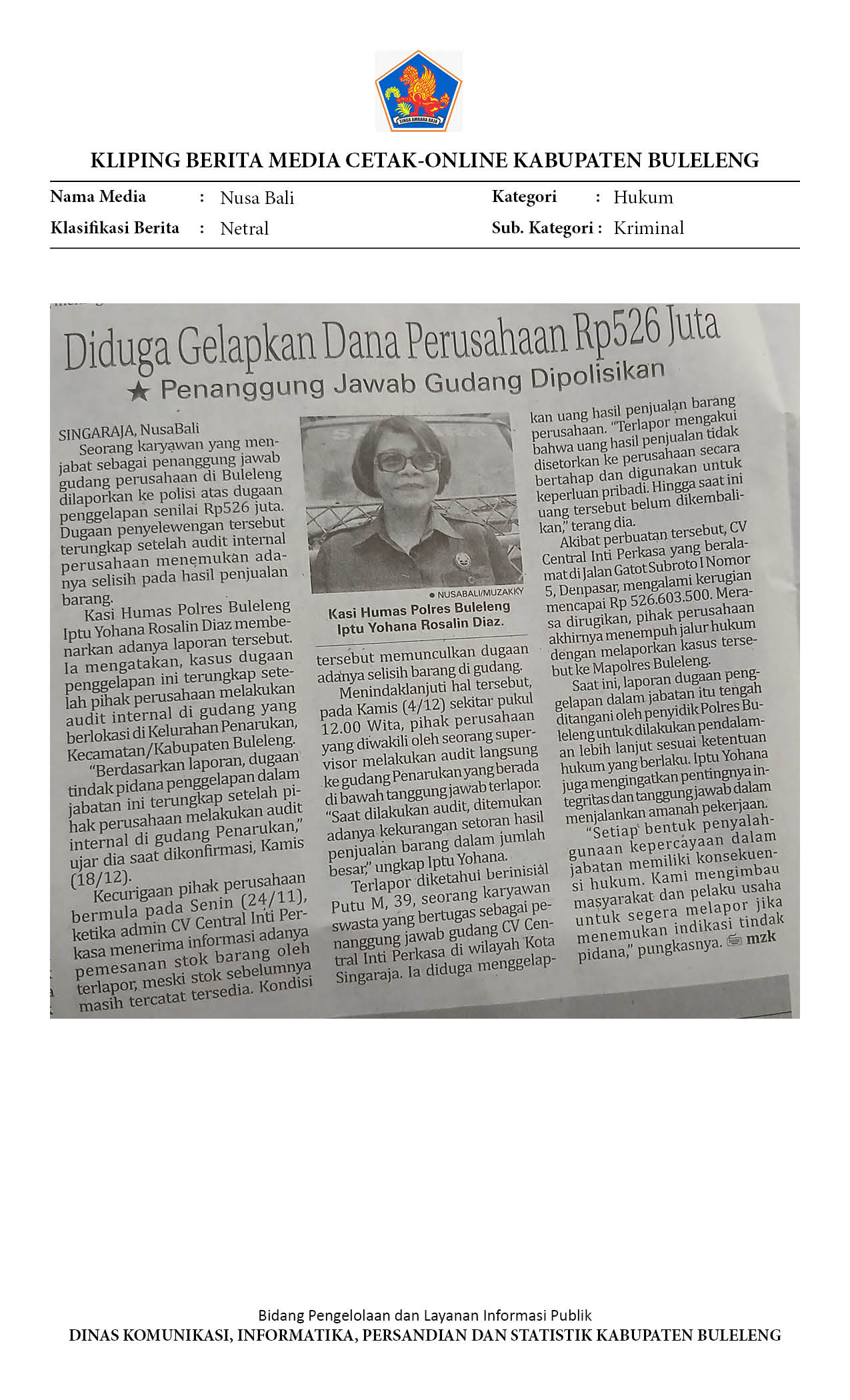 DIDUGA GELAPKAN DANA PERUSAHAAN RP 526 JUTA