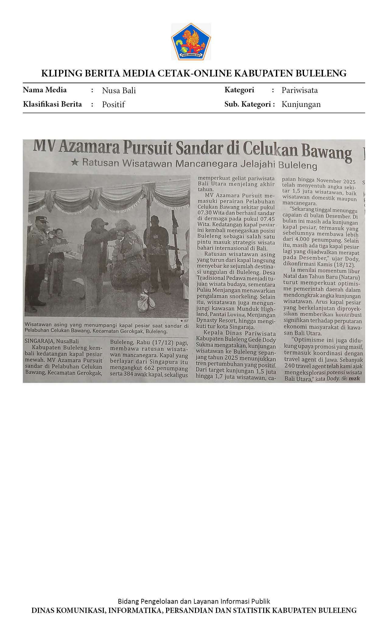 MV AZAMARA PURSUIT SANDAR DI CELUKAN BAWANG, BULELENG DONGKRAK KUNJUNGAN WISATAWAN MANCANEGARA