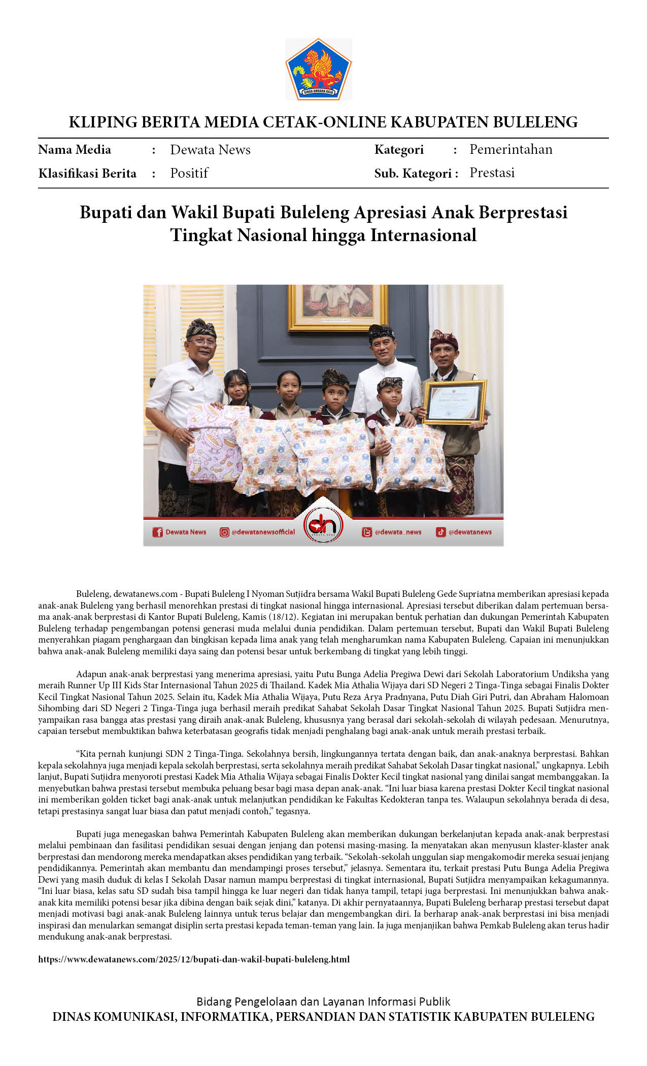 BUPATI DAN WAKIL BUPATI BULELENG APRESIASI ANAK BERPRESTASI TINGKAT NASIONAL HINGGA INTERNASIONAL