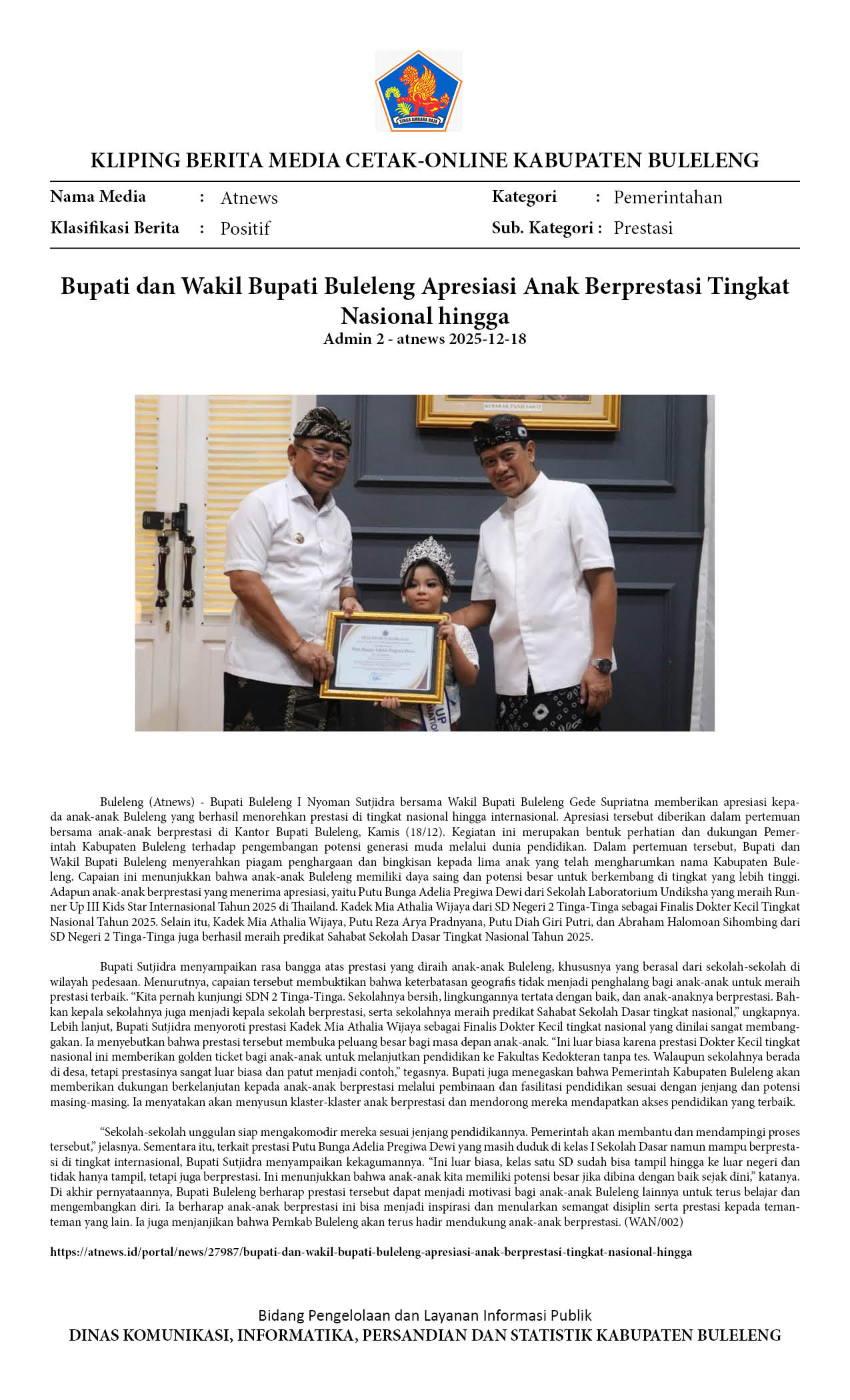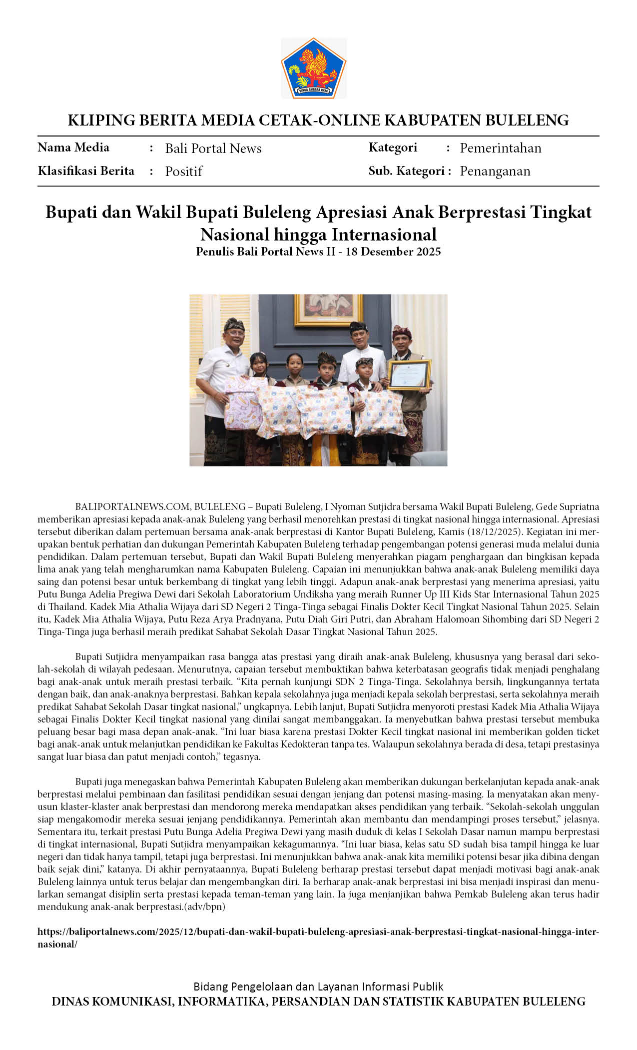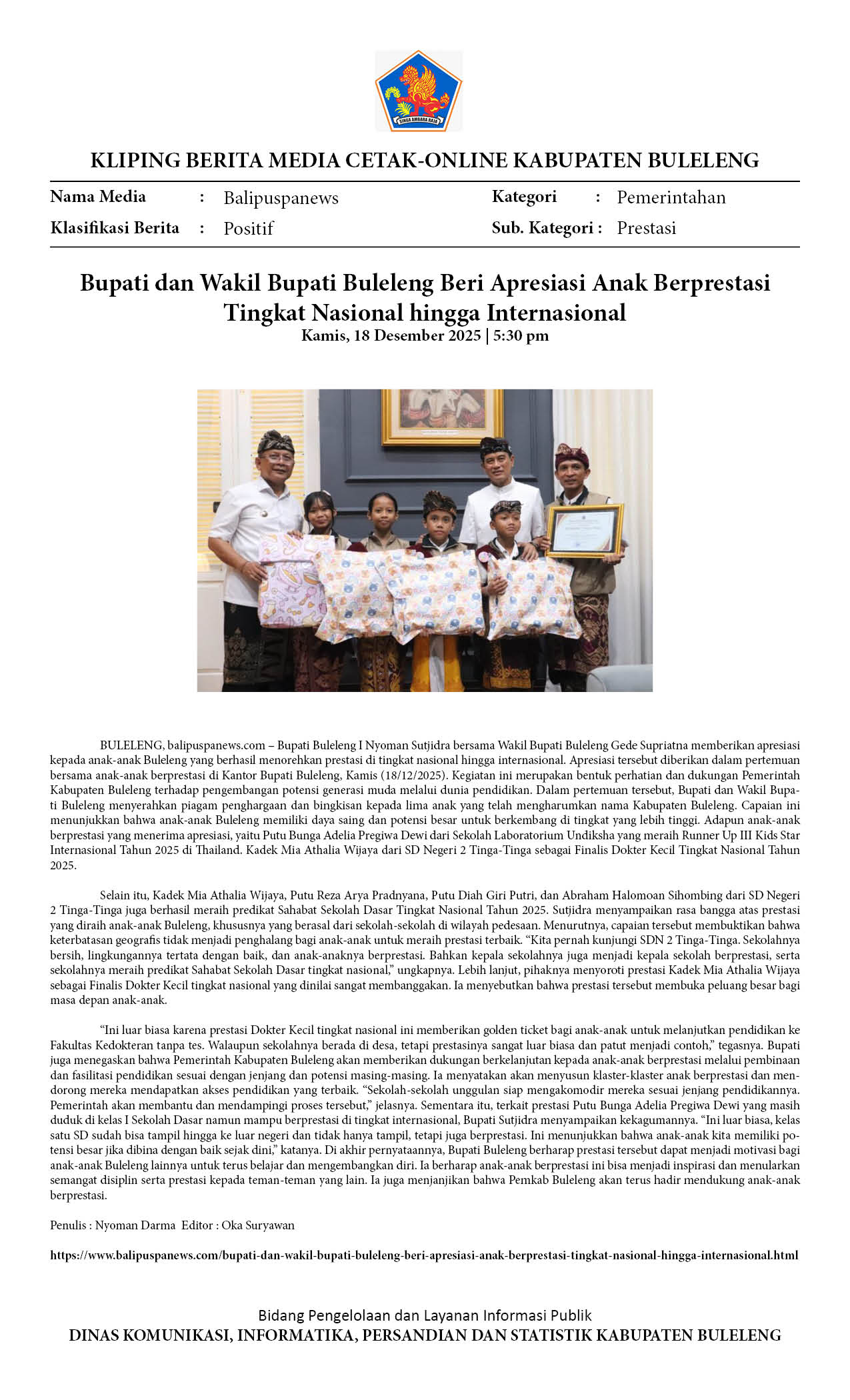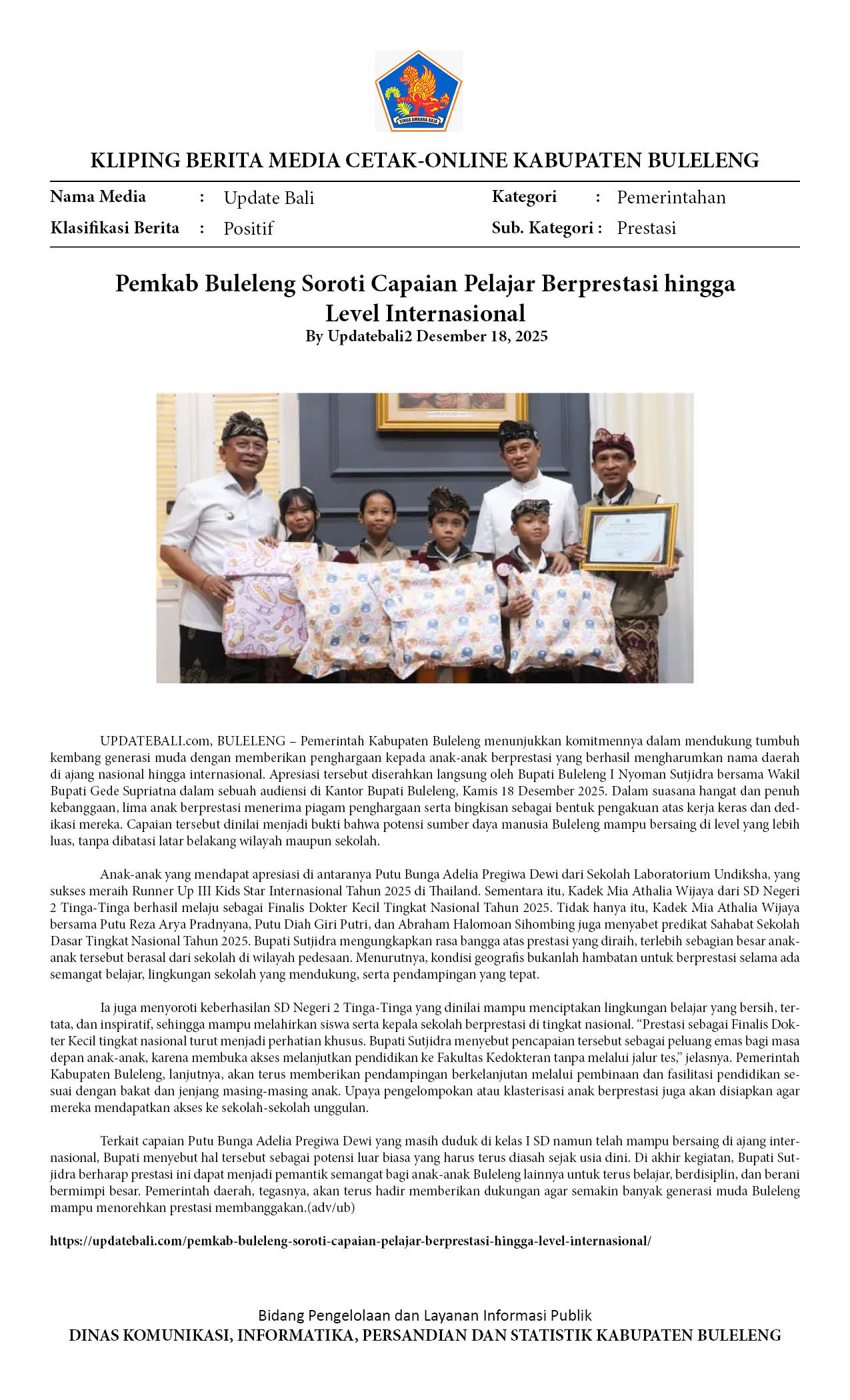 PEMKAB BULELENG SOROTI CAPAIAN PELAJAR BERPRESTASI HINGGA LEVEL INTERNASIONAL