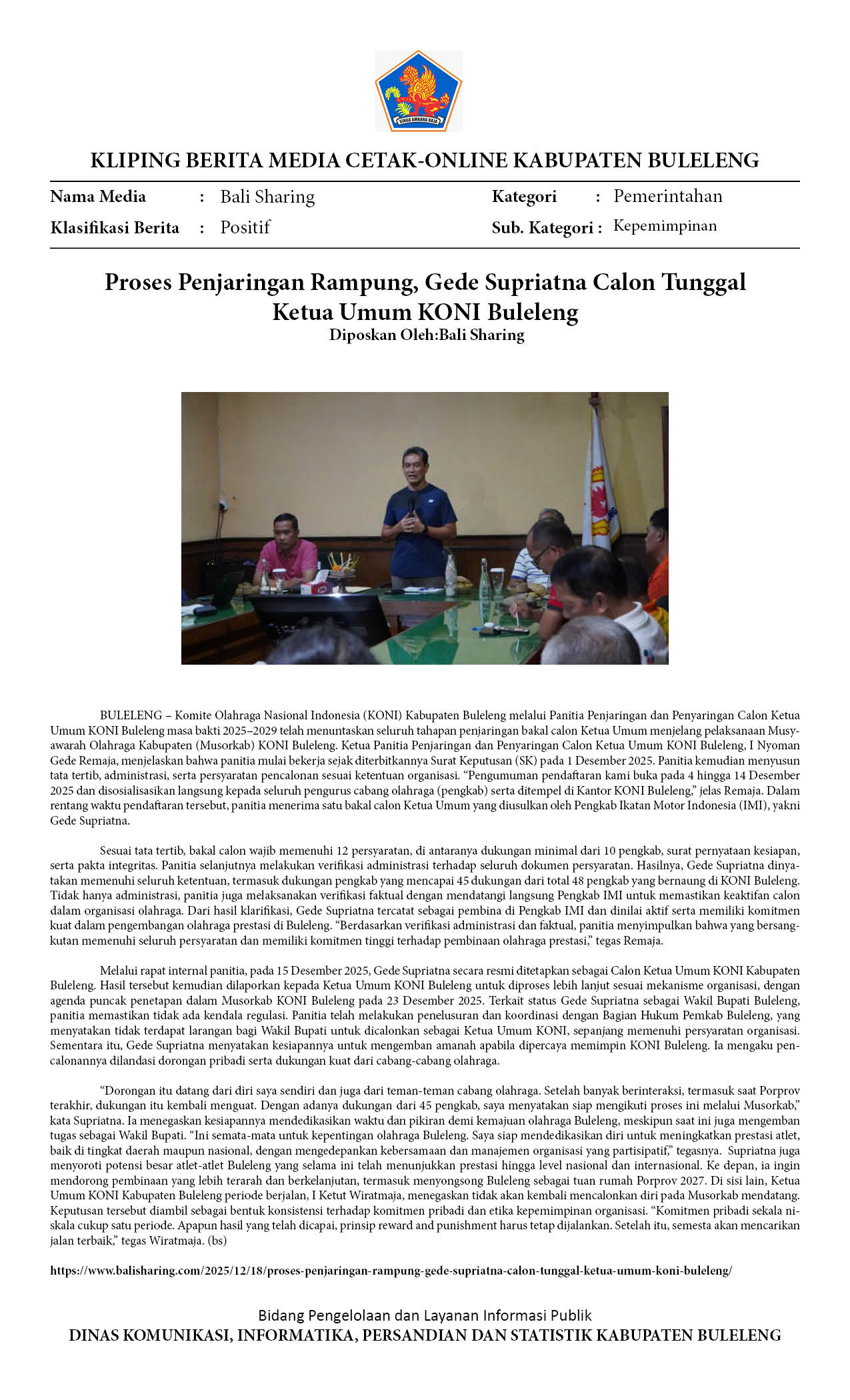 PROSES PENJARINGAN RAMPUNG, GEDE SUPRIATNA CALON TUNGGAL KETUA UMUM KONI BULELENG