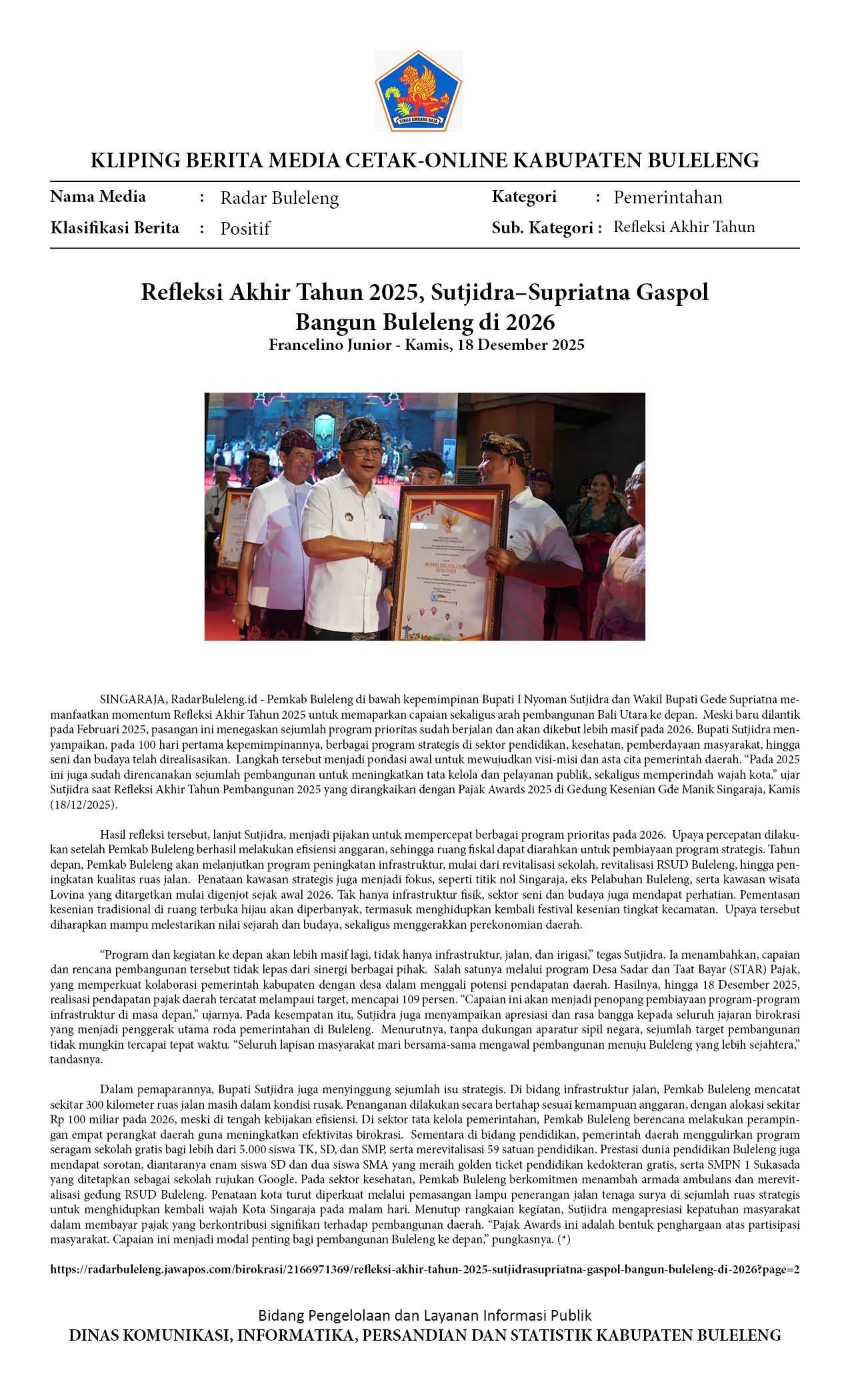 REFLEKSI AKHIR TAHUN 2025, SUTJIDRA–SUPRIATNA GASPOL BANGUN BULELENG DI 2026