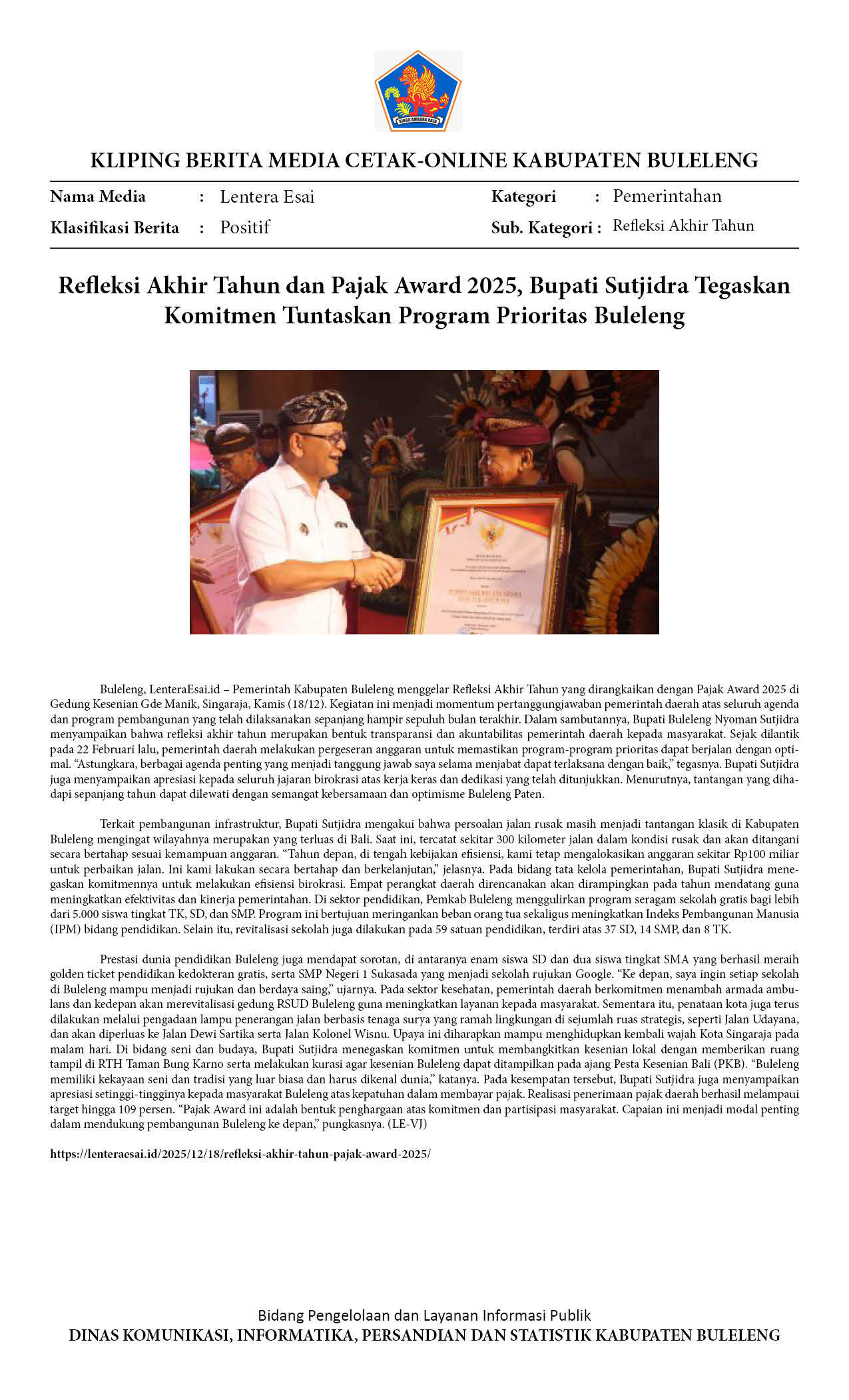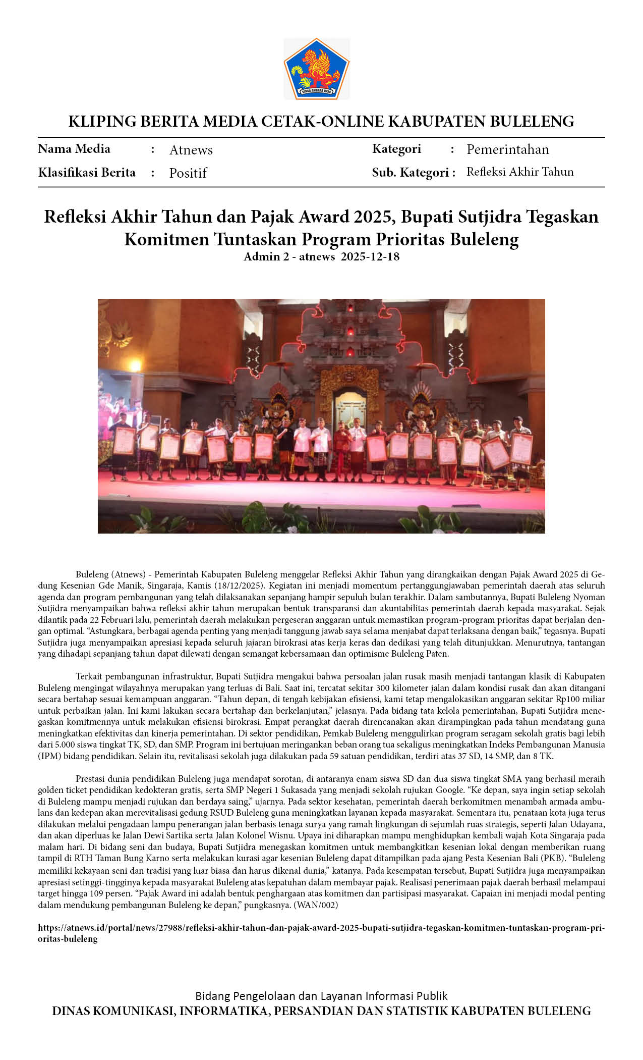 REFLEKSI AKHIR TAHUN DAN PAJAK AWARD 2025, BUPATI SUTJIDRA TEGASKAN KOMITMEN TUNTASKAN PROGRAM PRIORITAS BULELENG