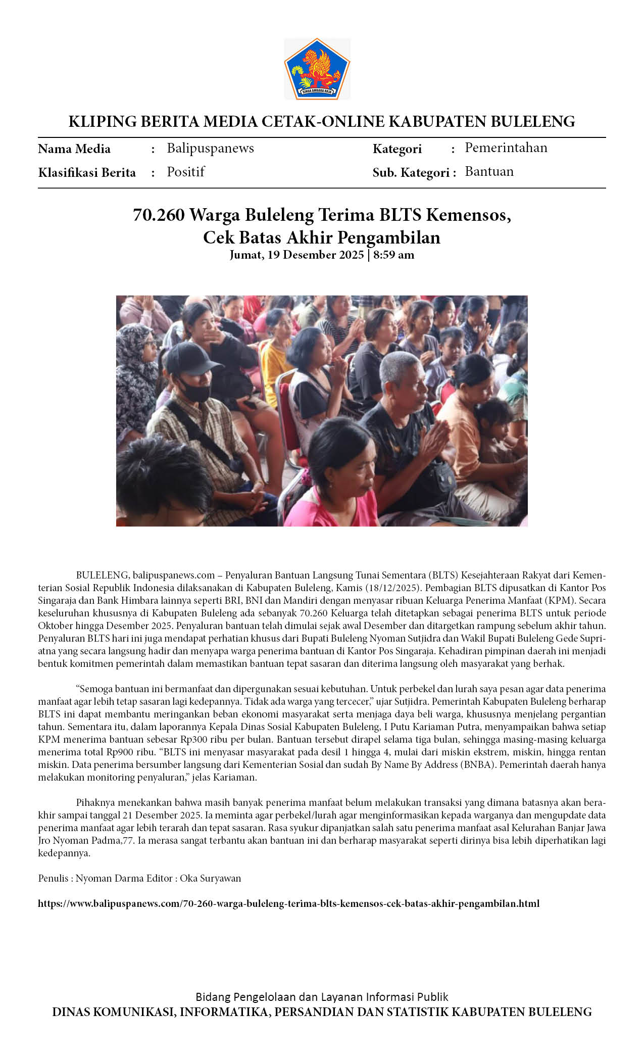 BLTS KEMENSOS CAIR HARI INI, 70.260 WARGA BULELENG TERIMA BANTUAN