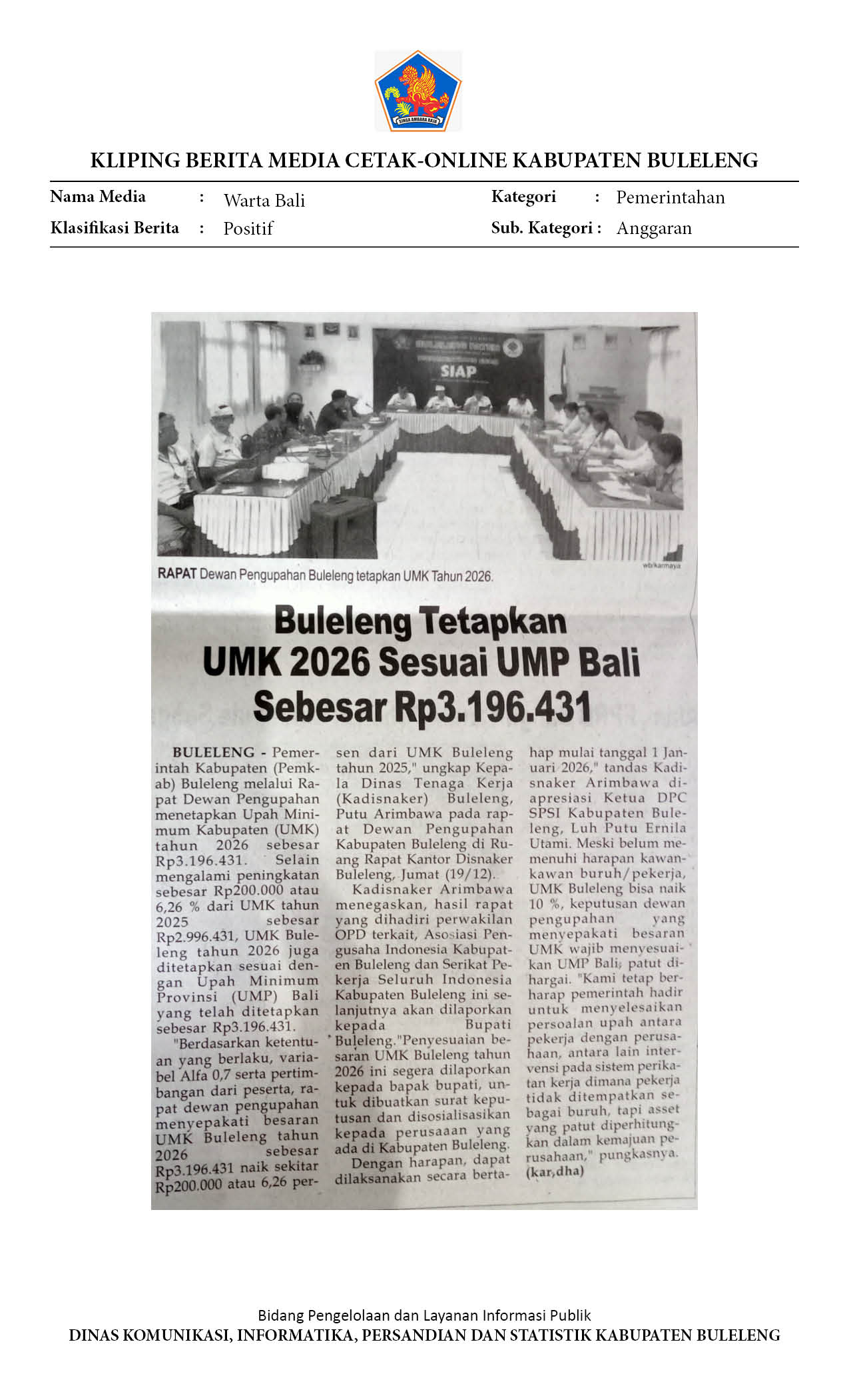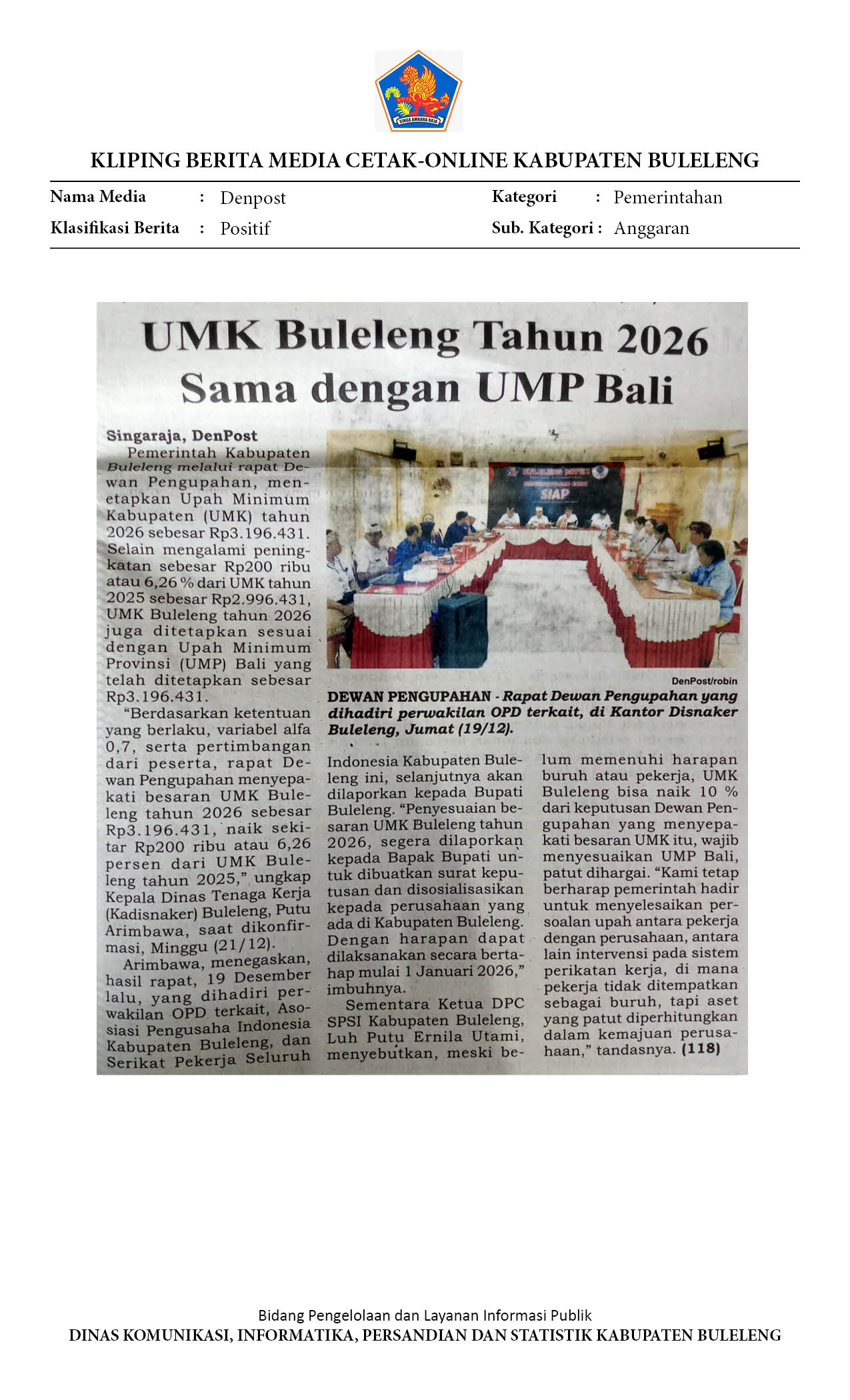 BULELENG TETAPKAN UMK 2026 SESUAI UMP BALI SEBESAR RP 3.196.431