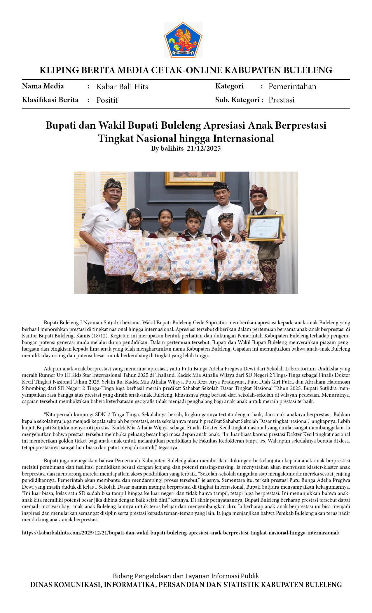 BUPATI DAN WAKIL BUPATI BULELENG APRESIASI ANAK BERPRESTASI TINGKAT NASIONAL HINGGA INTERNASIONAL