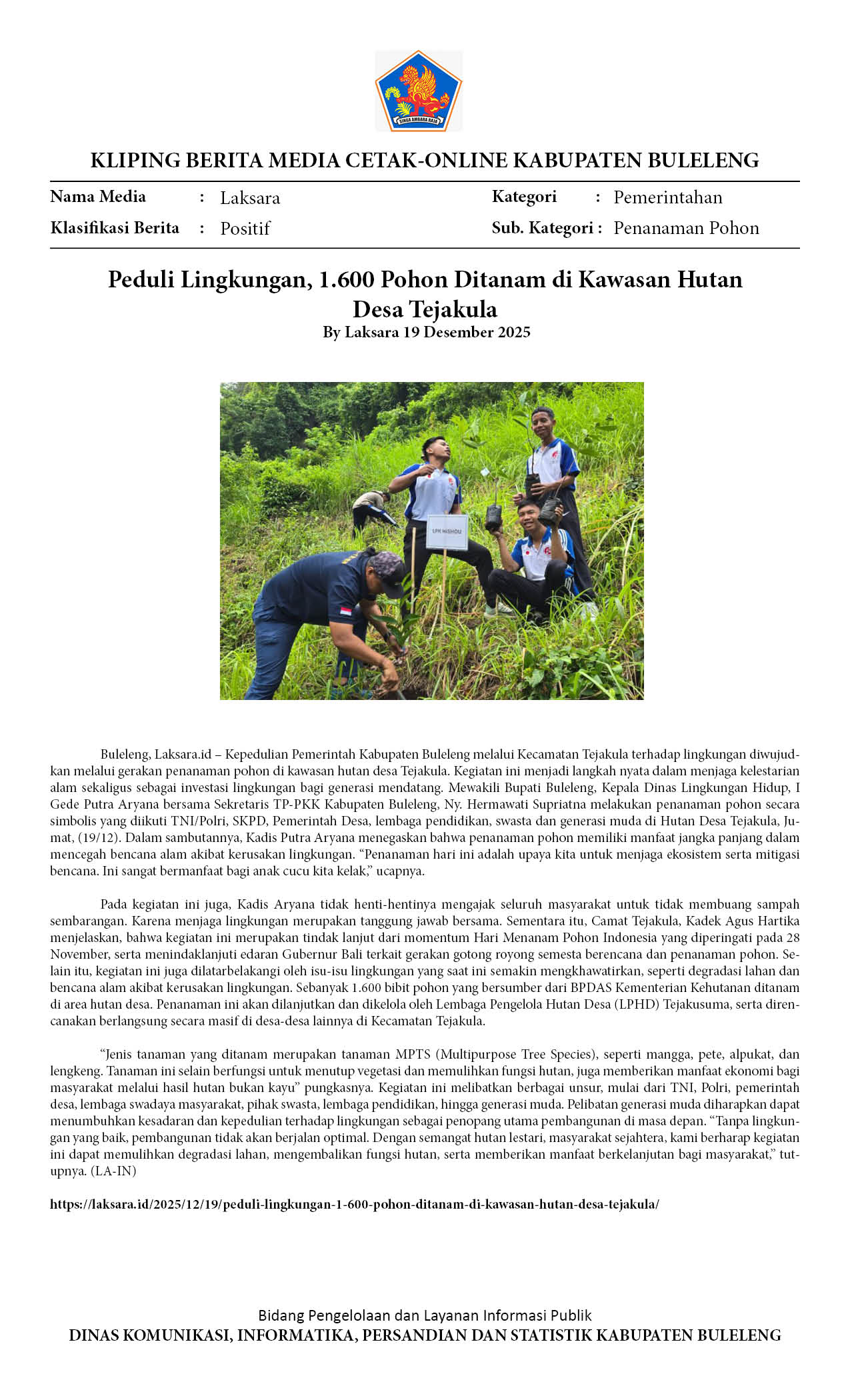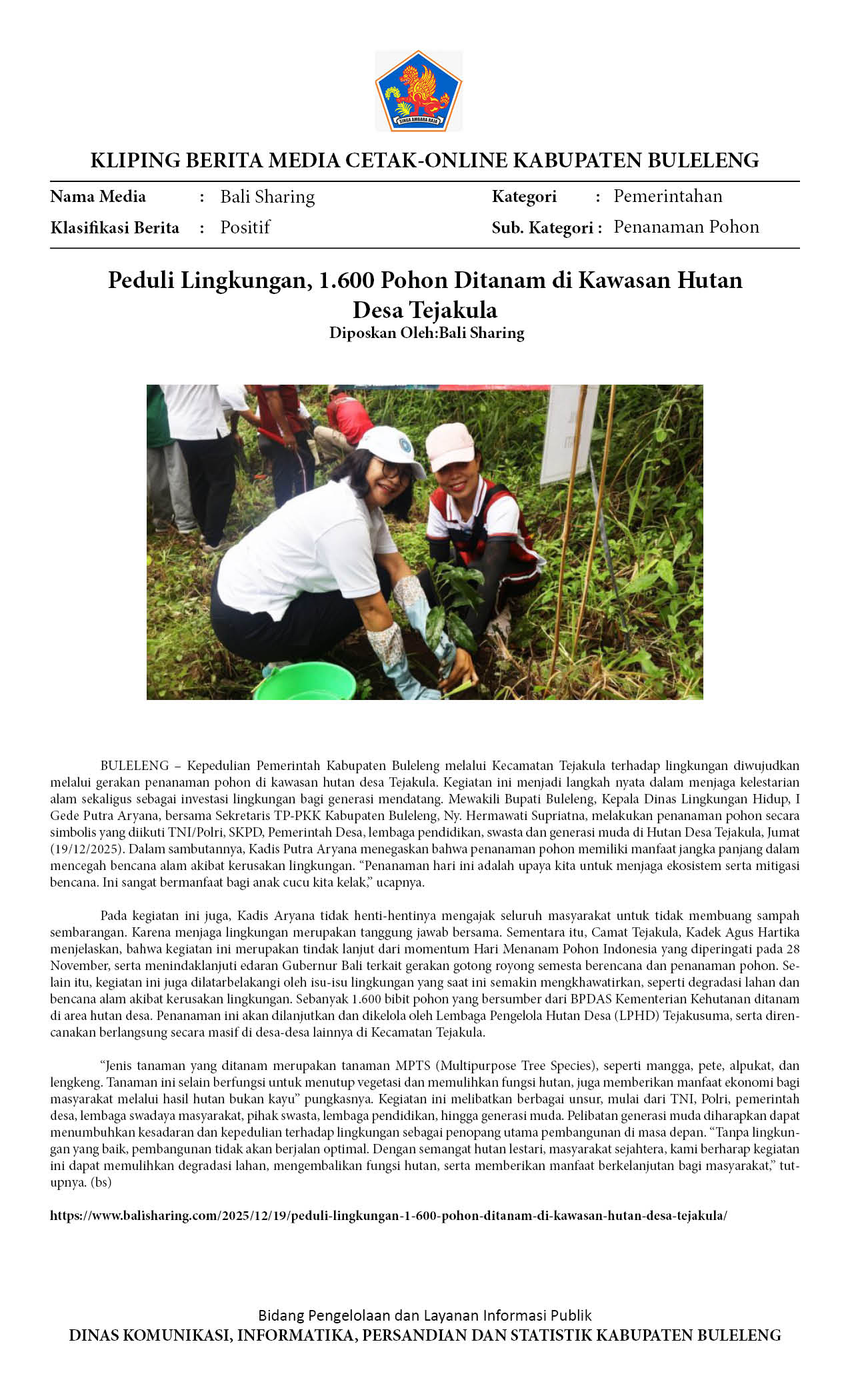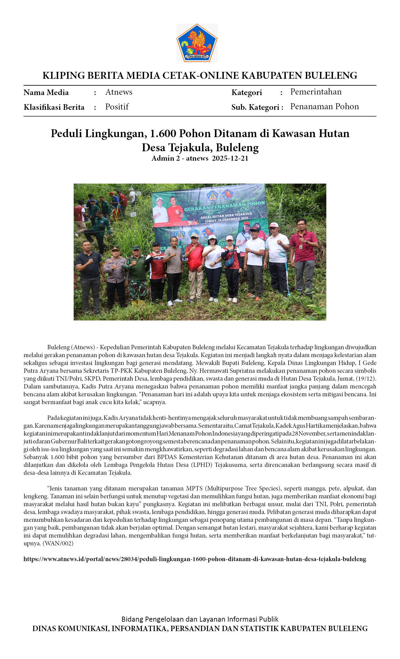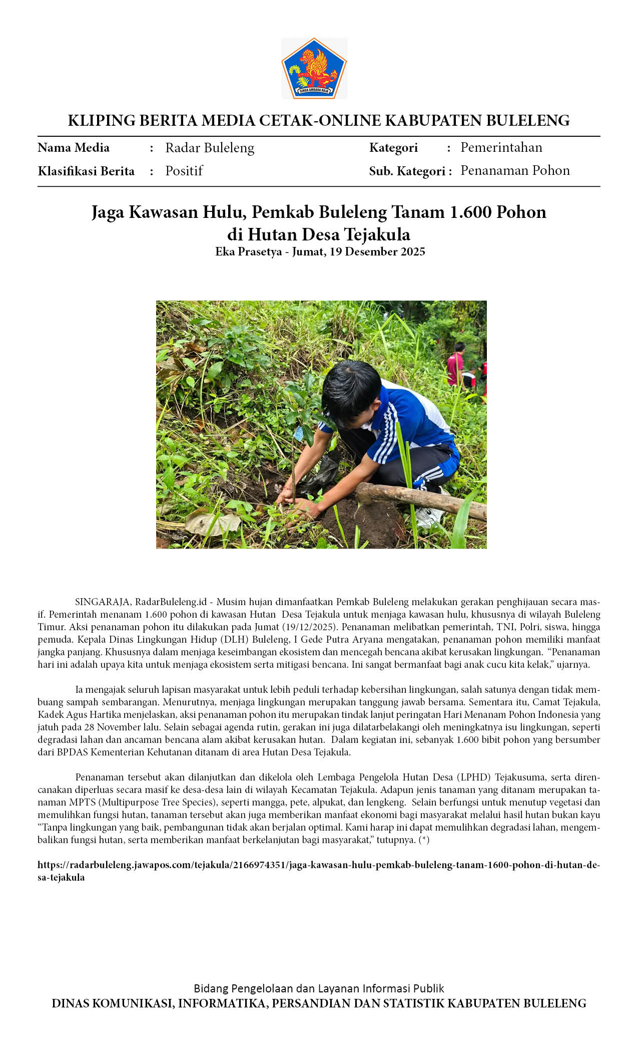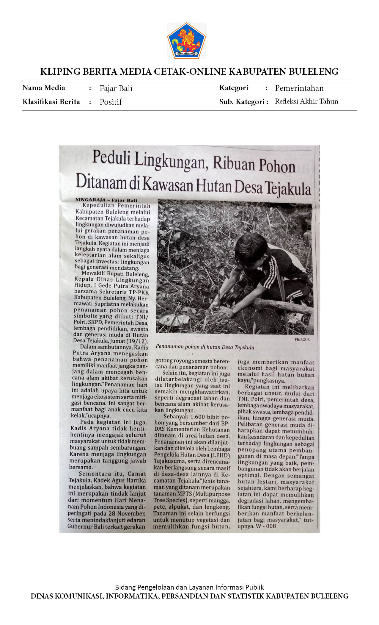 JAGA KAWASAN HULU, PEMKAB BULELENG TANAM 1.600 POHON DI HUTAN DESA TEJAKULA
