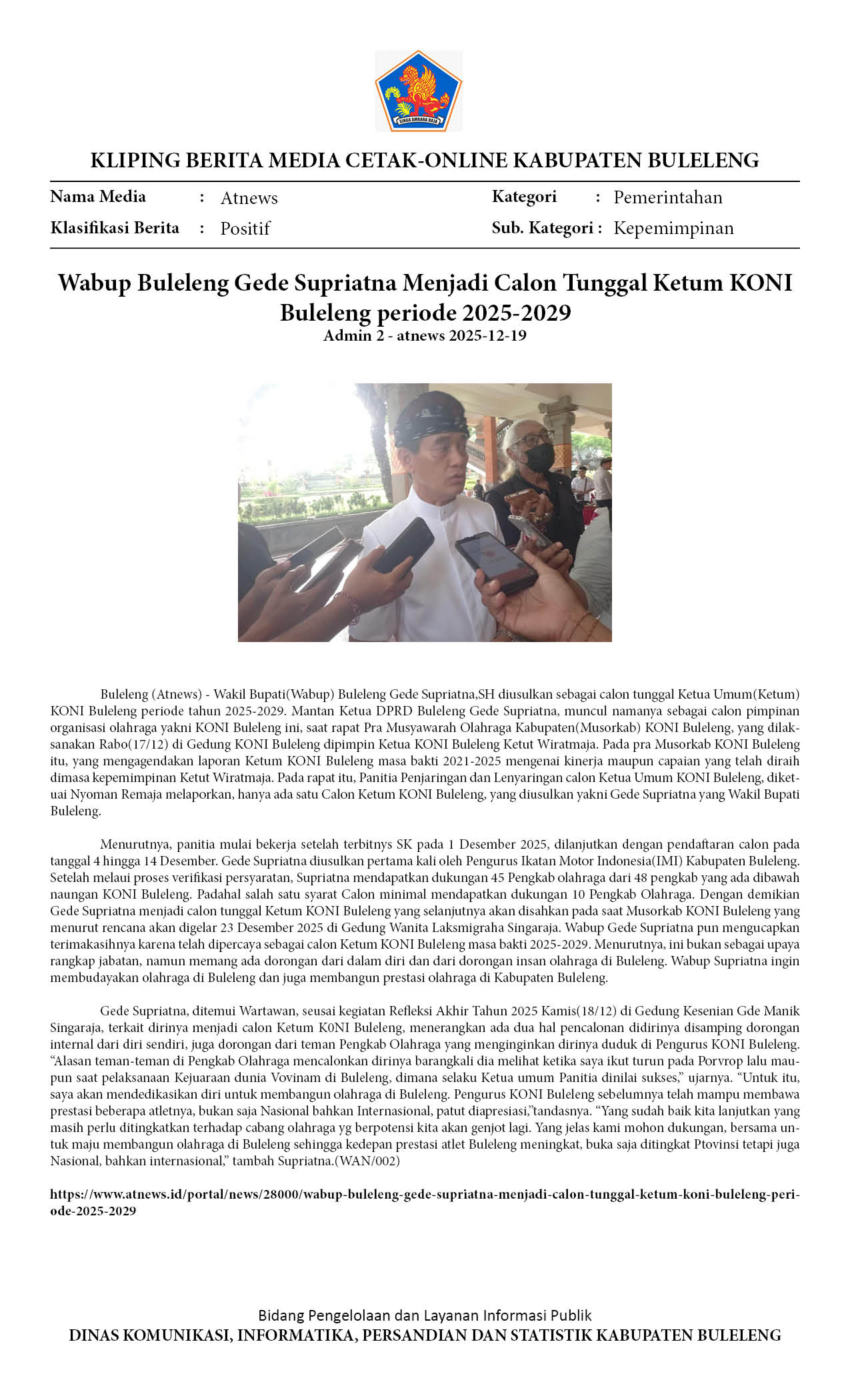 WABUP BULELENG GEDE SUPRIATNA MENJADI CALON TUNGGAL KETUM KONI BULELENG PERIODE 2025-2029