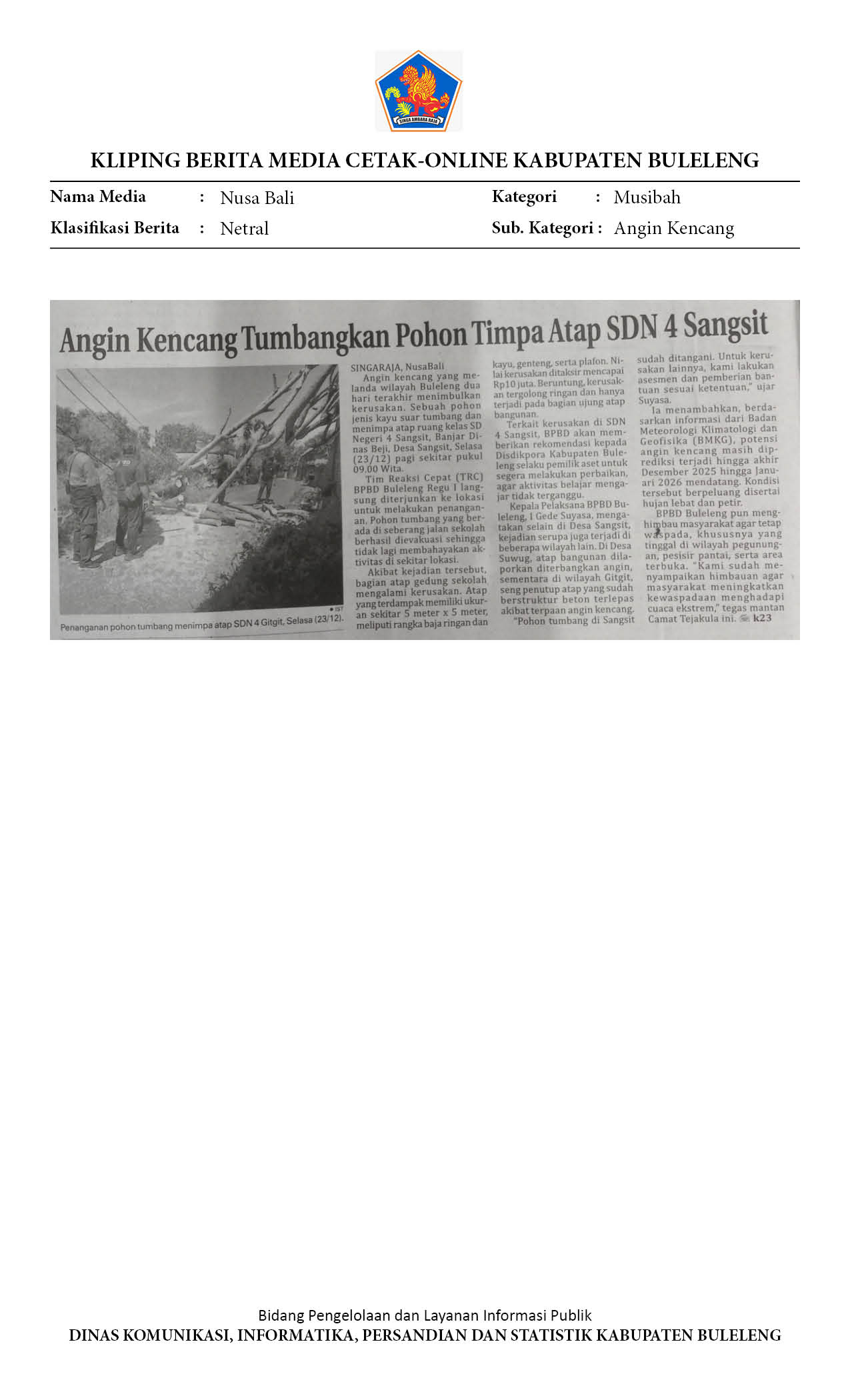 ANGIN KENCANG TUMBANGKAN POHON TIMPA ATAP SDN 4 SANGSIT