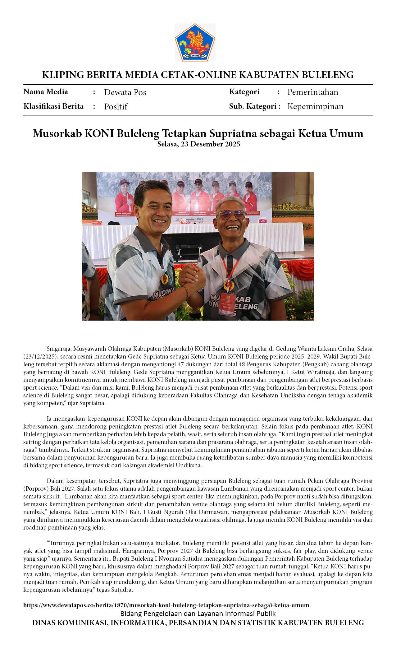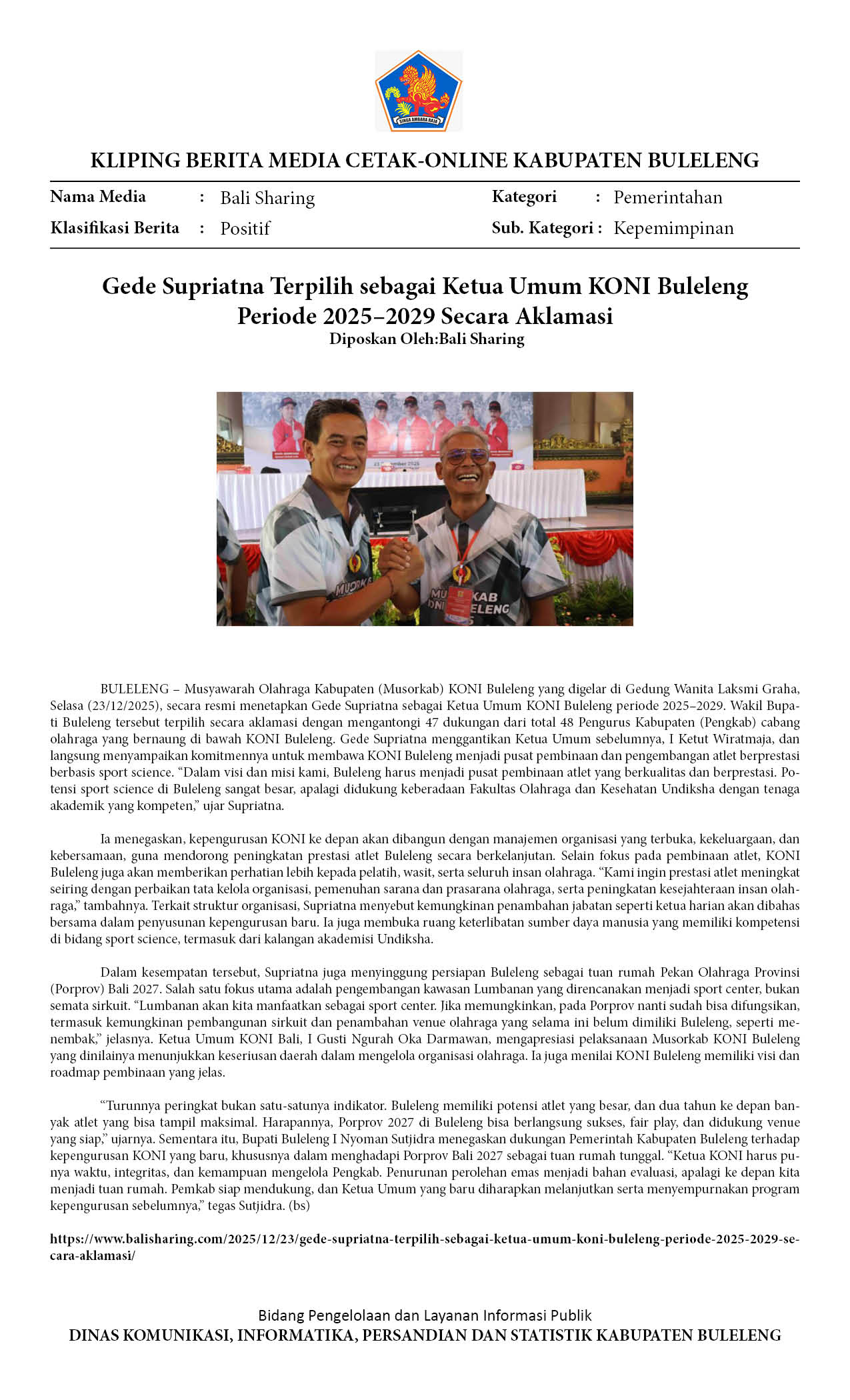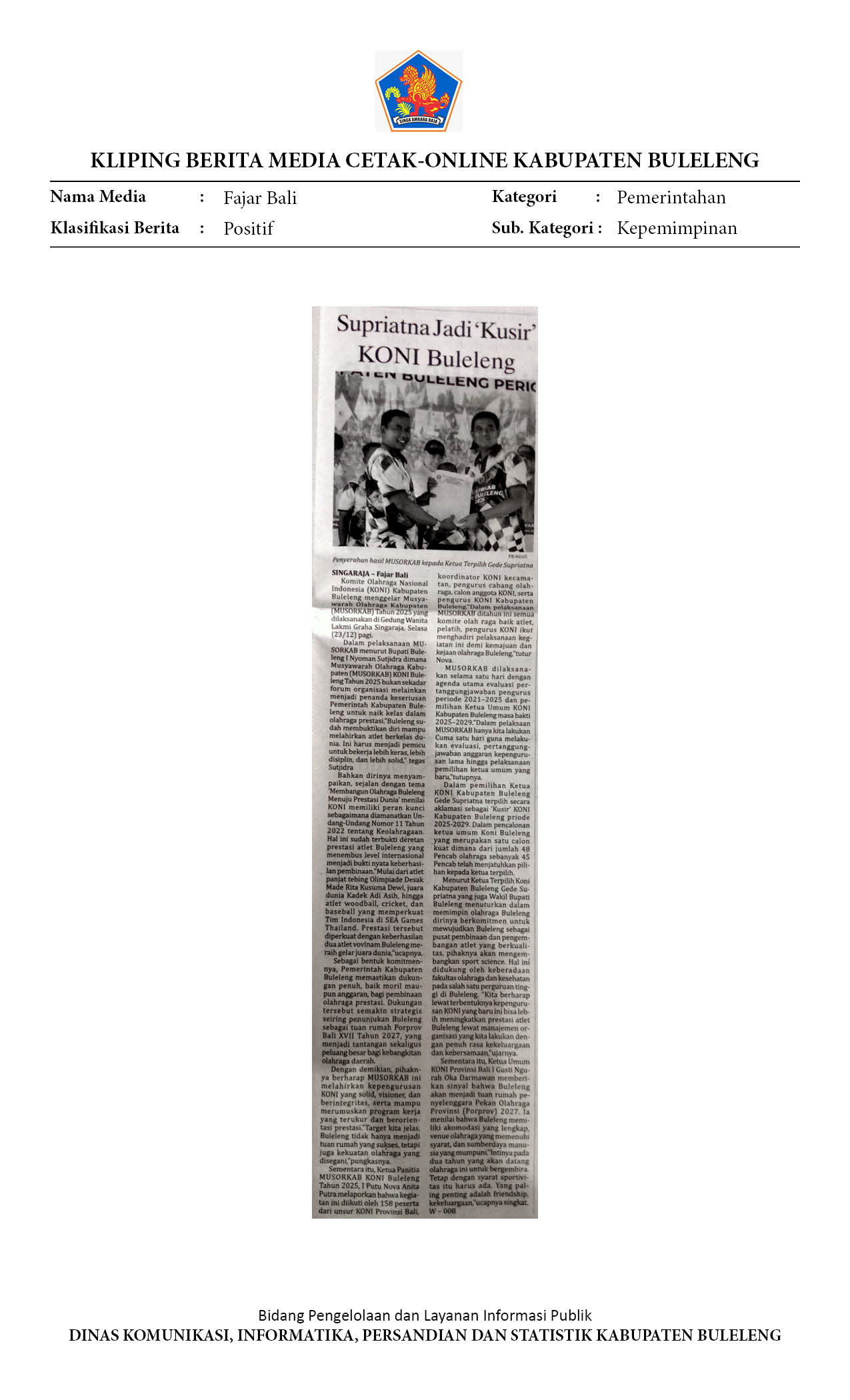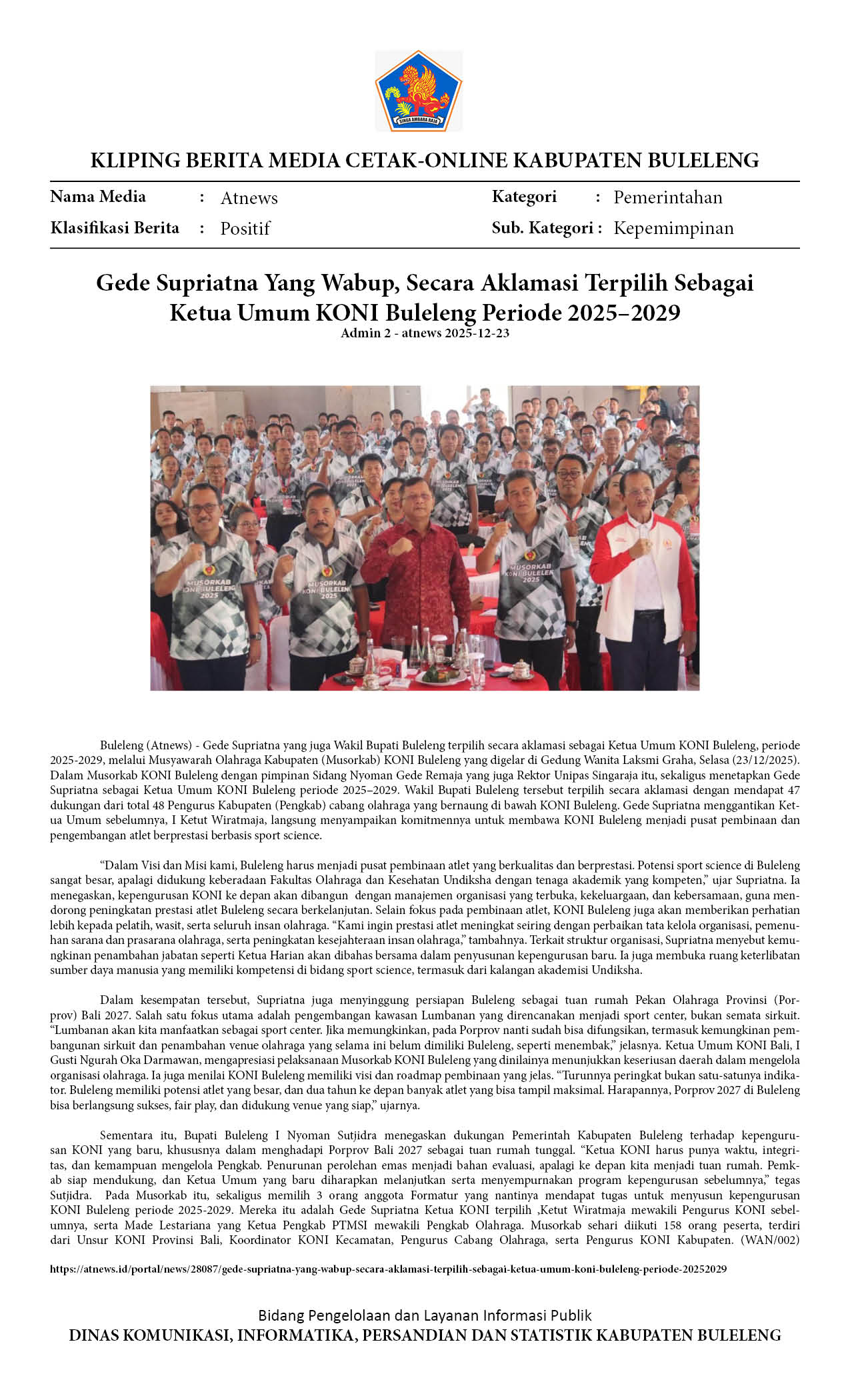 GEDE SUPRIATNA TERPILIH SEBAGAI KETUA UMUM KONI BULELENG PERIODE 2025–2029 SECARA AKLAMASI