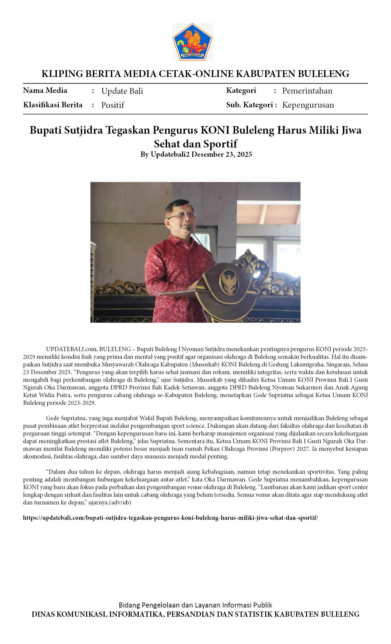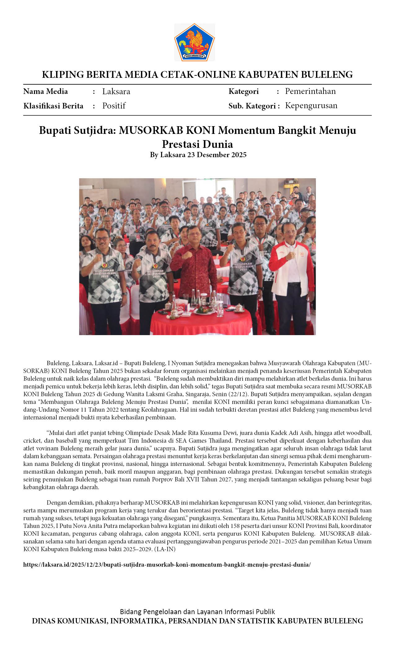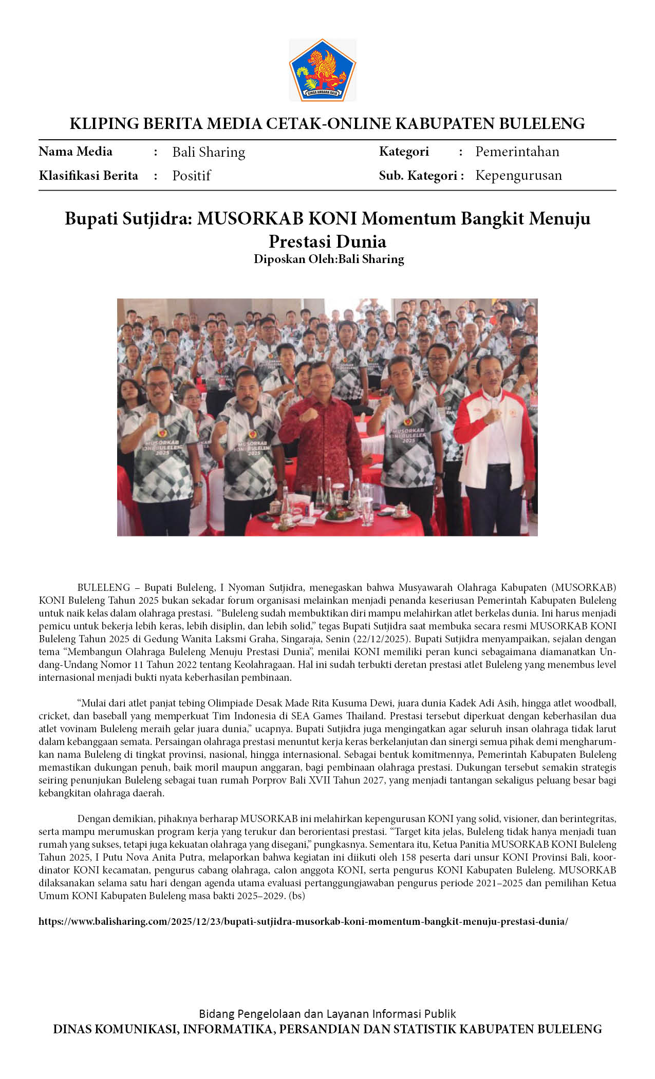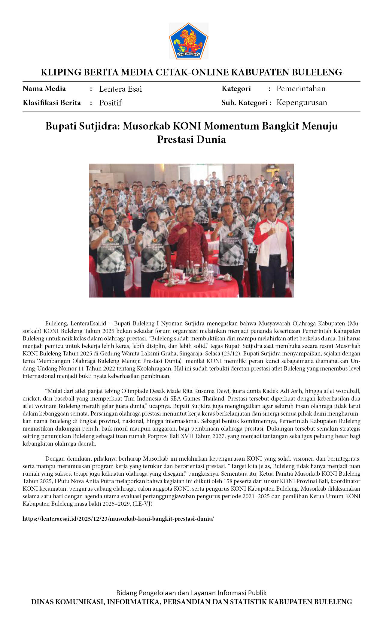GEDE SUPRIATNA TERPILIH SEBAGAI KETUA UMUM KONI BULELENG PERIODE 2025–2029 SECARA AKLAMASI